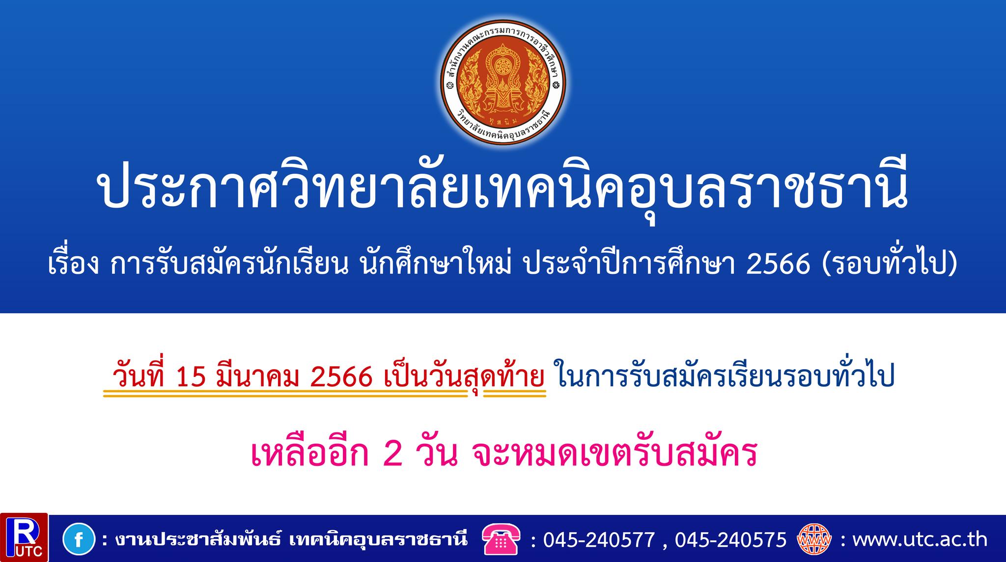 วันที่ 15 มีนาคม 2566 เป็นวันสุดท้าย ในการรับสมัครเรียนรอบทั่วไป