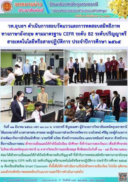 วท.อุบลฯ ดำเนินการทดสอบสมิทธิภาพทางภาษาอังกฤษ ตามมาตรฐาน CEFR ระดับ B2 ระดับปริญญาตรีสายเทคโนโลยีหรือสายปฏิบัติการ ประจำปีการศึกษา ๒๕๖๕