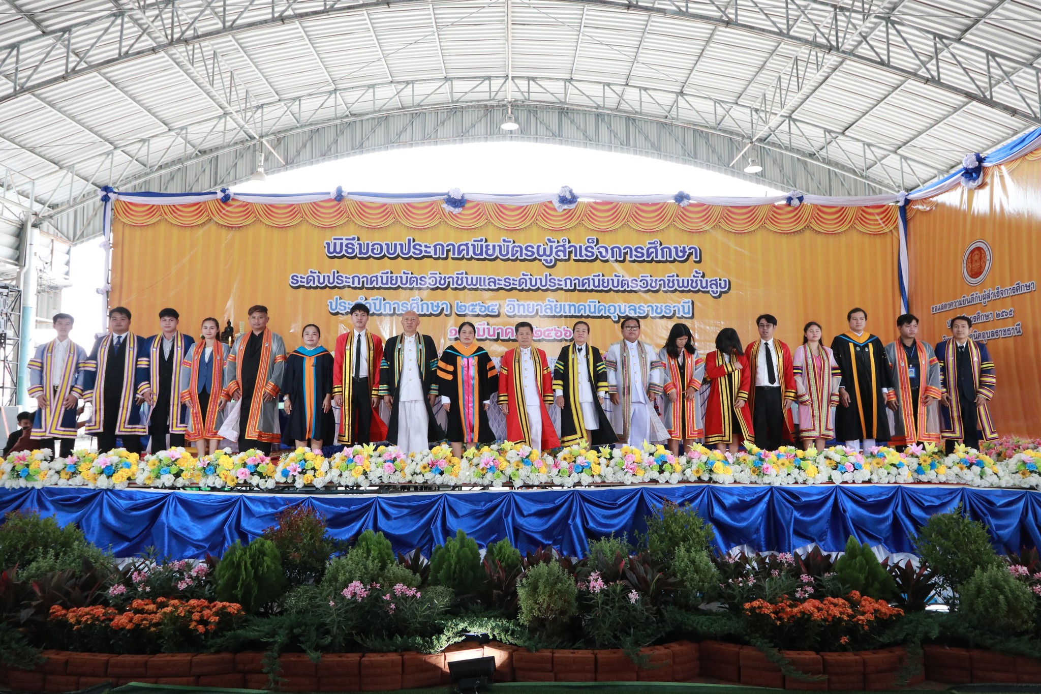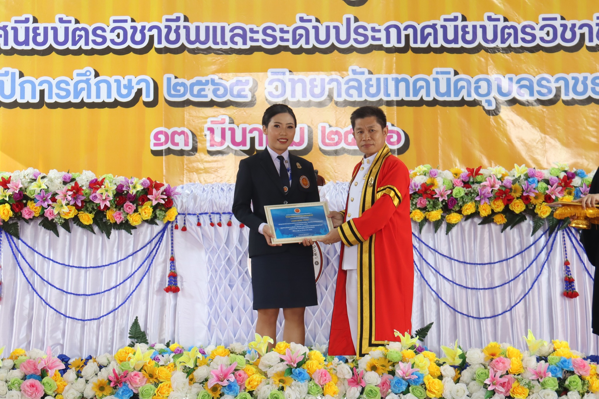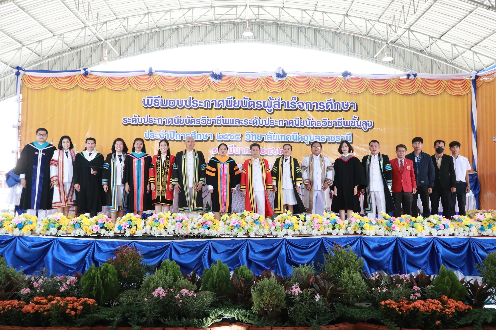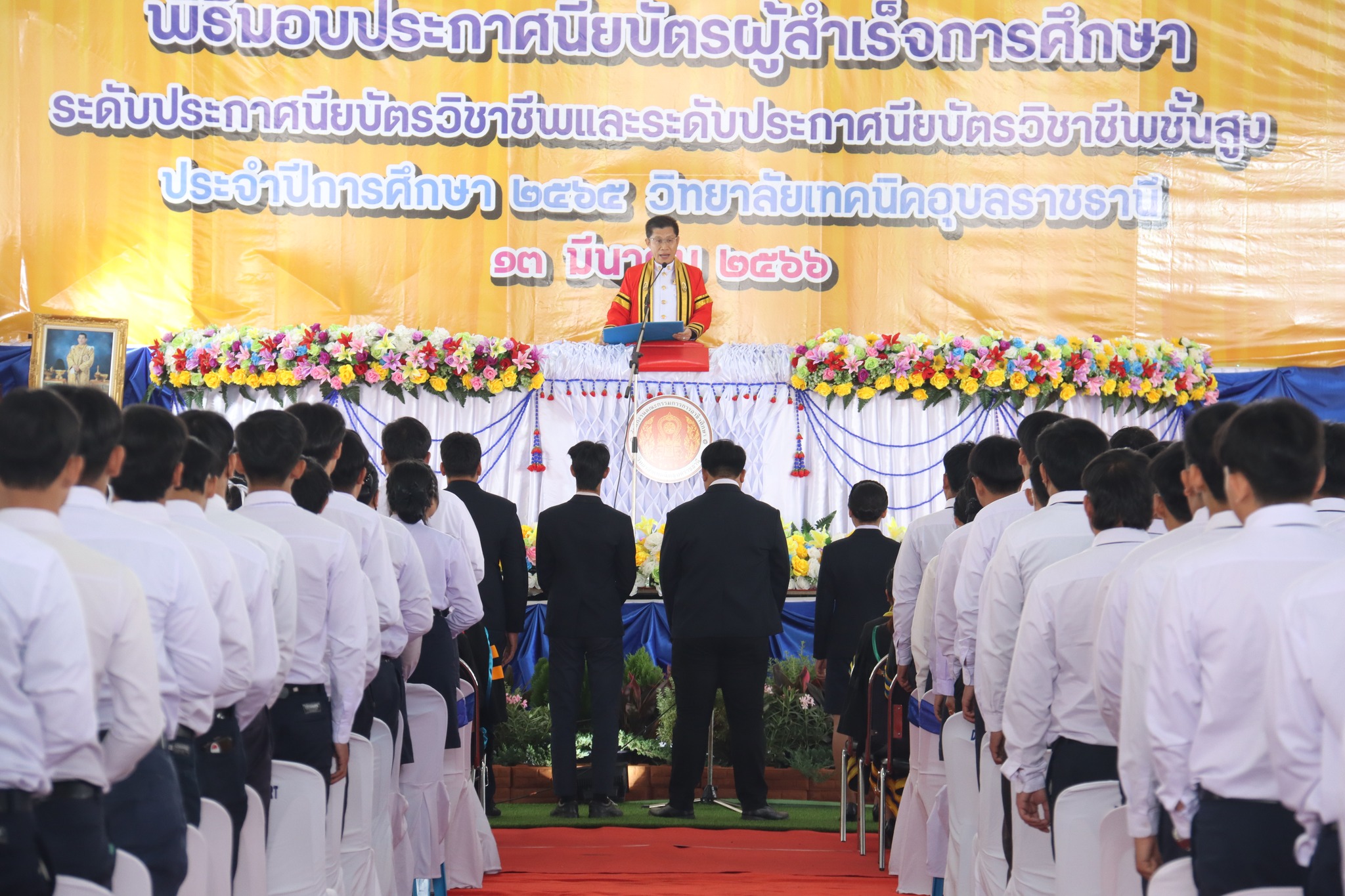 วันที่ ๑๓ มีนาคม ๒๕๖๖ เวลา ๐๘.๐๐ น. นายธาตรี พิบูลมณฑาผู้อำนวยการวิทยาลัยเทคนิคอุบลราชธานี ให้เกียรติเป็นประธานในพิธีมอบประกาศนียบัตรแก่ผู้สำเร็จการศึกษาระดับประกาศนียบัตรวิชาชีพ และระดับประกาศนียบัตรวิชาชีพชั้นสูง ประจำปีการศึกษา ๒๕๖๕ ณ หอประชุมโดมใหญ่ วิทยาลัยเทคนิคอุบลราชธานี โดยมี นางสาวสายฝน สาระผล รองผู้อำนวยการฝ่ายบริหารทรัพยากร เป็นผู้กล่าวรายงานในพิธี ในการนี้มี นางราตรี สะดีวงศ์ รองผู้อำนวยการฝ่ายแผนงานและความร่วมมือ นายไวพจน์ ศรีธัญ รองผู้อำนวยการฝ่ายพัฒนากิจการนักเรียนนักศึกษา นายสุวิชา มั่นยืน รองผู้อำนวยการฝ่ายวิชาการ พร้อมด้วยคณะหัวหน้าแผนกวิชา หัวหน้างาน ครู และบุคลากรทางการศึกษา นำนักเรียน นักศึกษา ระดับชั้นปวช.๓ และปวส.๒ เข้าร่วมพิธีอย่างพร้อมเพรียง ทั้งนี้เพื่อแสดงความยินดี และยกย่องเชิดชูเกียรติแก่นักเรียน นักศึกษา ที่สำเร็จการศึกษาอีกด้วย