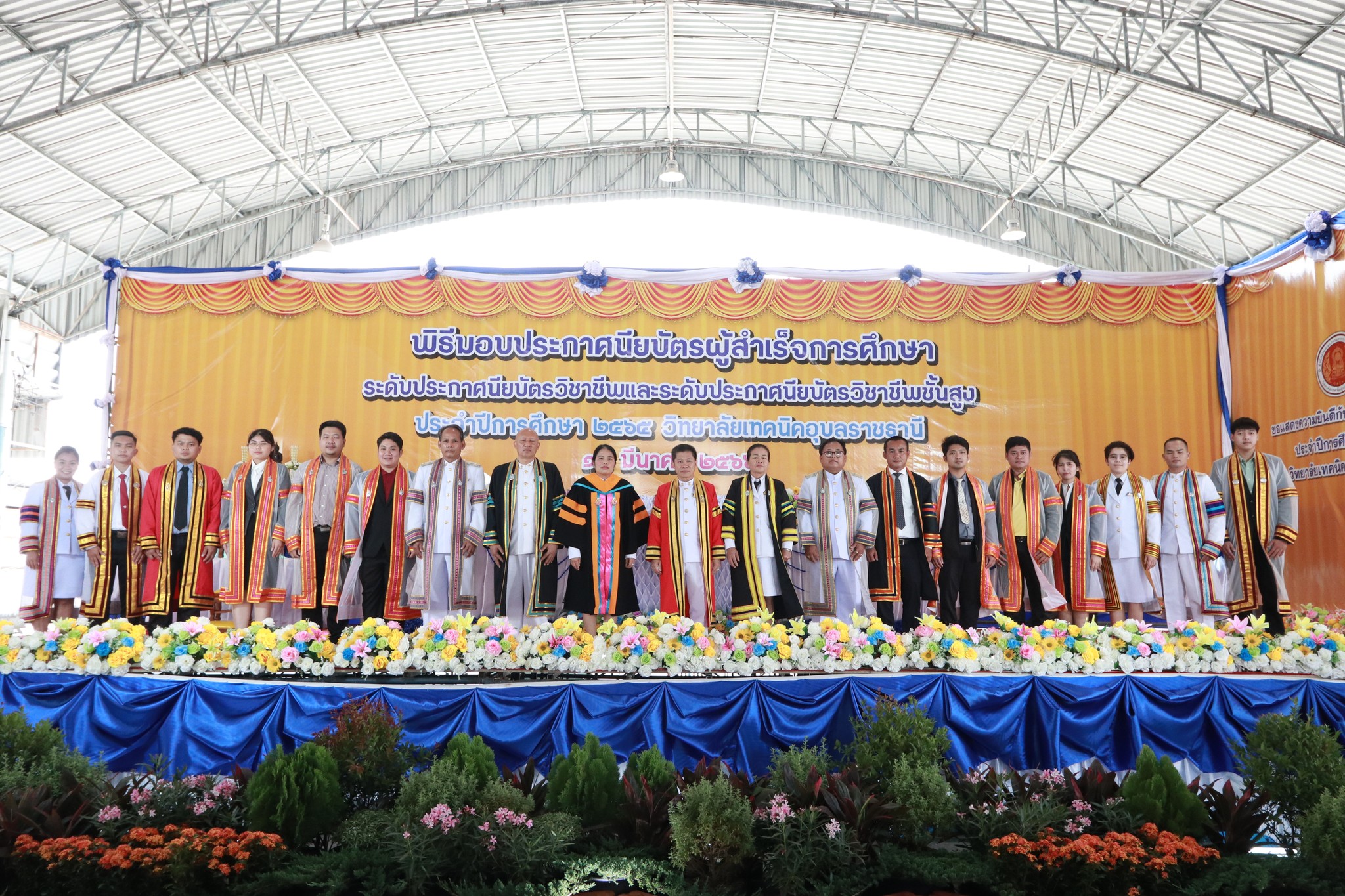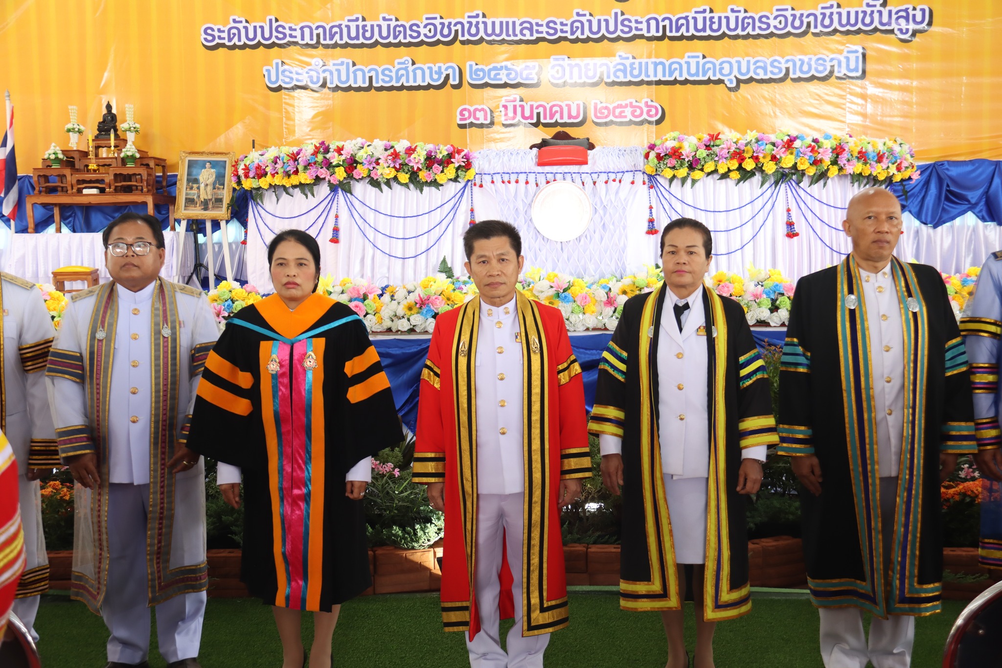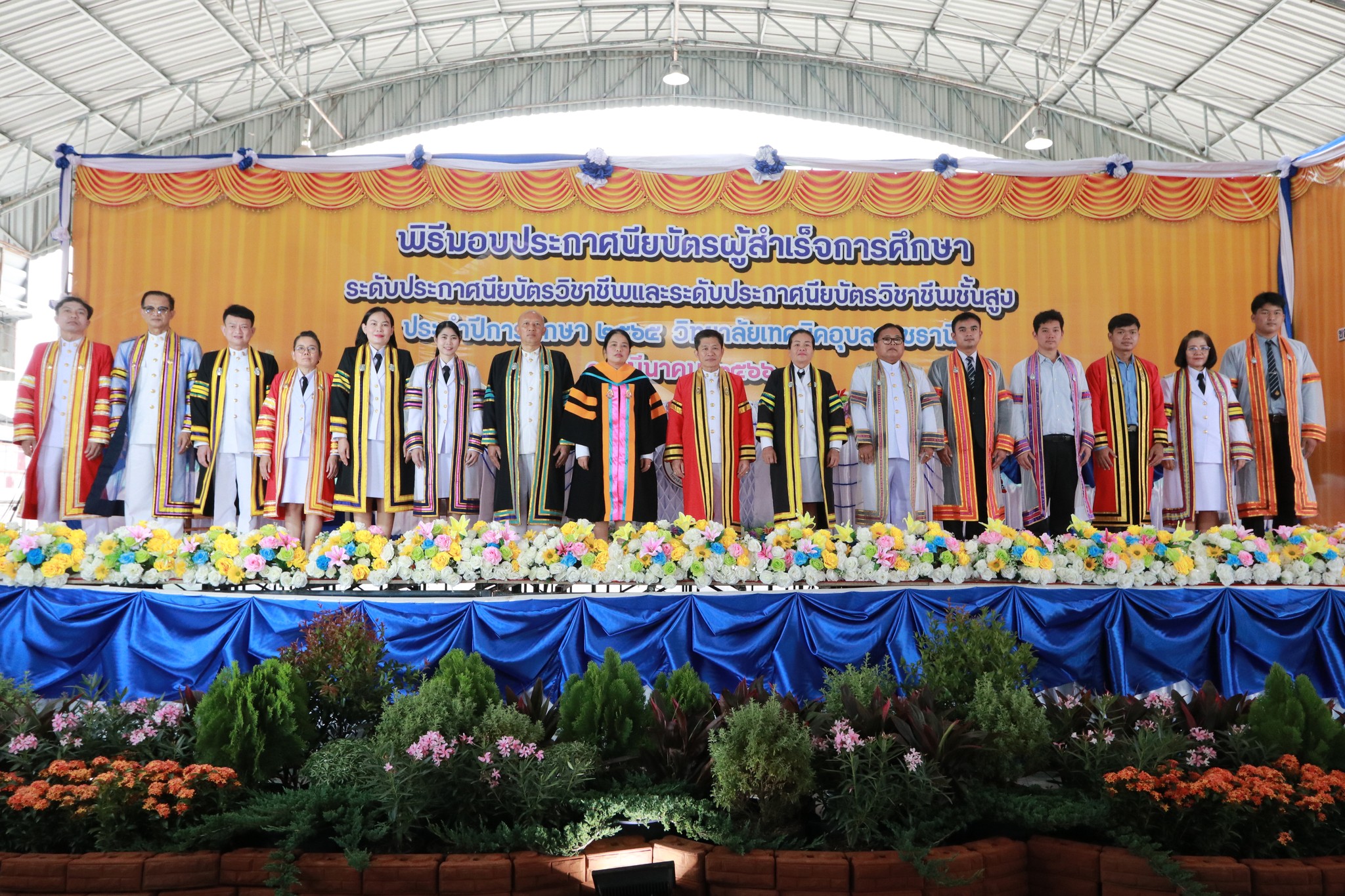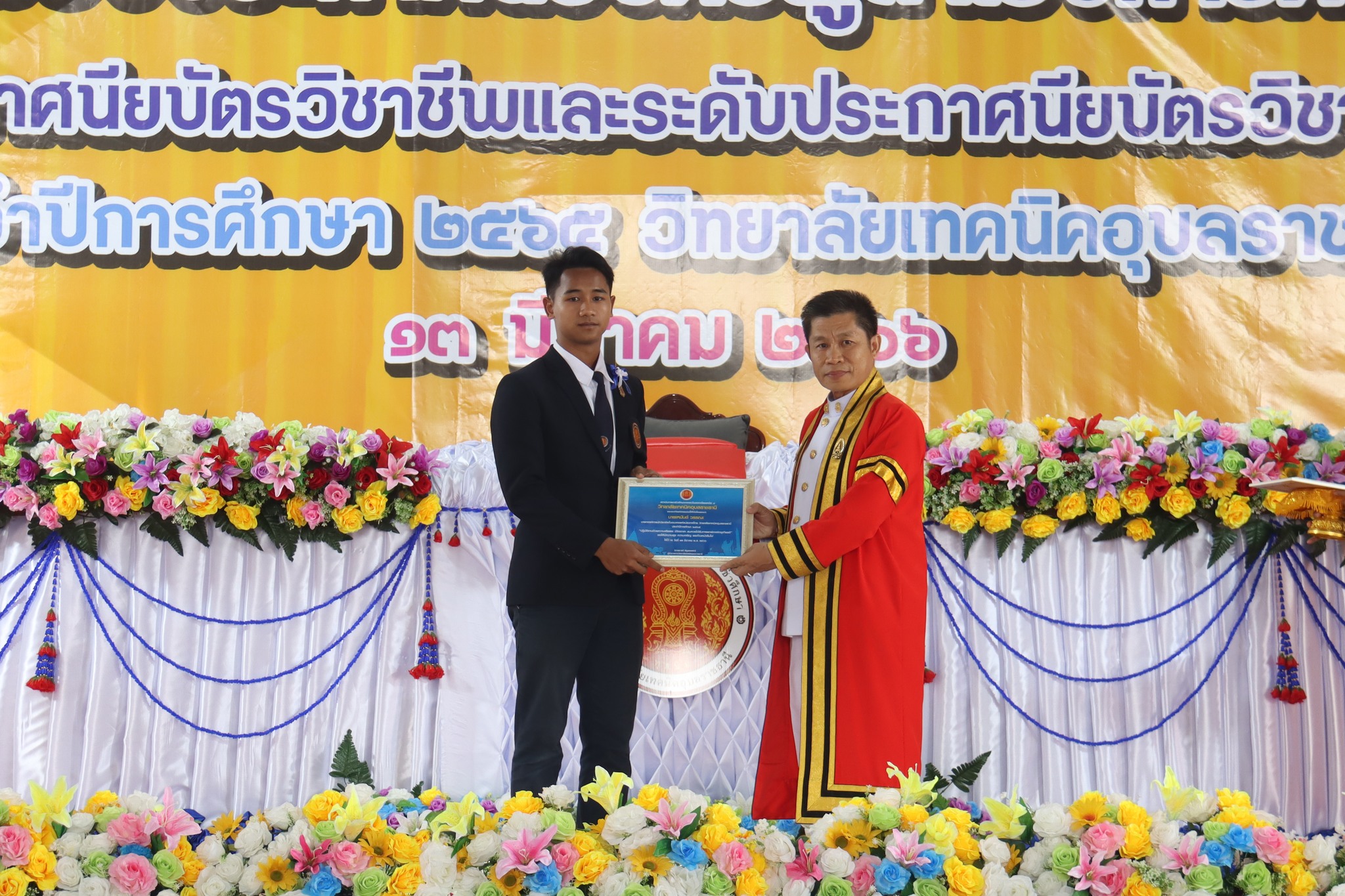 วันที่ ๑๓ มีนาคม ๒๕๖๖ เวลา ๐๘.๐๐ น. นายธาตรี พิบูลมณฑาผู้อำนวยการวิทยาลัยเทคนิคอุบลราชธานี ให้เกียรติเป็นประธานในพิธีมอบประกาศนียบัตรแก่ผู้สำเร็จการศึกษาระดับประกาศนียบัตรวิชาชีพ และระดับประกาศนียบัตรวิชาชีพชั้นสูง ประจำปีการศึกษา ๒๕๖๕ ณ หอประชุมโดมใหญ่ วิทยาลัยเทคนิคอุบลราชธานี โดยมี นางสาวสายฝน สาระผล รองผู้อำนวยการฝ่ายบริหารทรัพยากร เป็นผู้กล่าวรายงานในพิธี ในการนี้มี นางราตรี สะดีวงศ์ รองผู้อำนวยการฝ่ายแผนงานและความร่วมมือ นายไวพจน์ ศรีธัญ รองผู้อำนวยการฝ่ายพัฒนากิจการนักเรียนนักศึกษา นายสุวิชา มั่นยืน รองผู้อำนวยการฝ่ายวิชาการ พร้อมด้วยคณะหัวหน้าแผนกวิชา หัวหน้างาน ครู และบุคลากรทางการศึกษา นำนักเรียน นักศึกษา ระดับชั้นปวช.๓ และปวส.๒ เข้าร่วมพิธีอย่างพร้อมเพรียง ทั้งนี้เพื่อแสดงความยินดี และยกย่องเชิดชูเกียรติแก่นักเรียน นักศึกษา ที่สำเร็จการศึกษาอีกด้วย