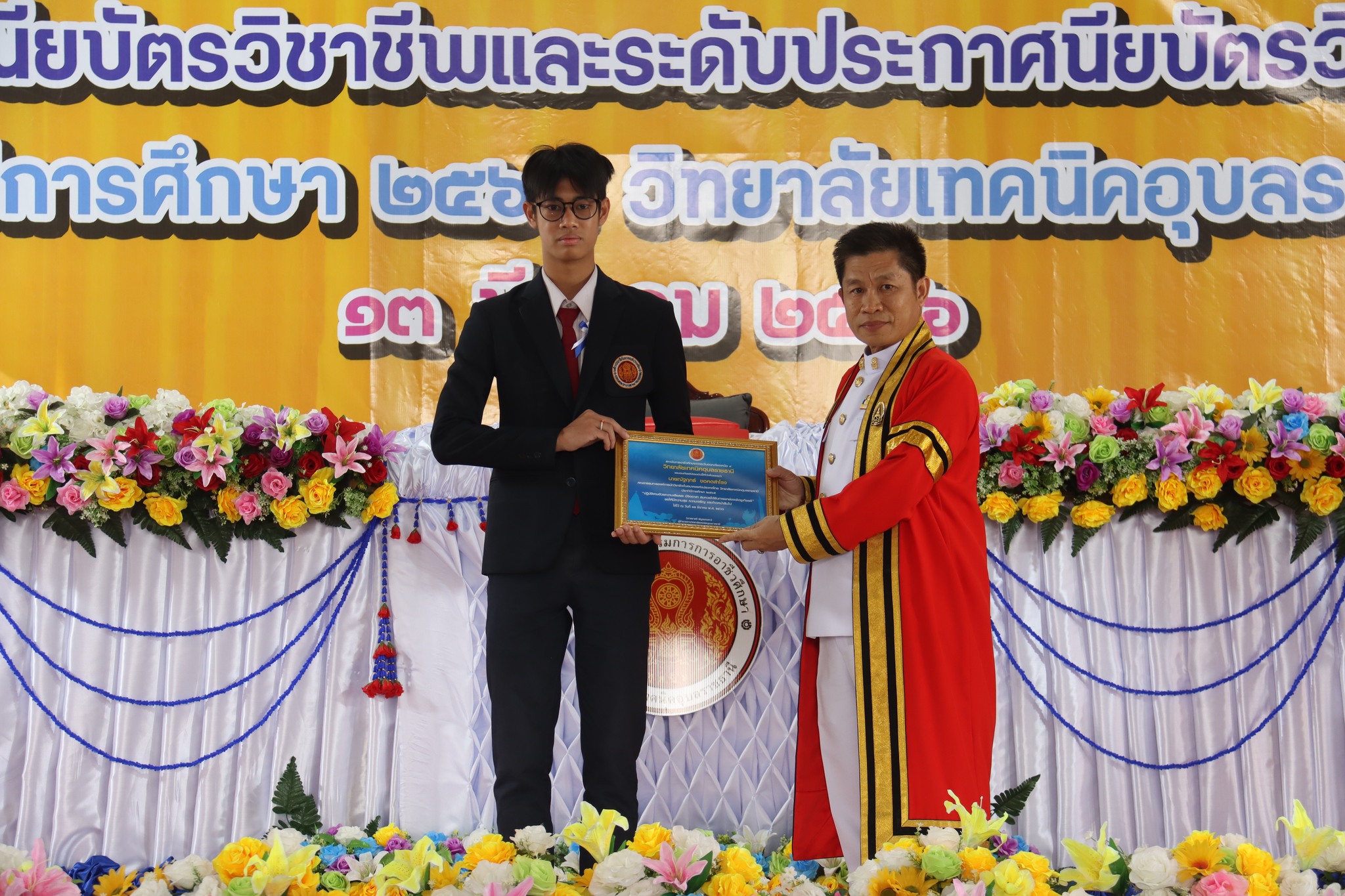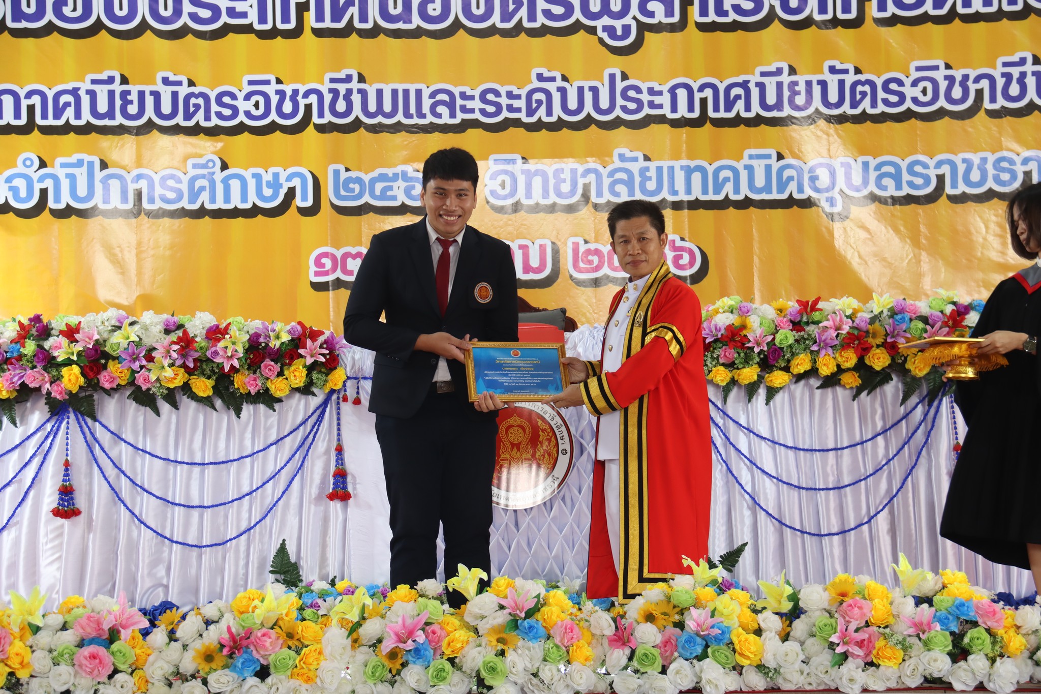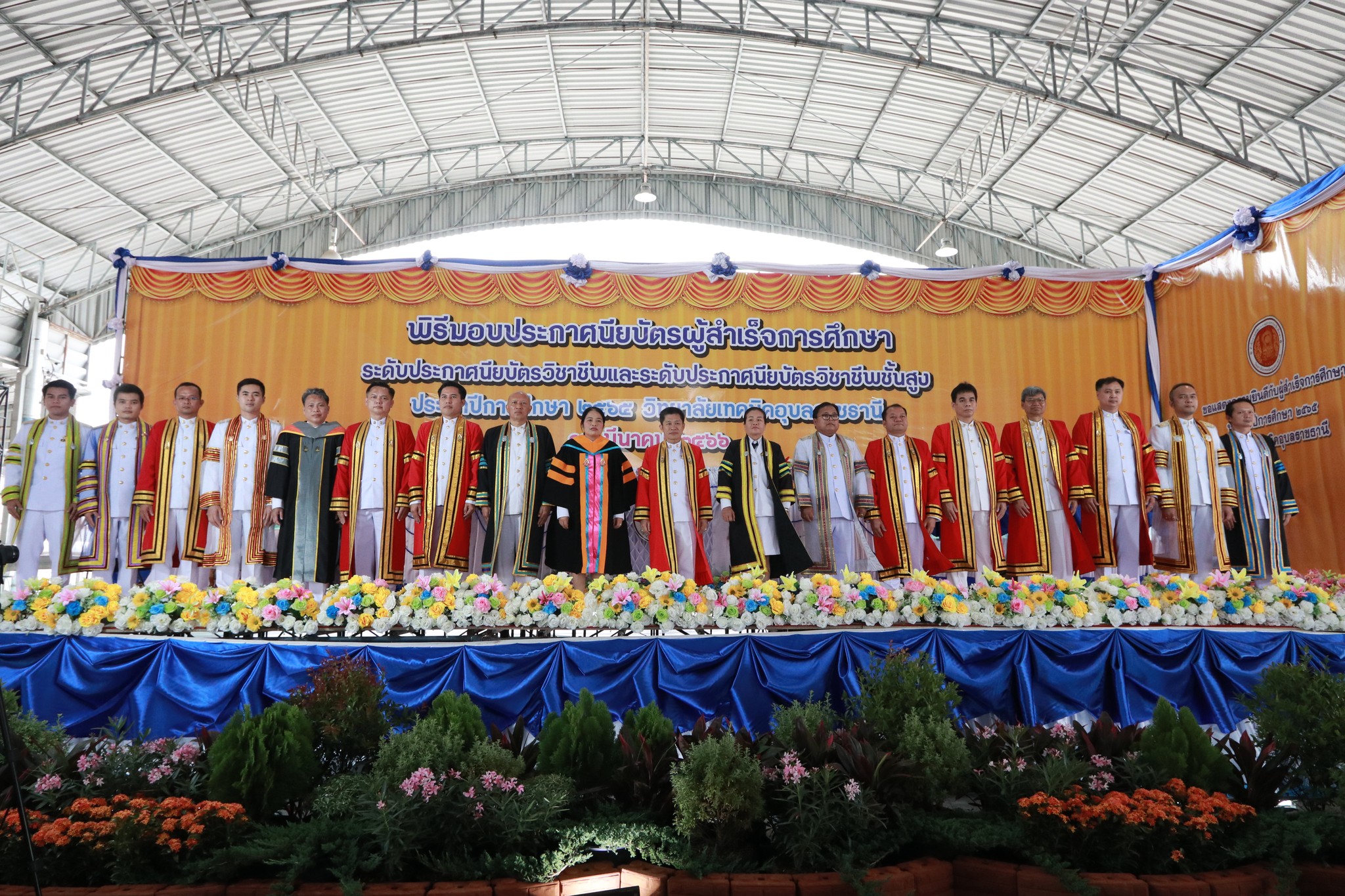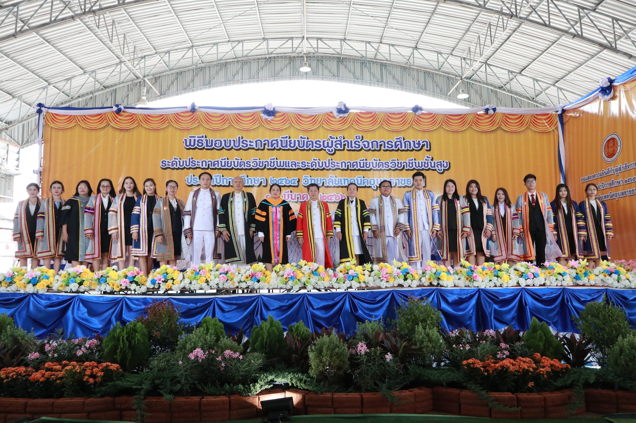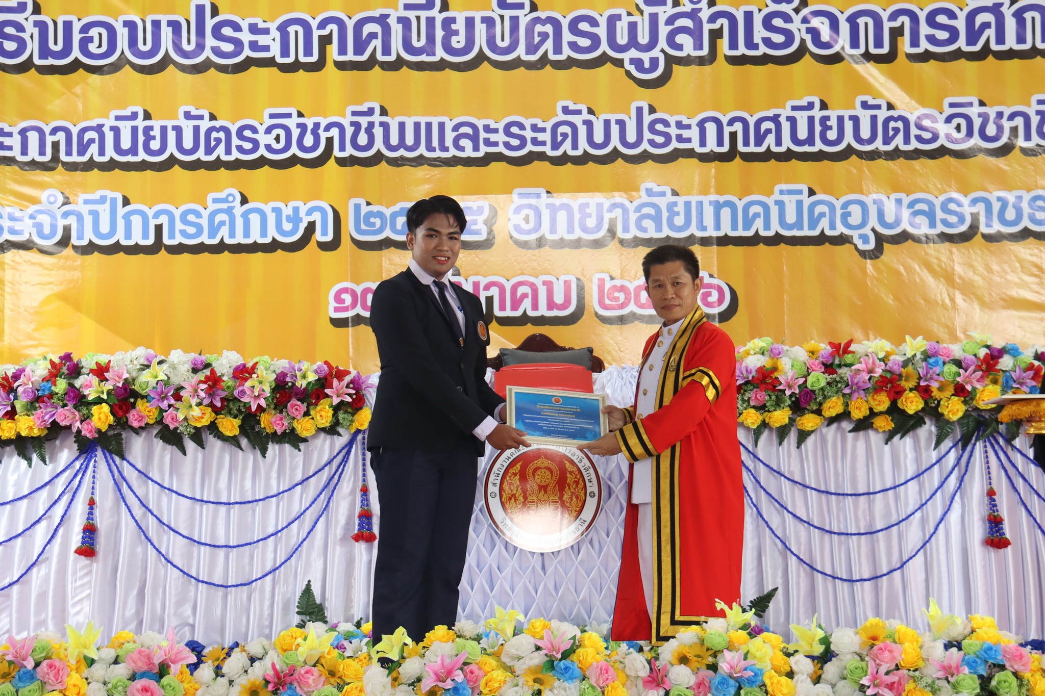 วันที่ ๑๓ มีนาคม ๒๕๖๖ เวลา ๐๘.๐๐ น. นายธาตรี พิบูลมณฑาผู้อำนวยการวิทยาลัยเทคนิคอุบลราชธานี ให้เกียรติเป็นประธานในพิธีมอบประกาศนียบัตรแก่ผู้สำเร็จการศึกษาระดับประกาศนียบัตรวิชาชีพ และระดับประกาศนียบัตรวิชาชีพชั้นสูง ประจำปีการศึกษา ๒๕๖๕ ณ หอประชุมโดมใหญ่ วิทยาลัยเทคนิคอุบลราชธานี โดยมี นางสาวสายฝน สาระผล รองผู้อำนวยการฝ่ายบริหารทรัพยากร เป็นผู้กล่าวรายงานในพิธี ในการนี้มี นางราตรี สะดีวงศ์ รองผู้อำนวยการฝ่ายแผนงานและความร่วมมือ นายไวพจน์ ศรีธัญ รองผู้อำนวยการฝ่ายพัฒนากิจการนักเรียนนักศึกษา นายสุวิชา มั่นยืน รองผู้อำนวยการฝ่ายวิชาการ พร้อมด้วยคณะหัวหน้าแผนกวิชา หัวหน้างาน ครู และบุคลากรทางการศึกษา นำนักเรียน นักศึกษา ระดับชั้นปวช.๓ และปวส.๒ เข้าร่วมพิธีอย่างพร้อมเพรียง ทั้งนี้เพื่อแสดงความยินดี และยกย่องเชิดชูเกียรติแก่นักเรียน นักศึกษา ที่สำเร็จการศึกษาอีกด้วย