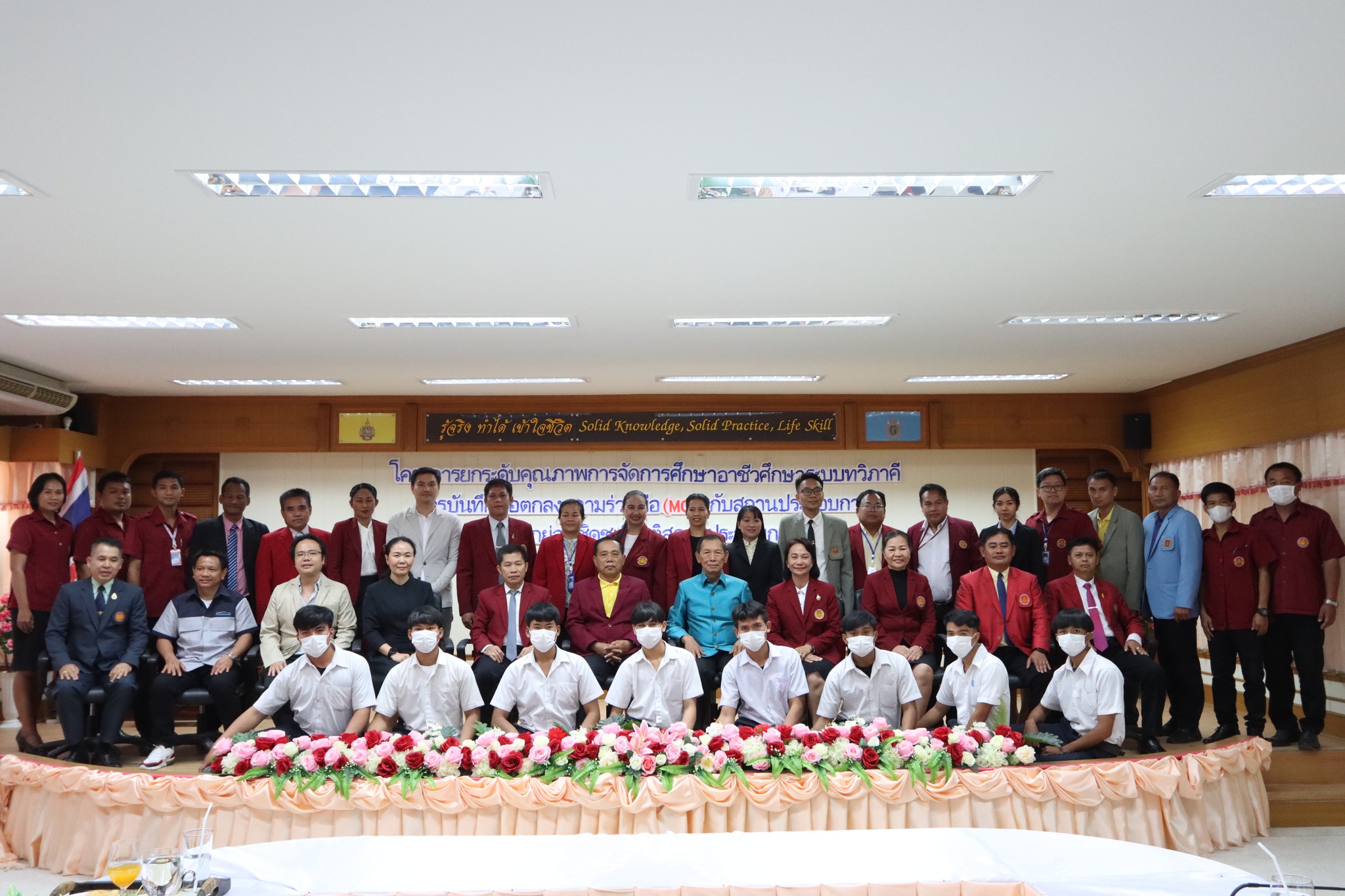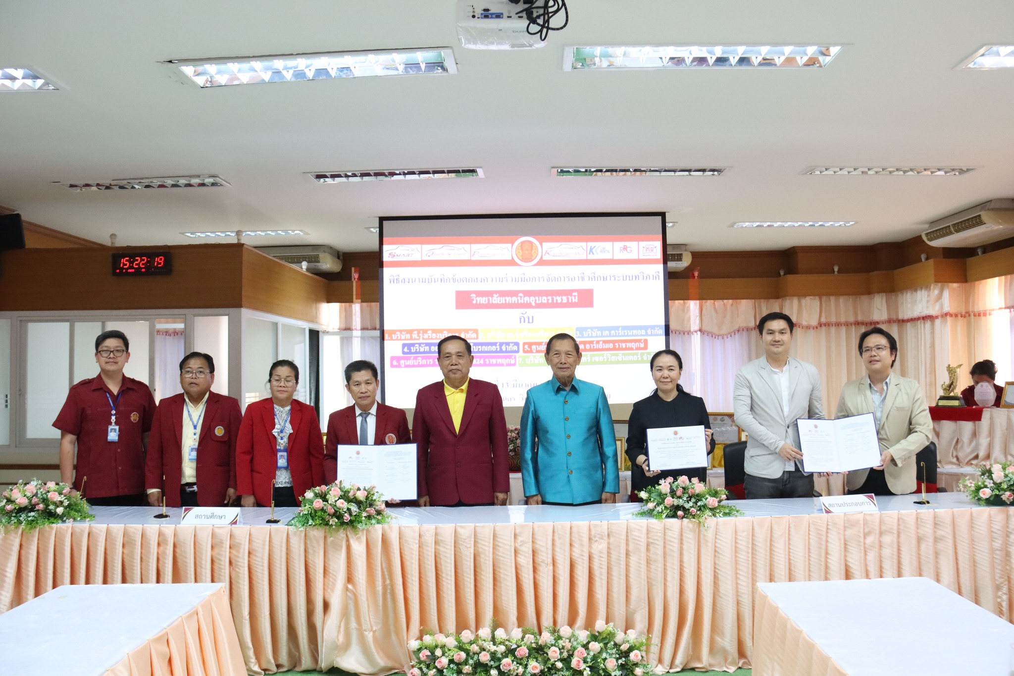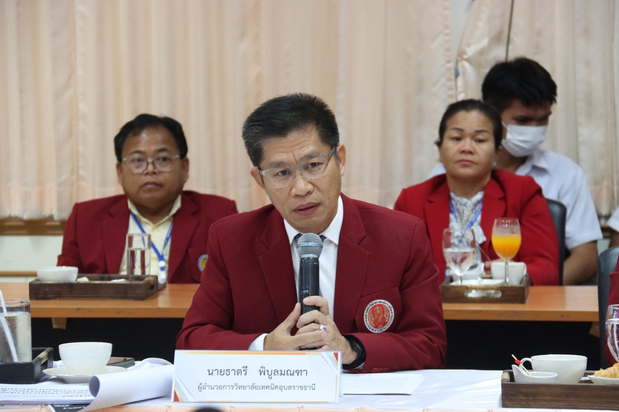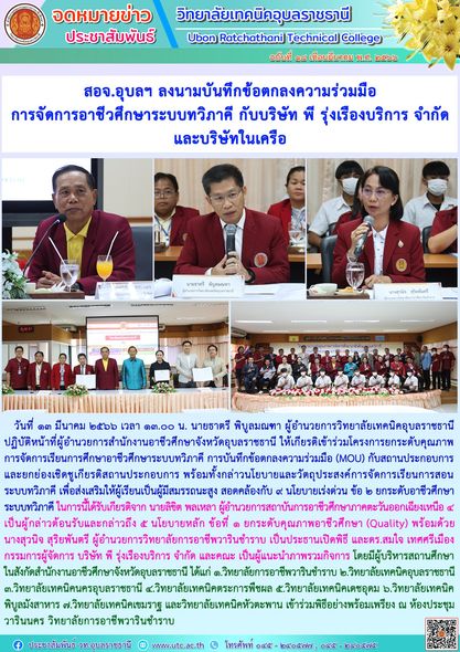 วันที่ ๑๓ มีนาคม ๒๕๖๖ เวลา ๑๓.๐๐ น. นายธาตรี พิบูลมณฑา ผู้อำนวยการวิทยาลัยเทคนิคอุบลราชธานีปฏิบัติหน้าที่ผู้อำนวยการสำนักงานอาชีวศึกษาจังหวัดอุบลราชธานี ให้เกียรติเข้าร่วมโครงการยกระดับคุณภาพการจัดการเรียนการศึกษาอาชีวศึกษาระบบทวิภาคี การบันทึกข้อตกลงความร่วมมือ (MOU) กับสถานประกอบการและยกย่องเชิดชูเกียรติสถานประกอบการ พร้อมทั้งกล่าวนโยบายและวัตถุประสงค์การจัดการเรียนการสอนระบบทวิภาคี เพื่อส่งเสริมให้ผู้เรียนเป็นผู้มีสมรรถนะสูง สอดคล้องกับ ๙ นโยบายเร่งด่วน ข้อ ๒ ยกระดับอาชีวศึกษาระบบทวิภาคี ในการนี้ได้รับเกียรติจาก นายลิขิต พลเหลา ผู้อำนวยการสถาบันการอาชีวศึกษาภาคตะวันออกเฉียงเหนือ ๔ เป็นผู้กล่าวต้อนรับและกล่าวถึง ๕ นโยบายหลัก ข้อที่ ๑ ยกระดับคุณภาพอาชีวศึกษา (Quality) พร้อมด้วยนางสุวนิจ สุริยพันตรี ผู้อำนวยการวิทยาลัยการอาชีพวารินชำราบ เป็นประธานเปิดพิธี และดร.สมใจ เทศศรีเมือง กรรมการผู้จัดการ บริษัท พี รุ่มเรืองบริการ จำกัด และคณะ เป็นผู้แนะนำภาพรวมกิจการ โดยมีคณะผู้บริหารสถานศึกษาในสังกัดสำนักงานอาชีวศึกษาจังหวัดอุบลราชธานี ได้แก่ ๑.วิทยาลัยการอาชีพวารินชำราบ ๒.วิทยาลัยเทคนิคอุบลราชธานี ๓.วิทยาลัยเทคนิคนครอุบลราชธานี ๔.วิทยาลัยเทคนิคตระการพืชผล ๕.วิทยาลัยเทคนิคเดชอุดม ๖.วิทยาลัยเทคนิคพิบูลมังสาหาร ๗.วิทยาลัยเทคนิคเขมราฐ และวิทยาลัยเทคนิคหัวตะพาน เข้าร่วมพิธีอย่างพร้อมเพรียง ณ ห้องประชุมวารินนคร วิทยาลัยการอาชีพวารินชำราบ