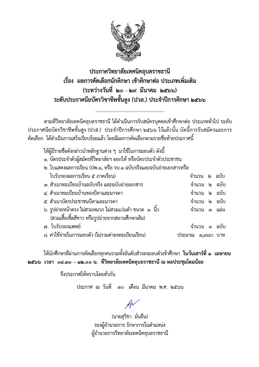 ผลการสอบคัดเลือกนักศึกษา เข้าศึกษาต่อ ประเภทเพิ่มเติม (ระหว่างวันที่ 20 – 29 มีนาคม 2566) ระดับประกาศนียบัตรวิชาชีพชั้นสูง (ปวส.) ประจำปีการศึกษา 2566