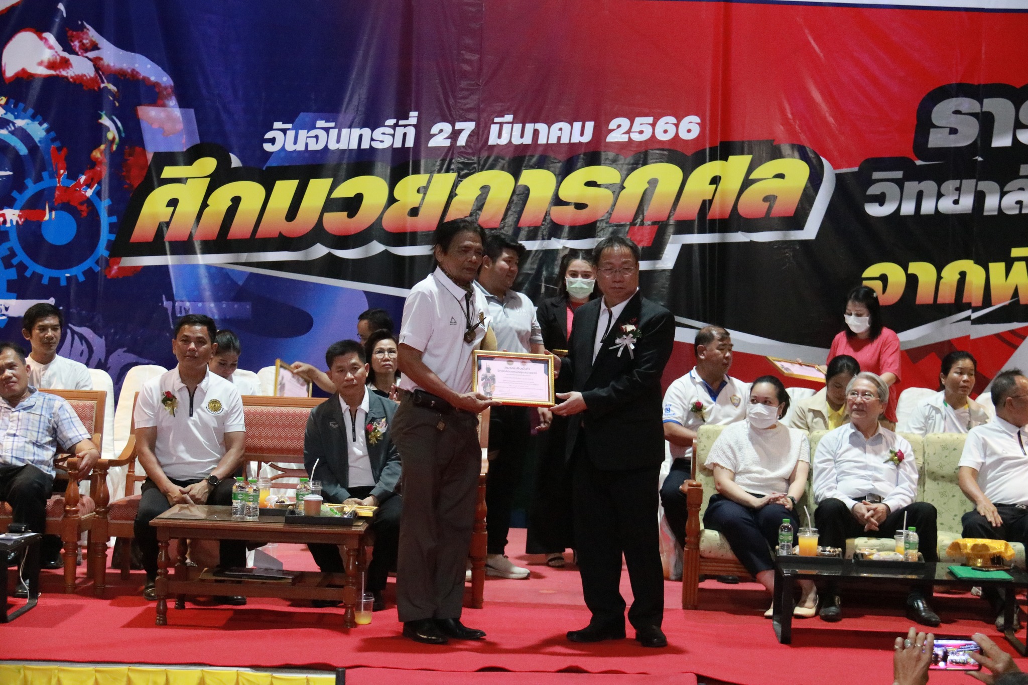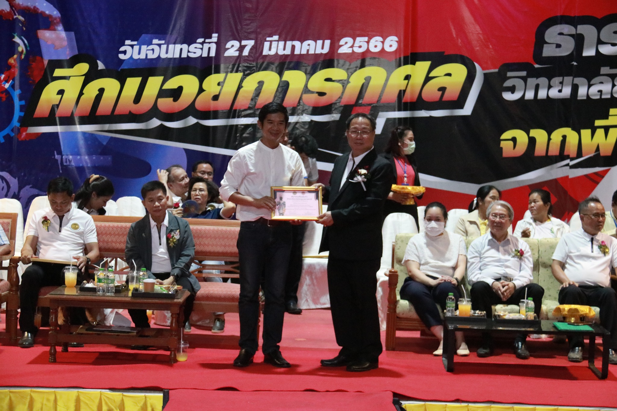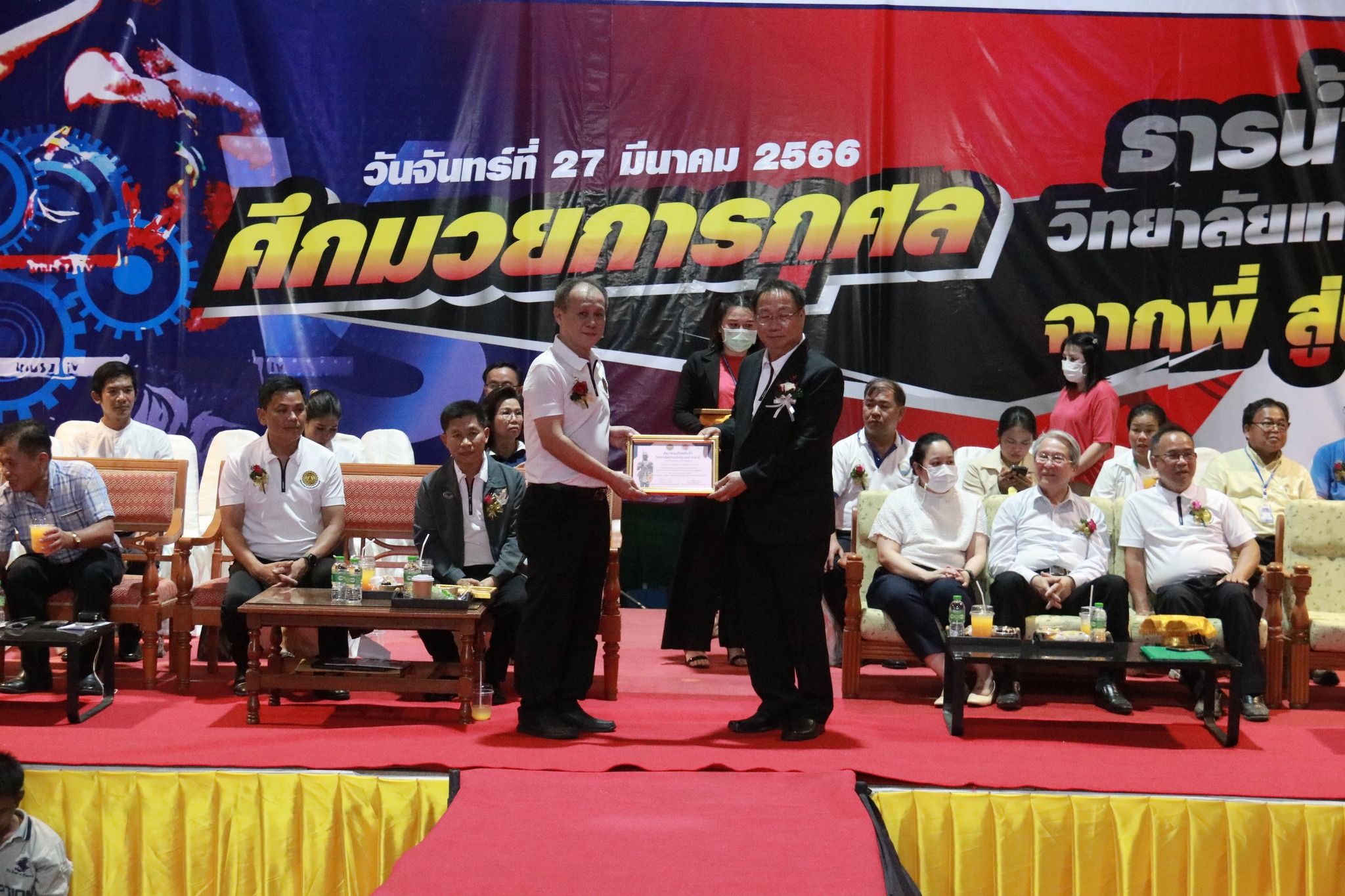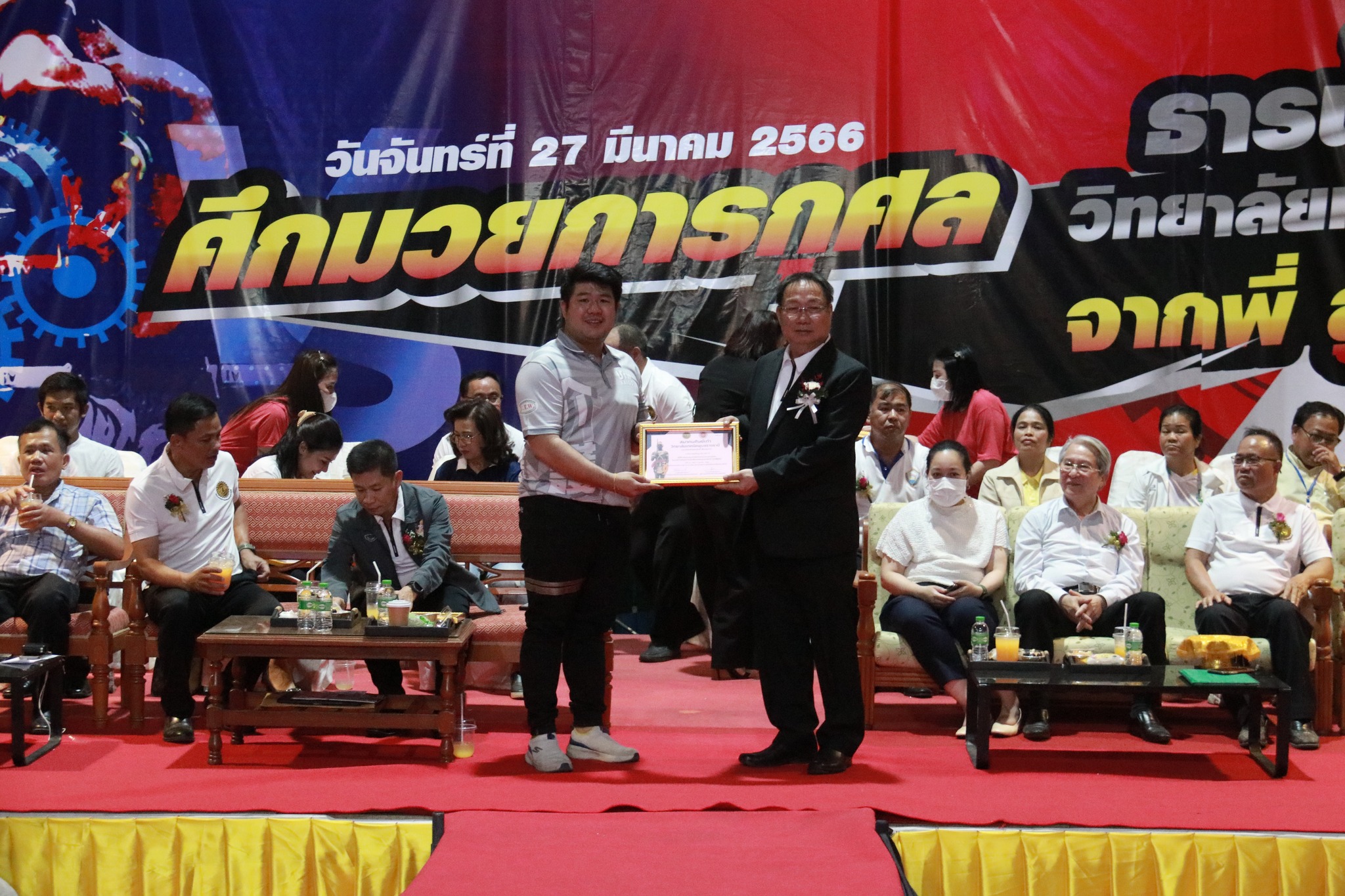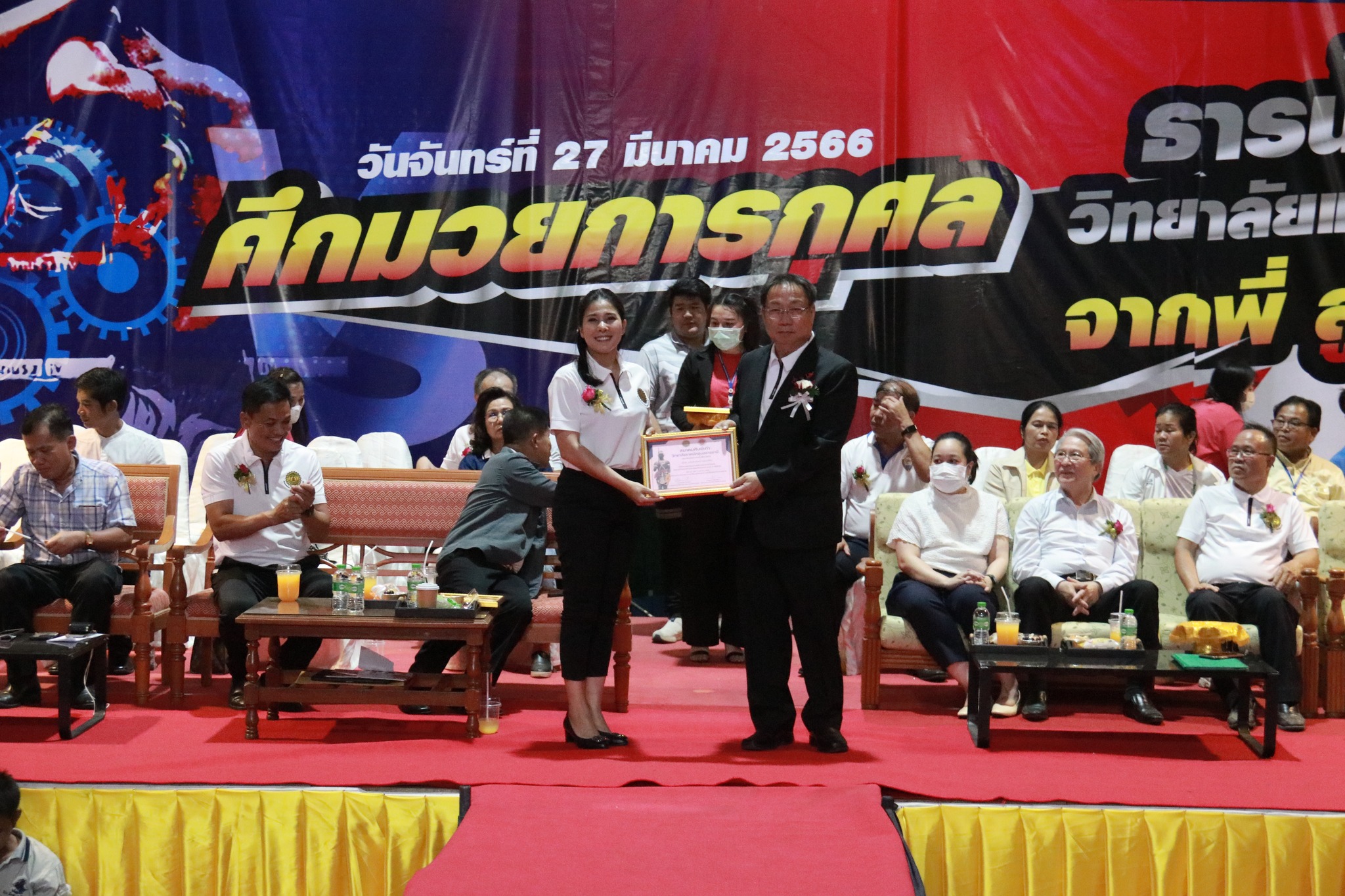 วันที่ ๒๗ มีนาคม ๒๕๖๖ เวลา ๑๗.๐๐ น. นายธาตรี พิบูลมณฑา ผู้อำนวยการวิทยาลัยเทคนิคอุบลราชธานี ให้เกียรติกล่าวต้อนรับในพิธีเปิดกิจกรรมมวยการกุศล “ศึกวันธารน้ำใจศิษย์เก่าวิทยาลัยเทคนิคอุบลราชธานี จากพี่สู่น้อง” ซึ่งดำเนินการจัดกิจกรรมโดยสมาคมศิษย์เก่าวิทยาลัยเทคนิคอุบลราชธานี ในการนี้ได้รับเกียรติจาก นายกำพล สิริรัตตนนท์ รองผู้ว่าราชการจังหวัดอุบลราชธานี เป็นประธานในพิธี และนายประสงค์ จันจำปา นายกสมาคมศิษย์เก่าวิทยาลัยเทคนิคอุบลราชธานี เป็นผู้กล่าวรายงาน โดยมี นางสาวสายฝน สาระผล รองผู้อำนวยการฝ่ายบริหารทรัพยากร นางราตรี สะดีวงศ์ รองผู้อำนวยการฝ่ายแผนงานและความร่วมมือ นายสุวิชา มั่นยืน รองผู้อำนวยการฝ่ายวิชาการ พร้อมด้วยคณะครู บุคลากรทางการศึกษา และประชาชนที่ให้ความสนใจ เข้าร่วมกิจกรรมอย่างพร้อมเพรียง ณ หอประชุมโดมใหญ่ ทั้งนี้เพื่อหารายได้มอบเป็นทุนการศึกษาสำหรับนักศึกษาวิทยาลัยเทคนิคอุบลราชธานีที่เรียนดีแต่ขาดทุนทรัพย์, นักศึกษาที่ทำคุณประโยชน์ต่อสถานศึกษานำชื่อเสียงมาสู่วิทยาลัยฯ ตลอดทั้งสนับสนุนการดำเนินงานของสมาคมศิษย์เก่าวิทยาลัยเทคนิคอุบลราชธานีอีกด้วย