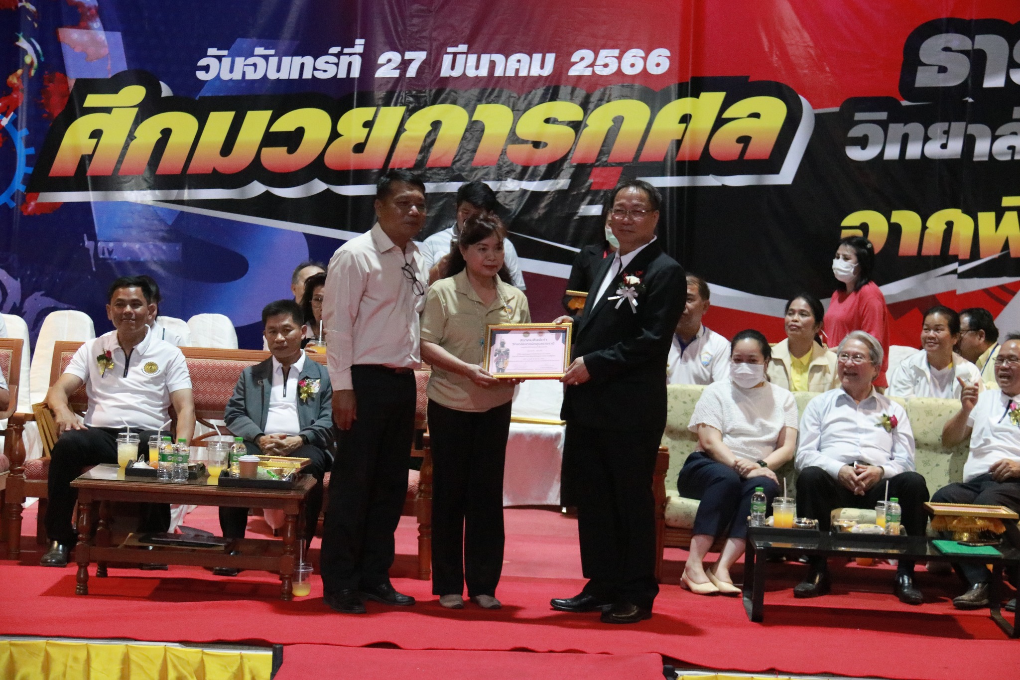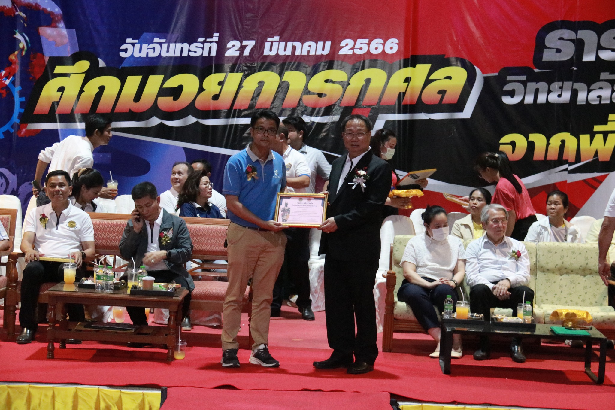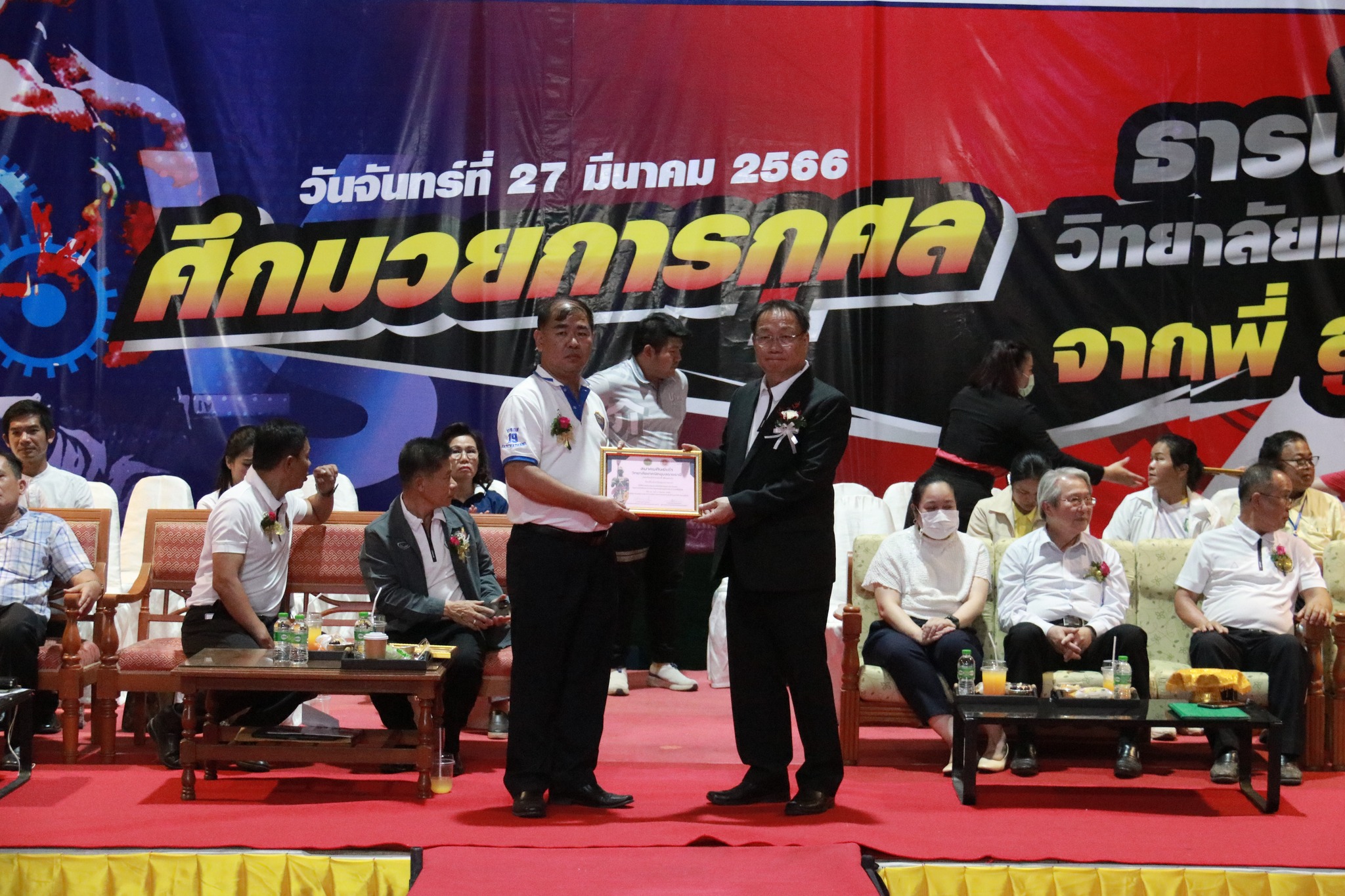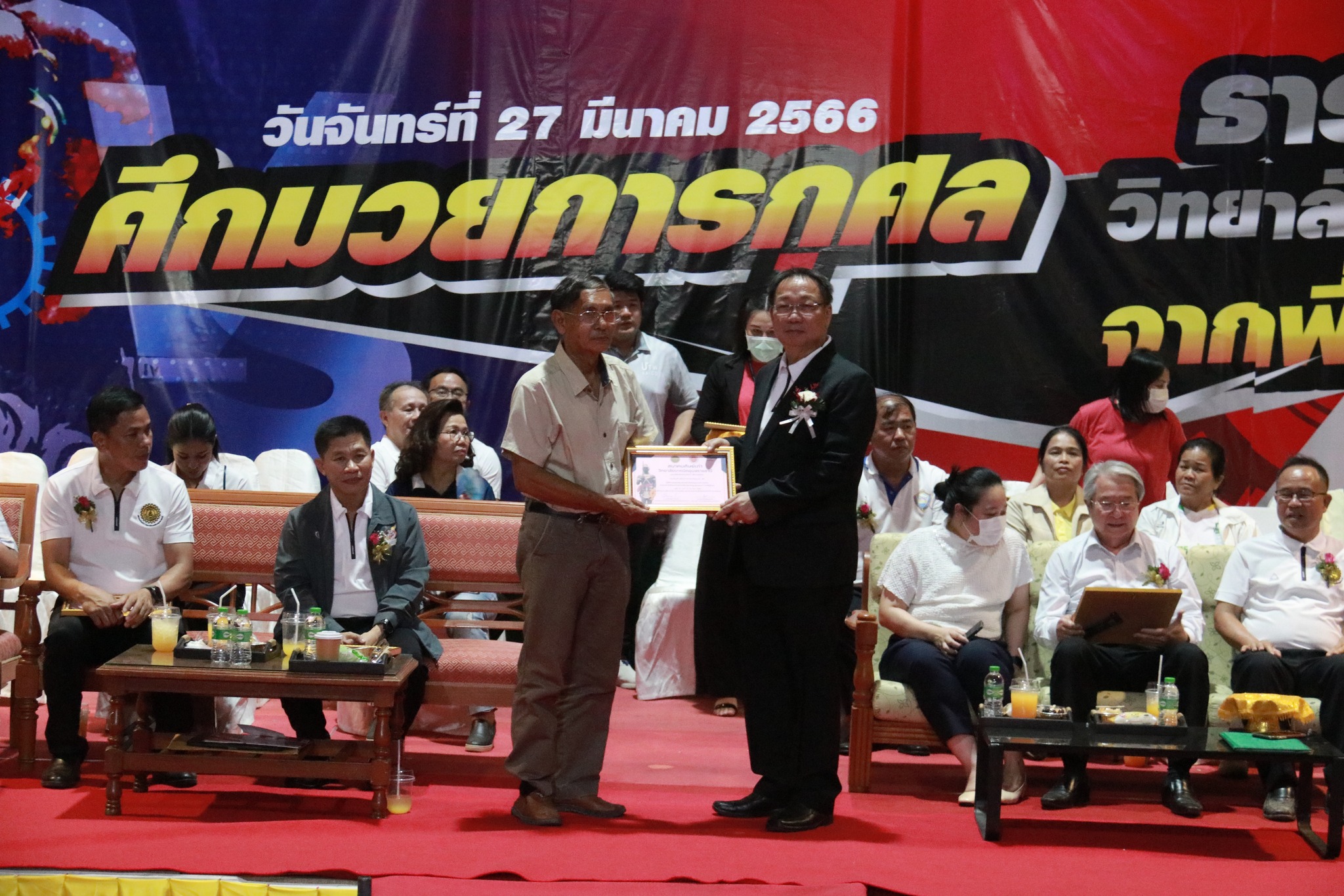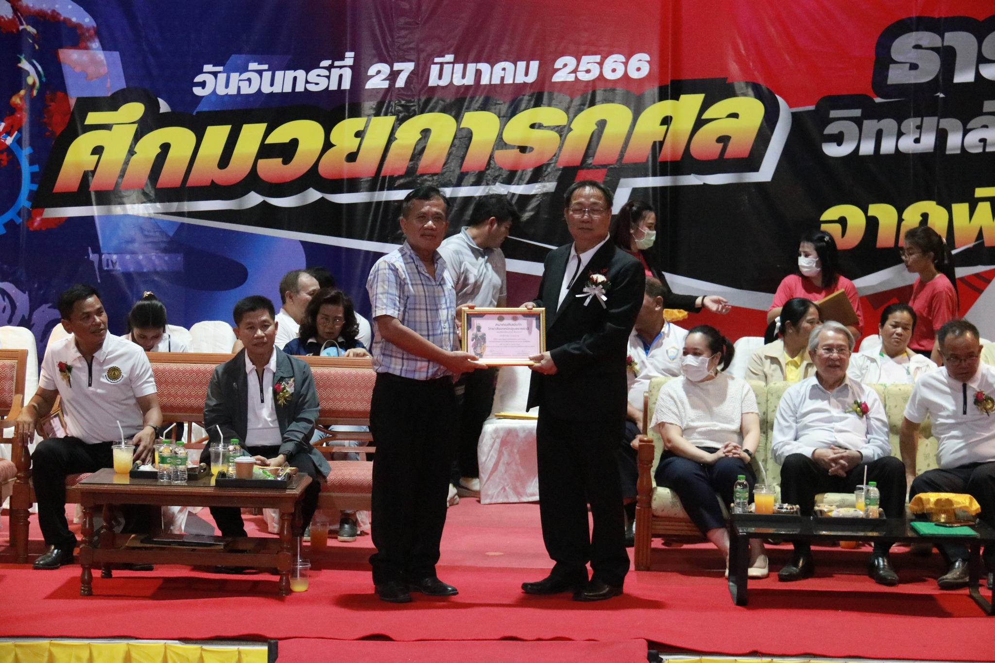 วันที่ ๒๗ มีนาคม ๒๕๖๖ เวลา ๑๗.๐๐ น. นายธาตรี พิบูลมณฑา ผู้อำนวยการวิทยาลัยเทคนิคอุบลราชธานี ให้เกียรติกล่าวต้อนรับในพิธีเปิดกิจกรรมมวยการกุศล “ศึกวันธารน้ำใจศิษย์เก่าวิทยาลัยเทคนิคอุบลราชธานี จากพี่สู่น้อง” ซึ่งดำเนินการจัดกิจกรรมโดยสมาคมศิษย์เก่าวิทยาลัยเทคนิคอุบลราชธานี ในการนี้ได้รับเกียรติจาก นายกำพล สิริรัตตนนท์ รองผู้ว่าราชการจังหวัดอุบลราชธานี เป็นประธานในพิธี และนายประสงค์ จันจำปา นายกสมาคมศิษย์เก่าวิทยาลัยเทคนิคอุบลราชธานี เป็นผู้กล่าวรายงาน โดยมี นางสาวสายฝน สาระผล รองผู้อำนวยการฝ่ายบริหารทรัพยากร นางราตรี สะดีวงศ์ รองผู้อำนวยการฝ่ายแผนงานและความร่วมมือ นายสุวิชา มั่นยืน รองผู้อำนวยการฝ่ายวิชาการ พร้อมด้วยคณะครู บุคลากรทางการศึกษา และประชาชนที่ให้ความสนใจ เข้าร่วมกิจกรรมอย่างพร้อมเพรียง ณ หอประชุมโดมใหญ่ ทั้งนี้เพื่อหารายได้มอบเป็นทุนการศึกษาสำหรับนักศึกษาวิทยาลัยเทคนิคอุบลราชธานีที่เรียนดีแต่ขาดทุนทรัพย์, นักศึกษาที่ทำคุณประโยชน์ต่อสถานศึกษานำชื่อเสียงมาสู่วิทยาลัยฯ ตลอดทั้งสนับสนุนการดำเนินงานของสมาคมศิษย์เก่าวิทยาลัยเทคนิคอุบลราชธานีอีกด้วย