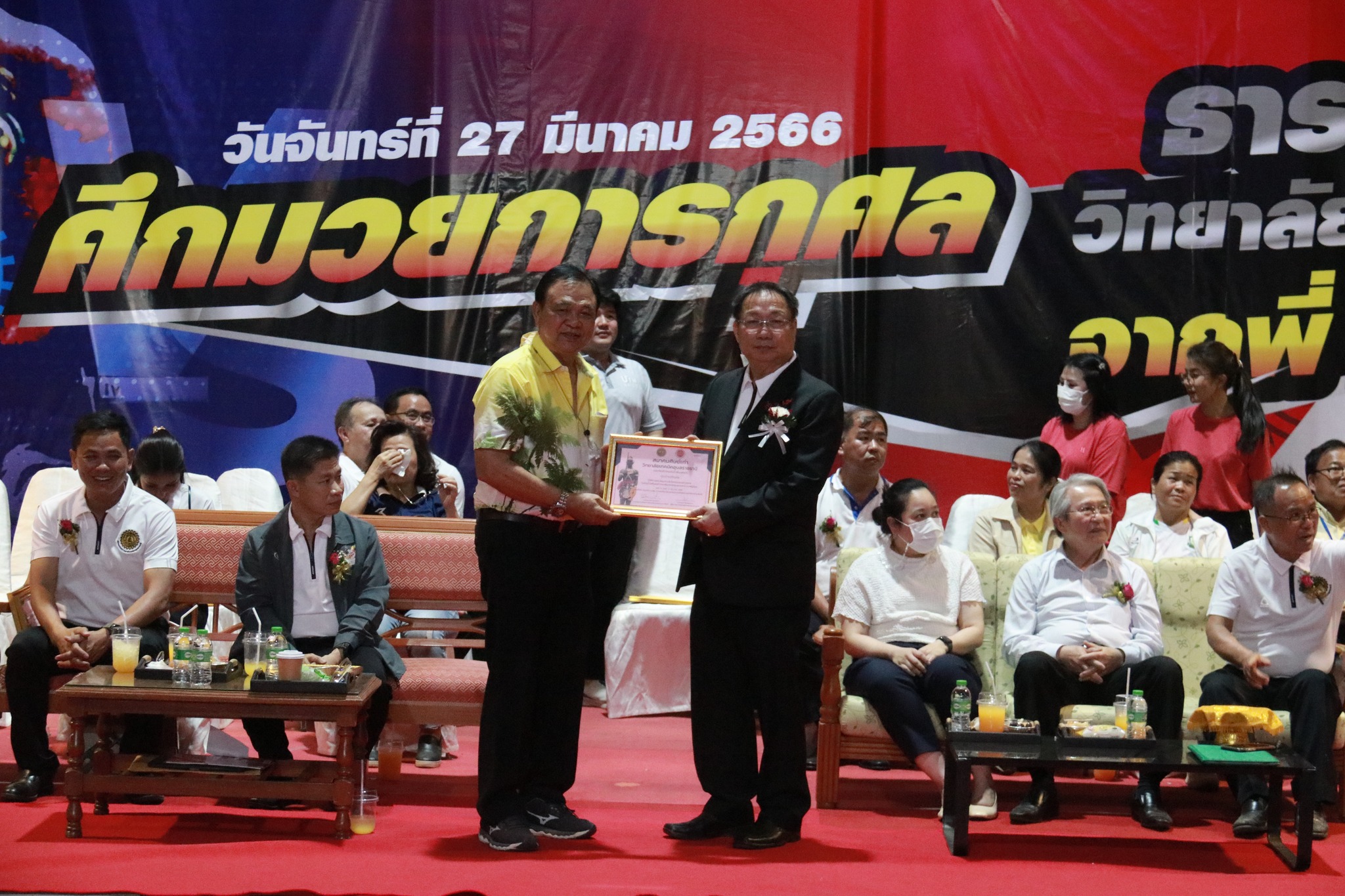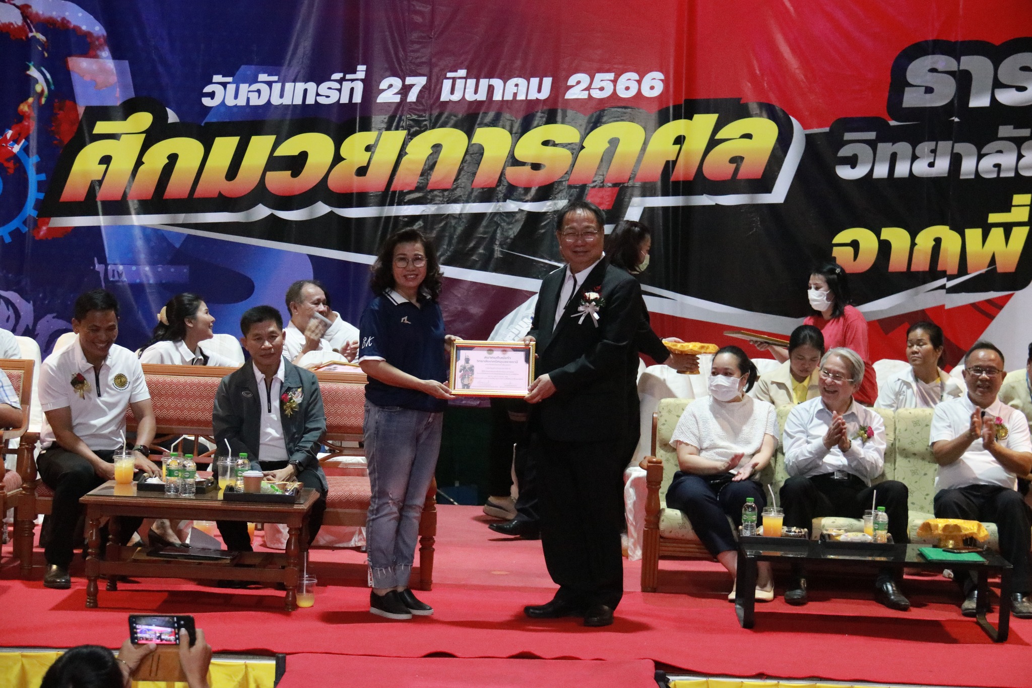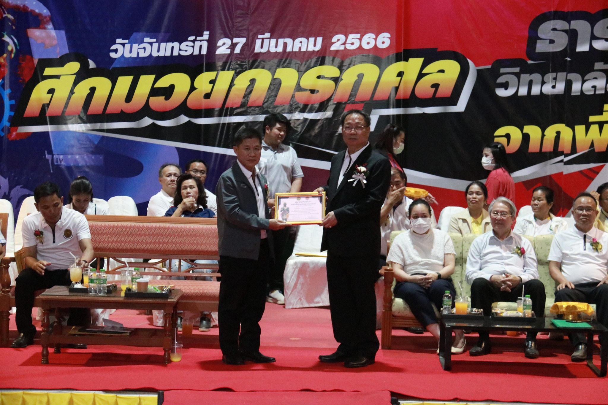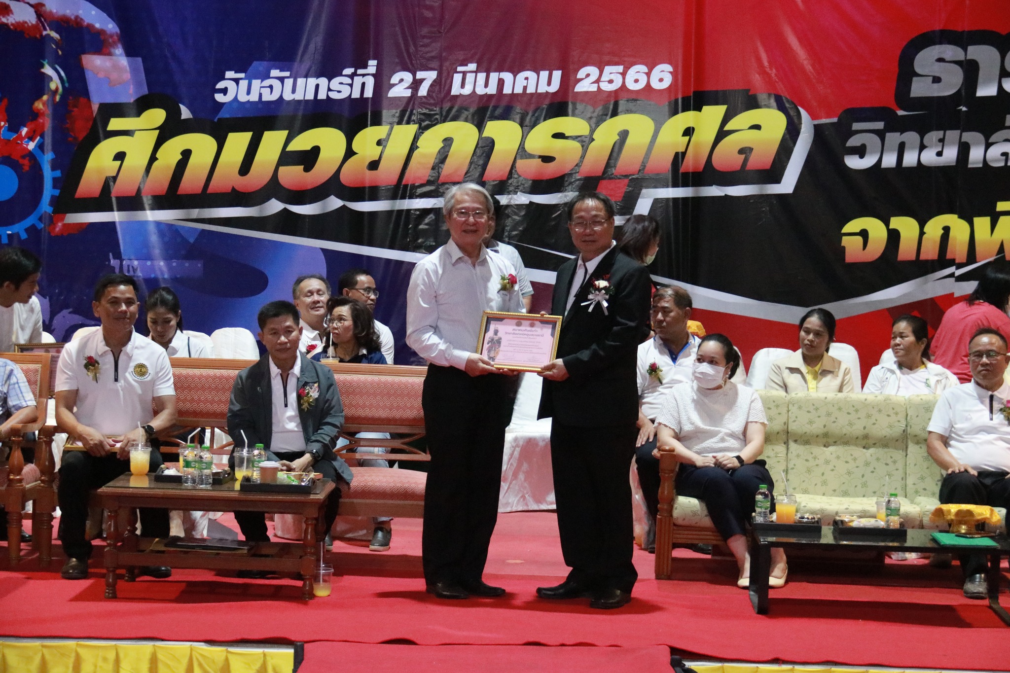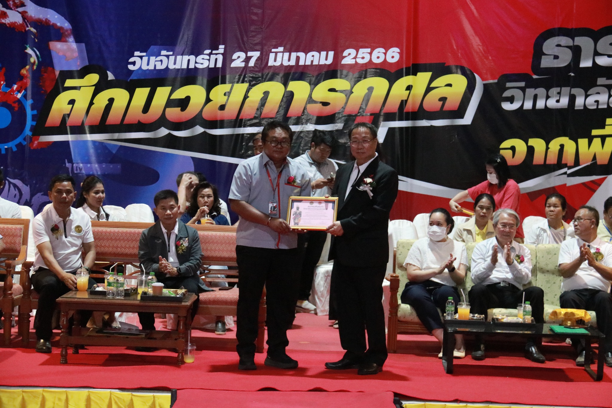 วันที่ ๒๗ มีนาคม ๒๕๖๖ เวลา ๑๗.๐๐ น. นายธาตรี พิบูลมณฑา ผู้อำนวยการวิทยาลัยเทคนิคอุบลราชธานี ให้เกียรติกล่าวต้อนรับในพิธีเปิดกิจกรรมมวยการกุศล “ศึกวันธารน้ำใจศิษย์เก่าวิทยาลัยเทคนิคอุบลราชธานี จากพี่สู่น้อง” ซึ่งดำเนินการจัดกิจกรรมโดยสมาคมศิษย์เก่าวิทยาลัยเทคนิคอุบลราชธานี ในการนี้ได้รับเกียรติจาก นายกำพล สิริรัตตนนท์ รองผู้ว่าราชการจังหวัดอุบลราชธานี เป็นประธานในพิธี และนายประสงค์ จันจำปา นายกสมาคมศิษย์เก่าวิทยาลัยเทคนิคอุบลราชธานี เป็นผู้กล่าวรายงาน โดยมี นางสาวสายฝน สาระผล รองผู้อำนวยการฝ่ายบริหารทรัพยากร นางราตรี สะดีวงศ์ รองผู้อำนวยการฝ่ายแผนงานและความร่วมมือ นายสุวิชา มั่นยืน รองผู้อำนวยการฝ่ายวิชาการ พร้อมด้วยคณะครู บุคลากรทางการศึกษา และประชาชนที่ให้ความสนใจ เข้าร่วมกิจกรรมอย่างพร้อมเพรียง ณ หอประชุมโดมใหญ่ ทั้งนี้เพื่อหารายได้มอบเป็นทุนการศึกษาสำหรับนักศึกษาวิทยาลัยเทคนิคอุบลราชธานีที่เรียนดีแต่ขาดทุนทรัพย์, นักศึกษาที่ทำคุณประโยชน์ต่อสถานศึกษานำชื่อเสียงมาสู่วิทยาลัยฯ ตลอดทั้งสนับสนุนการดำเนินงานของสมาคมศิษย์เก่าวิทยาลัยเทคนิคอุบลราชธานีอีกด้วย