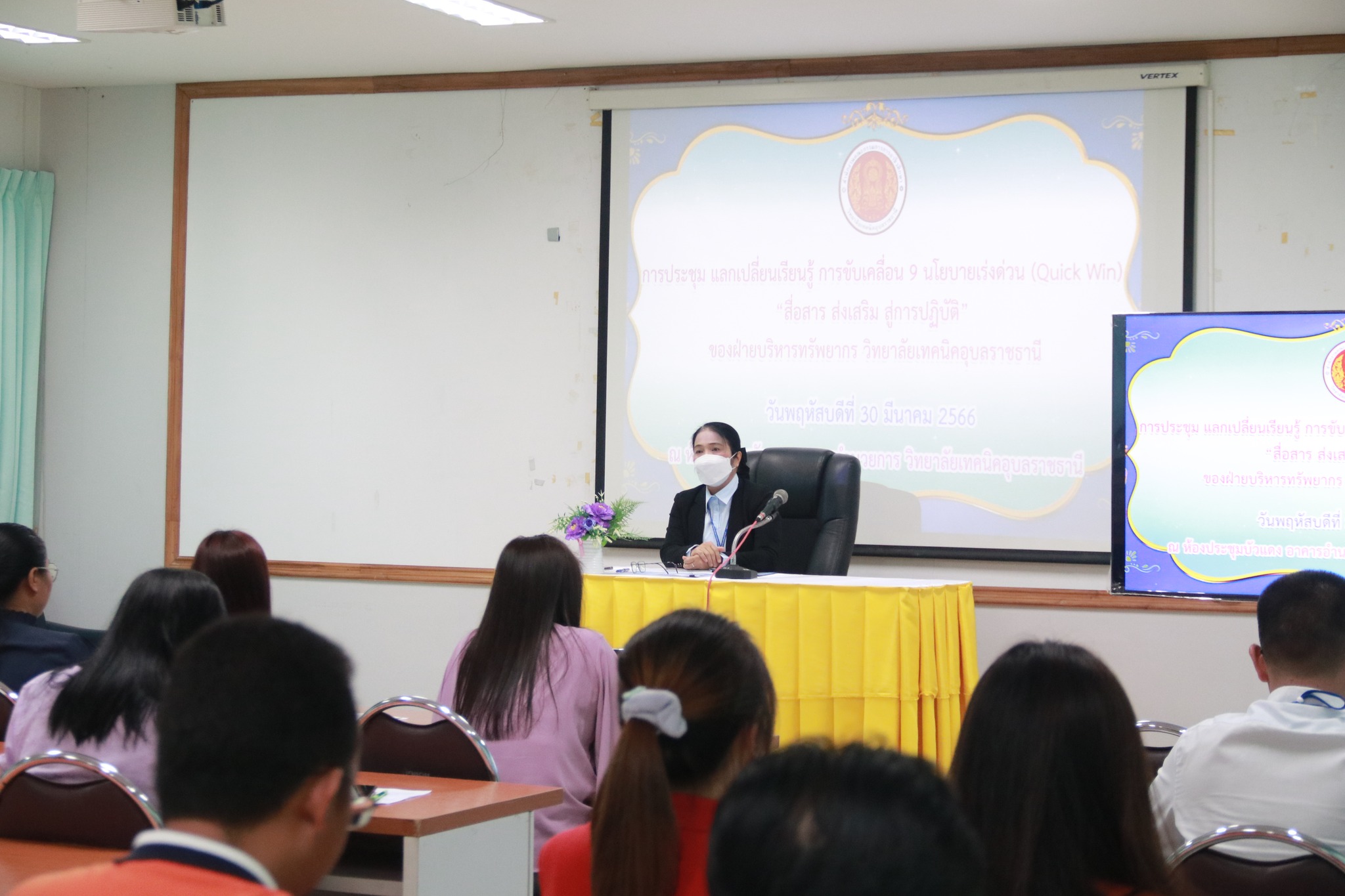 วันที่ ๓๐ มีนาคม ๒๕๖๖ เวลา ๐๘.๓๐ น. นายธาตรี พิบูลมณฑา ผู้อำนวยการวิทยาลัยเทคนิคอุบลราชธานีได้มอบหมายให้ นางสาวสายฝน สาระผล รองผู้อำนวยการฝ่ายบริหารทรัพยากร เป็นประธานในการประชุม ครู และบุคลากรในฝ่ายบริหารทรัพยากร ครั้งที่ ๑/๒๕๖๖ ณ ห้องประชุมบัวแดง โดยมีหัวหน้างาน ครู และบุคลากรทางการศึกษาที่เกี่ยวข้อง เข้าร่วมการประชุมอย่างพร้อมเพรียง ทั้งนี้เพื่อแต่งตั้งและมอบหมายหน้าที่ให้บุคลากรในสถานศึกษาปฏิบัติหน้าที่ราชการตามระเบียบสำนักงานคณะกรรมการการอาชีวศึกษาว่าด้วยการบริหารสถานศึกษา พุทธศักราช ๒๕๕๒ พร้อมทั้งรับฟังข้อคิดเห็น ปัญหา อุปสรรค และข้อเสนอแนะต่าง ๆ เพื่อมาปรับใช้ให้เกิดประโยชน์ต่อการปฏิบัติงานและการพัฒนางานของบุคลากรในฝ่ายบริหารทรัพยากร ต่อไป