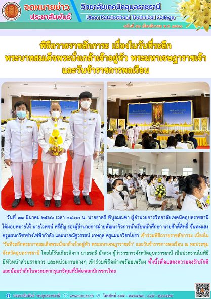 วันที่ ๓๑ มีนาคม ๒๕๖๖ เวลา ๐๘.๐๐ น. นายธาตรี พิบูลมณฑา ผู้อำนวยการวิทยาลัยเทคนิคอุบลราชธานี ได้มอบหมายให้ นายไวพจน์ ศรีธัญ รองผู้อำนวยการฝ่ายพัฒนากิจการนักเรียนนักศึกษา นายศักดิ์สิทธิ์ จันทะแสง ครูแผนกวิชาช่างไฟฟ้ากำลัง และนายณัฐวรรธน์ เกษกุล ครูแผนกวิชาโยธา เข้าร่วมพิธีถวายราชสักการะ เนื่องใน “วันที่ระลึกพระบาทสมเด็จพระนั่งเกล้าเจ้าอยู่หัว พระมหาเจษฎาราชเจ้า” และวันข้าราชการพลเรือน ณ หอประชุมจังหวัดอุบลราชธานี โดยได้รับเกียรติจาก นายชลธี ยังตรง ผู้ว่าราชการจังหวัดอุบลราชธานี เป็นประธานในพิธี มีหัวหน้าส่วนราชการ และหน่วยงานต่างๆ เข้าร่วมพิธีอย่างพร้อมเพรียง ทั้งนี้เพื่อแสดงความจงรักภักดี และน้อมรำลึกในพระมหากรุณาธิคุณที่มีต่อพสกนิกรชาวไทย