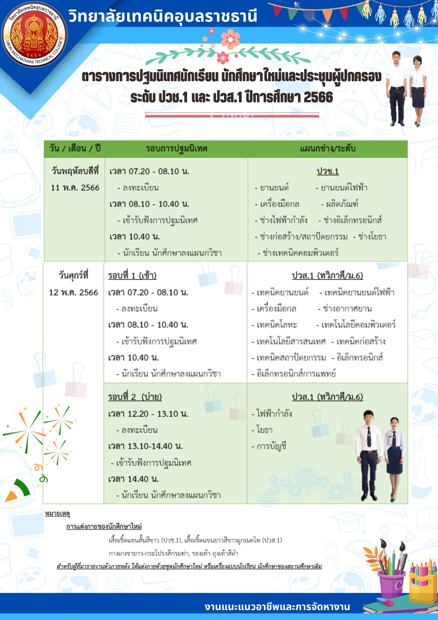 ประกาศจากงานแนะแนวอาชีพและการจัดหางาน วิทยาลัยเทคนิคอุบลราชธานี เรื่อง ตารางกำหนดการปฐมนิเทศนักเรียน นักศึกษาใหม่และประชุมผู้ปกครอง ระดับ ปวช.1 และปวส.1 ปีการศึกษา 2566