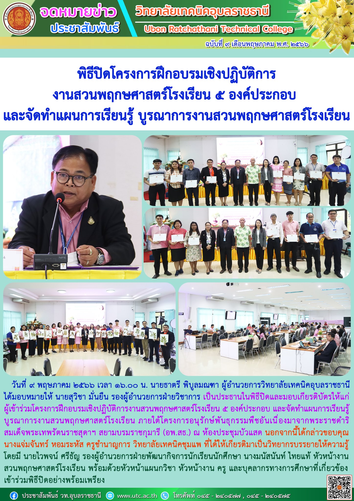 วันที่ ๙ พฤษภาคม ๒๕๖๖เวลา ๑๖.๐๐ น. นายธาตรี พิบูลมณฑา ผู้อำนวยการวิทยาลัยเทคนิคอุบลราชธานี ได้มอบหมายให้ นายสุวิชา มั่นยืน รองผู้อำนวยการฝ่ายวิชาการ เป็นประธานในพิธีปิดและมอบเกียรติบัตรให้แก่ผู้เข้าร่วมโครงการฝึกอบรมเชิงปฏิบัติการงานสวนพฤกษศาสตร์โรงเรียน ๕ องค์ประกอบ และจัดทำแผนการเรียนรู้ บูรณาการงานสวนพฤกษศาสตร์โรงเรียน ภายใต้โครงการอนุรักษ์พันธุกรรมพืชอันเนื่องมาจากพระราชดำริ สมเด็จพระเทพรัตนราชสุดาฯ สยามบรมราชกุมารี (อพ.สธ.) ณ ห้องประชุมบัวแสด นอกจากนี้ได้กล่าวขอบคุณ นางแจ่มจันทร์ หอมระหัส ครูชำนาญการ วิทยาลัยเทคนิคชุมแพ ที่ได้ให้เกียรติมาเป็นวิทยากรบรรยายให้ความรู้ โดยมี นายไวพจน์ ศรีธัญ รองผู้อำนวยการฝ่ายพัฒนากิจการนักเรียนนักศึกษา นางมนัสนันท์ ไทยแท้ หัวหน้างานสวนพฤกษศาสตร์โรงเรียน พร้อมด้วยหัวหน้าแผนกวิชา หัวหน้างาน ครู และบุคลากรทางการศึกษาที่เกี่ยวข้อง เข้าร่วมพิธีปิดอย่างพร้อมเพรียง