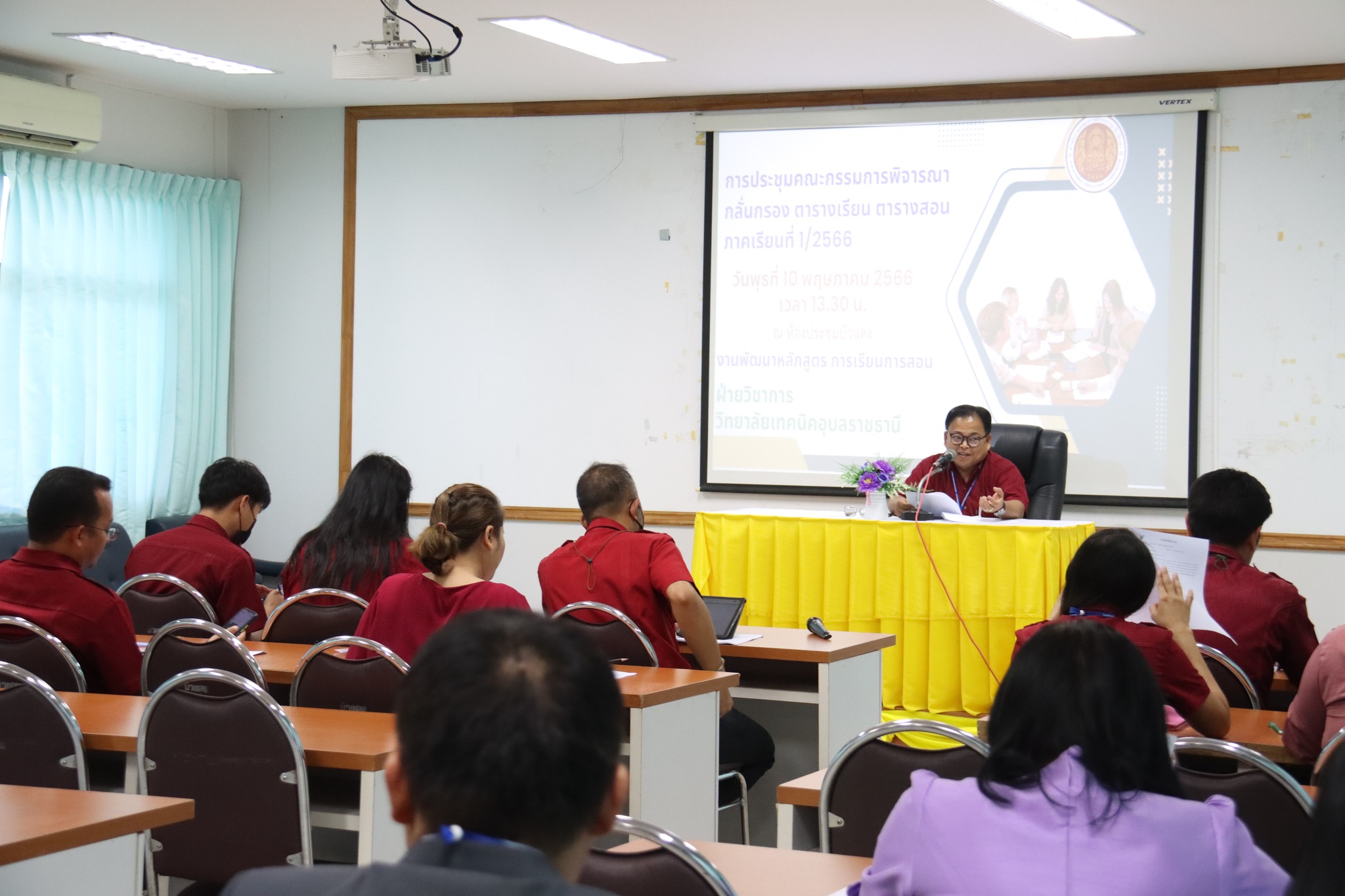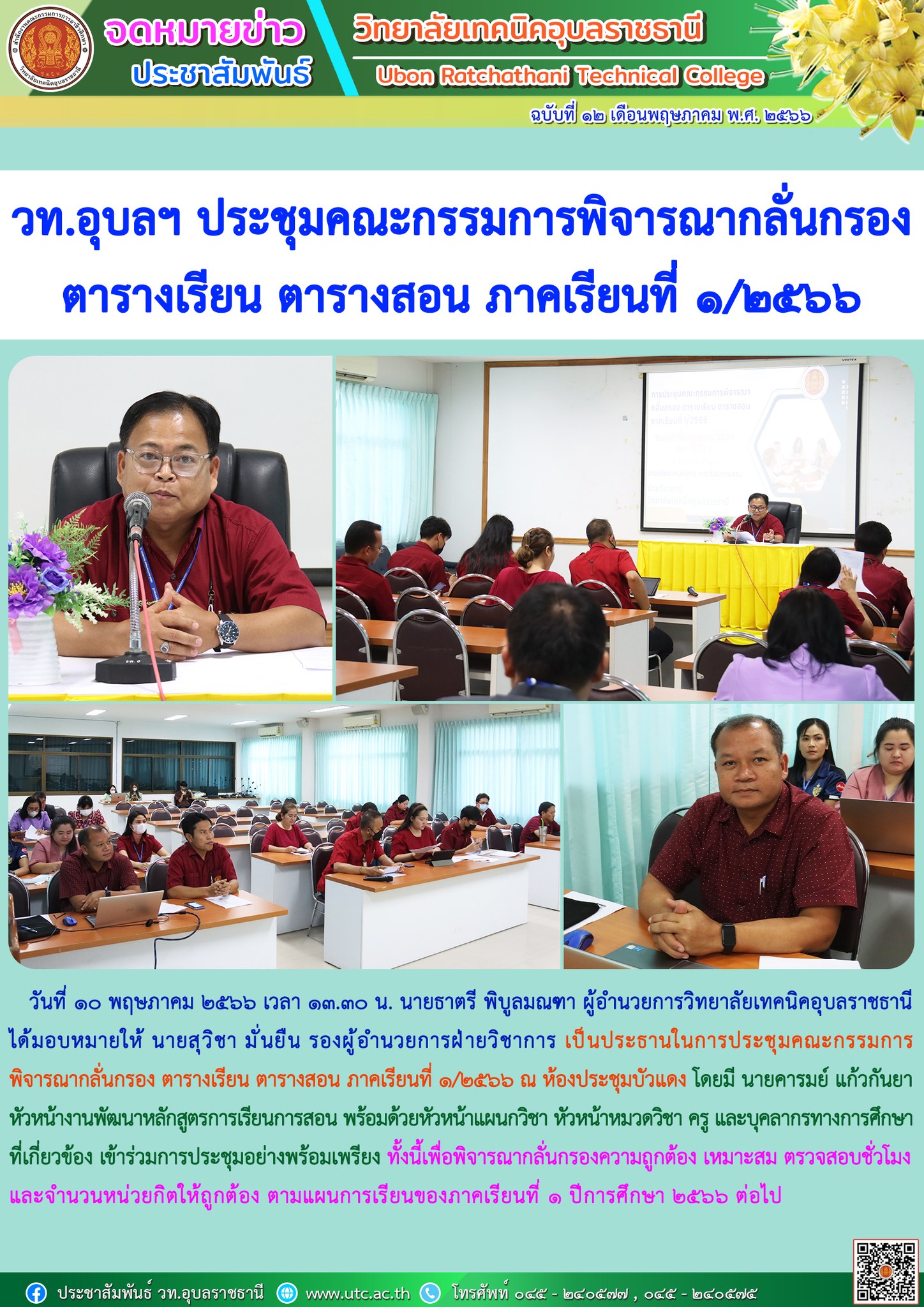 วันที่ ๑๐ พฤษภาคม ๒๕๖๖ เวลา ๑๓.๓๐ น. นายธาตรี พิบูลมณฑา ผู้อำนวยการวิทยาลัยเทคนิคอุบลราชธานี ได้มอบหมายให้ นายสุวิชามั่นยืน รองผู้อำนวยการฝ่ายวิชาการ เป็นประธานในการประชุมคณะกรรมการพิจารณากลั่นกรอง ตารางเรียน ตารางสอน ภาคเรียนที่ ๑/๒๕๖๖ ณ ห้องประชุมบัวแดง โดยมี นายคารมย์ แก้วกันยา หัวหน้างานพัฒนาหลักสูตรการเรียนการสอน พร้อมด้วยหัวหน้าแผนกวิชา หัวหน้าหมวดวิชา ครู และบุคลากรทางการศึกษาที่เกี่ยวข้อง เข้าร่วมการประชุมอย่างพร้อมเพรียง ทั้งนี้เพื่อพิจารณากลั่นกรองความถูกต้อง เหมาะสม ตรวจสอบชั่วโมง และจำนวนหน่วยกิตให้ถูกต้อง ตามแผนการเรียนของภาคเรียนที่ ๑ ปีการศึกษา ๒๕๖๖ ต่อไป