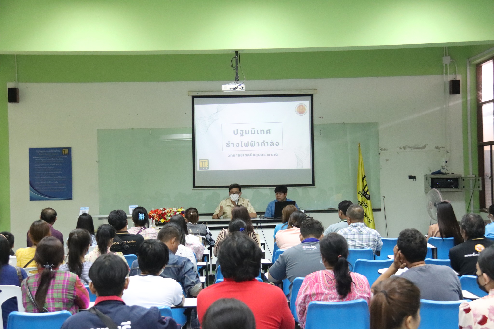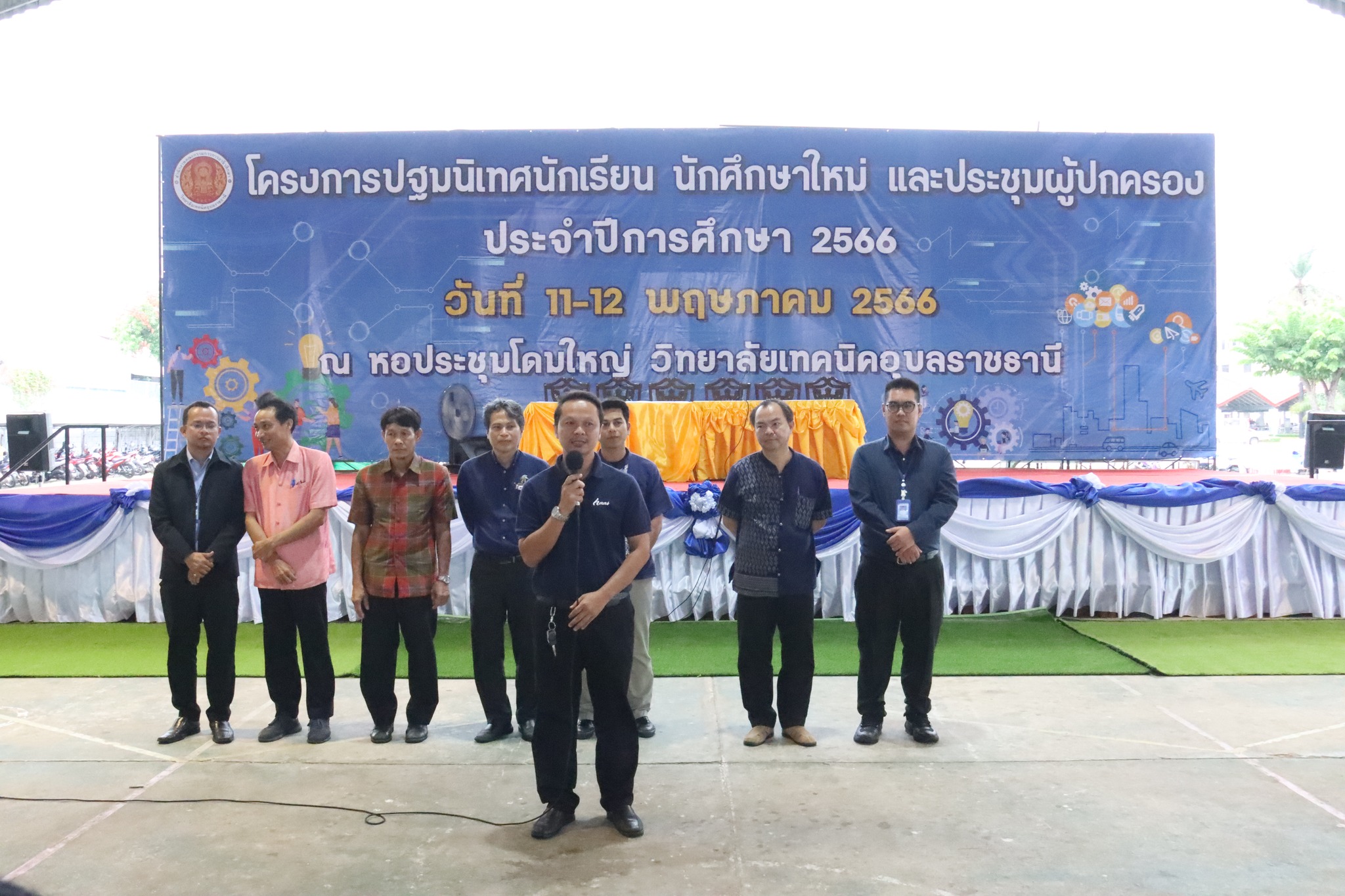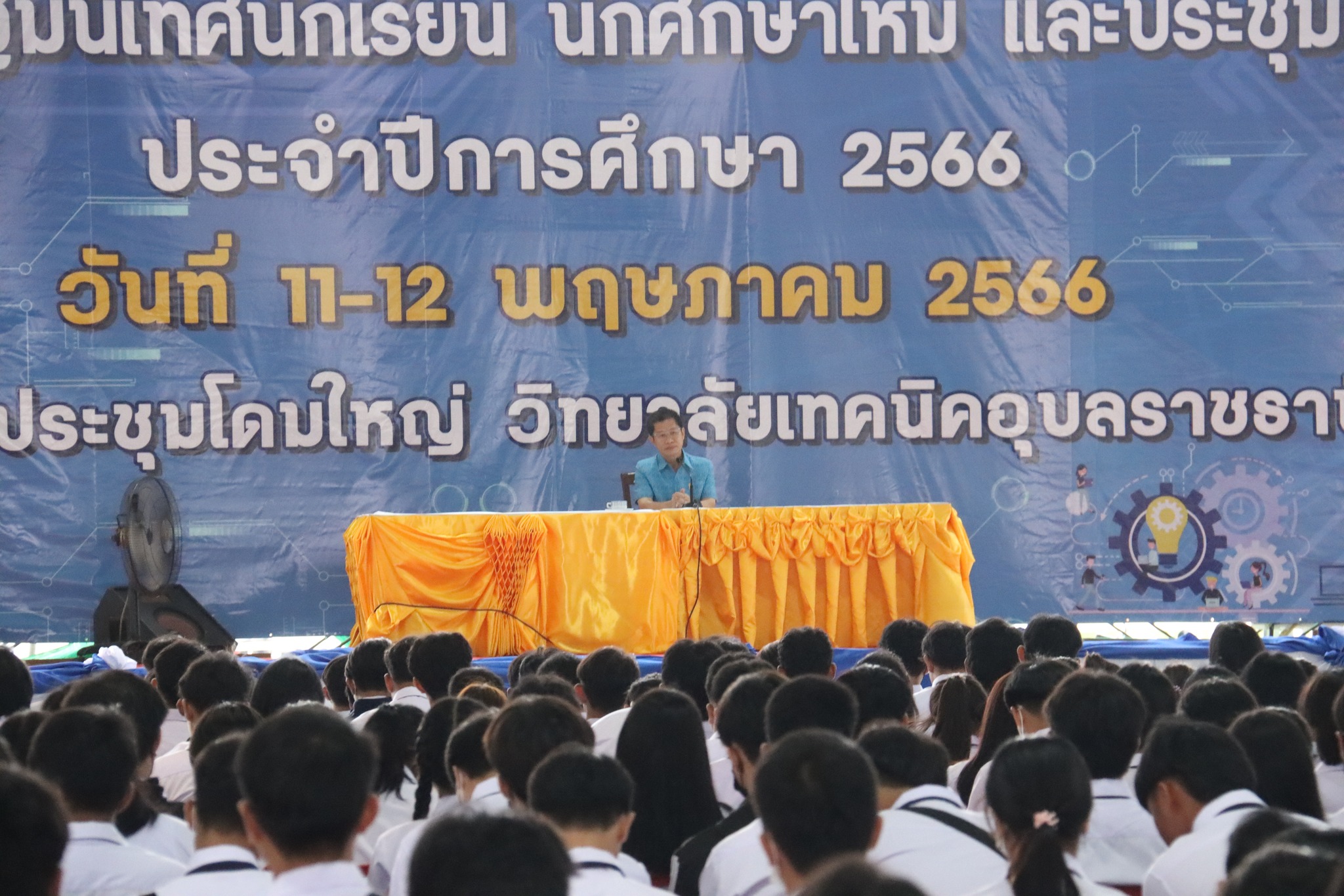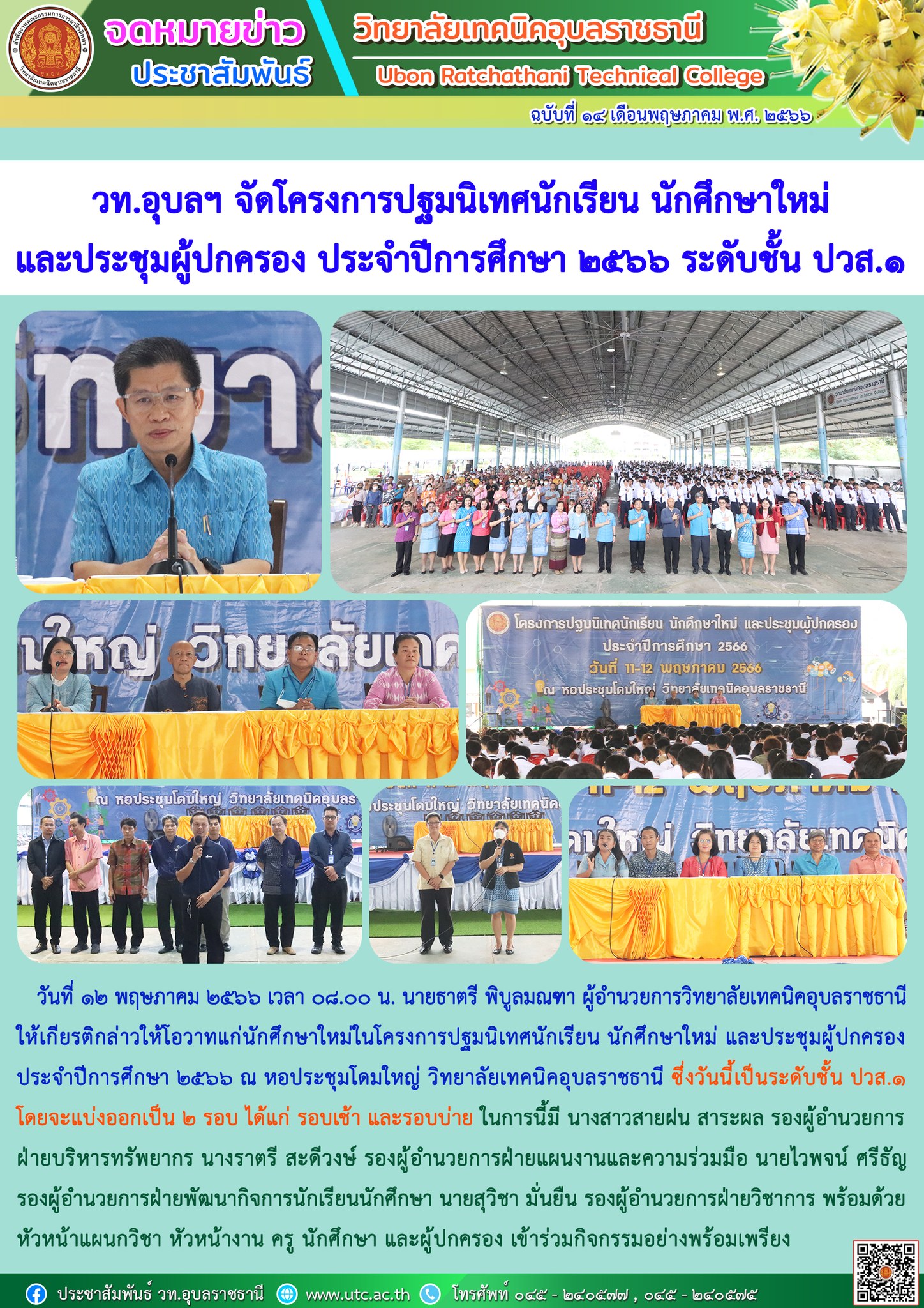 วันที่ ๑๒ พฤษภาคม ๒๕๖๖ เวลา ๐๘.๐๐ น. นายธาตรี พิบูลมณฑา ผู้อำนวยการวิทยาลัยเทคนิคอุบลราชธานี ให้เกียรติกล่าวให้โอวาทแก่นักศึกษาใหม่ในโครงการปฐมนิเทศนักเรียน นักศึกษาใหม่ และประชุมผู้ปกครอง ประจำปีการศึกษา ๒๕๖๖ ณ หอประชุมโดมใหญ่ วิทยาลัยเทคนิคอุบลราชธานี ซึ่งวันนี้เป็นระดับชั้น ปวส.๑ โดยจะแบ่งออกเป็น ๒ รอบ ได้แก่ รอบเช้า และรอบบ่าย ในการนี้มี นางสาวสายฝน สาระผล รองผู้อำนวยการฝ่ายบริหารทรัพยากร นางราตรี สะดีวงษ์ รองผู้อำนวยการฝ่ายแผนงานและความร่วมมือ นายไวพจน์ ศรีธัญ รองผู้อำนวยการฝ่ายพัฒนากิจการนักเรียนนักศึกษา นายสุวิชา มั่นยืน รองผู้อำนวยการฝ่ายวิชาการ พร้อมด้วยหัวหน้าแผนกวิชา หัวหน้างาน ครู นักศึกษา และผู้ปกครอง เข้าร่วมกิจกรรมอย่างพร้อมเพรียง