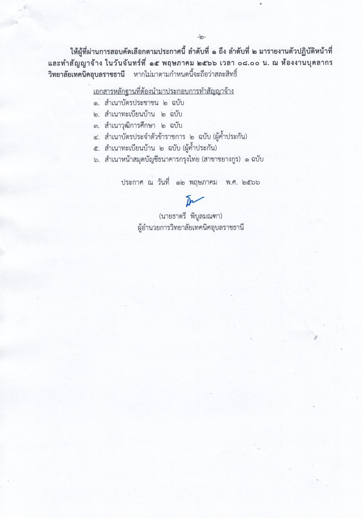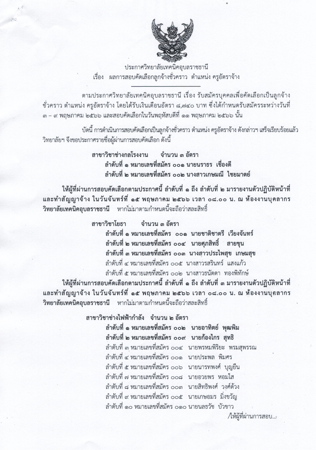 ให้ผู้ที่ผ่านการสอบคัดเลือก ตามลำดับในประกาศ มารายงานตัวปฏิบัติงาน และทำสัญญาจ้าง ในวันจันทร์ที่ 15 พฤษภาคม 2566