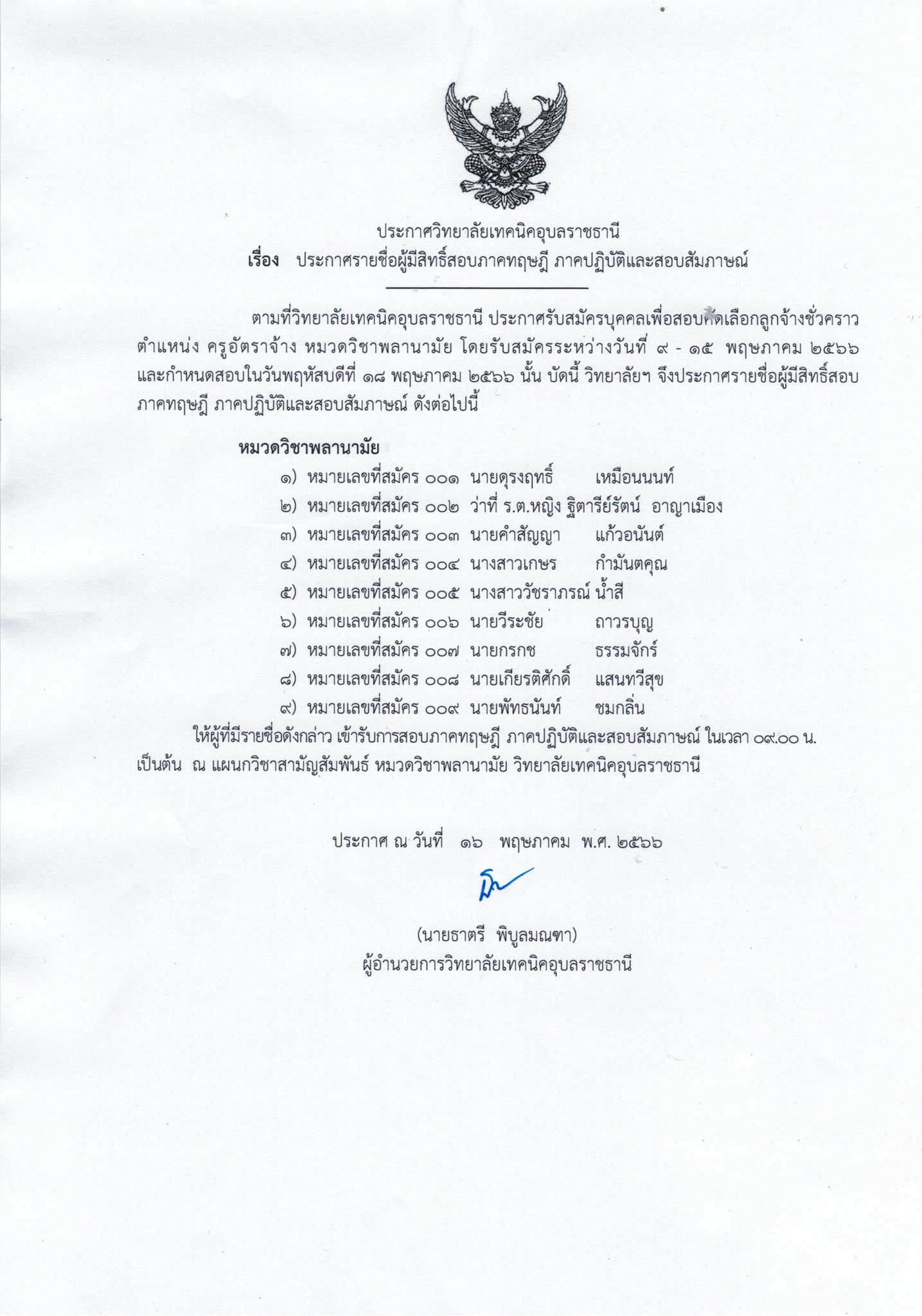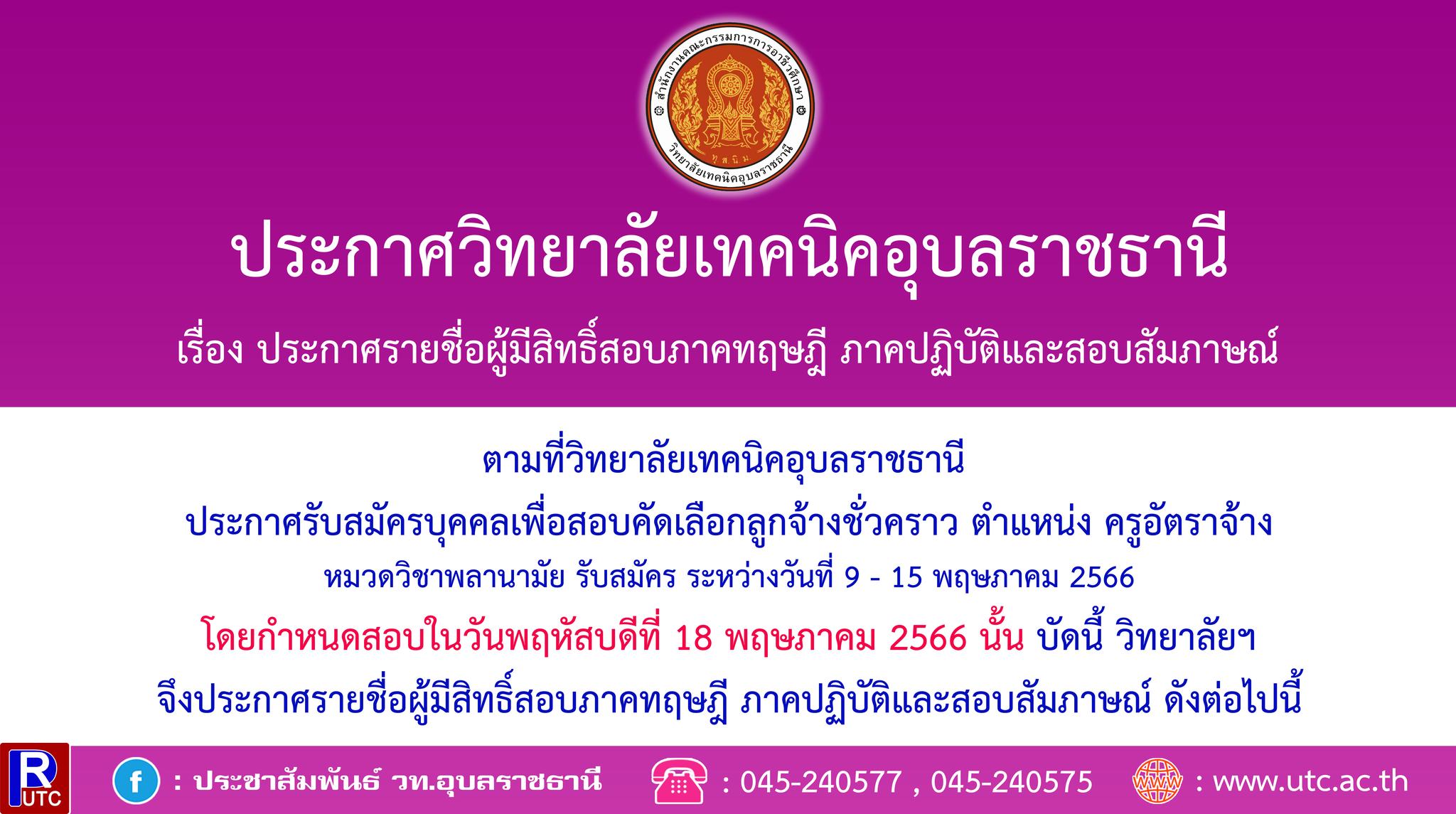 ตามที่วิทยาลัยเทคนิคอุบลราชธานี ประกาศรับสมัครบุคคลเพื่อสอบคัดเลือกลูกจ้างชั่วคราว ตำแหน่ง ครูอัตราจ้าง แผนกวิชาช่างไฟฟ้ากำลัง,แผนกวิชาช่างกลโรงงาน และแผนกวิชาโยธา