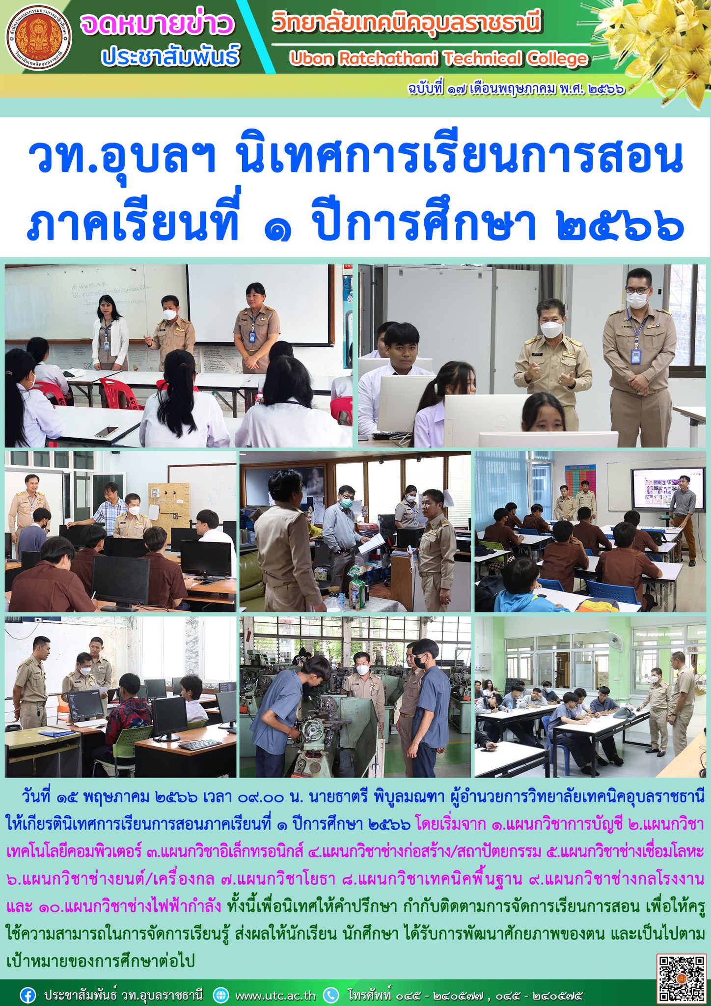 วันที่ ๑๕ พฤษภาคม ๒๕๖๖ เวลา ๐๙.๐๐ น. นายธาตรี พิบูลมณฑา ผู้อำนวยการวิทยาลัยเทคนิคอุบลราชธานี ให้เกียรตินิเทศการเรียนการสอนภาคเรียนที่ ๑ ปีการศึกษา