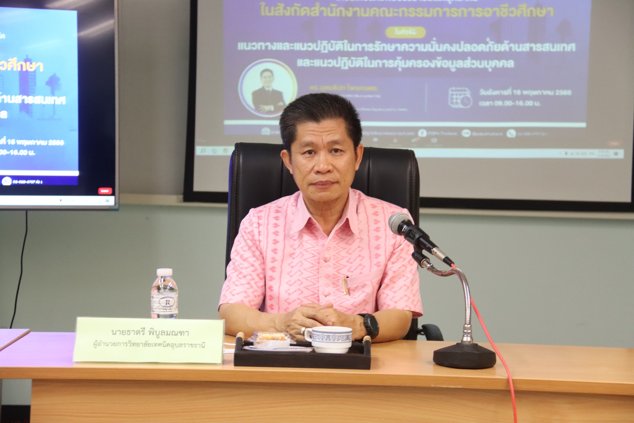 วันที่ ๑๖ พฤษภาคม ๒๕๖๖เวลา ๐๙.๐๐ น. นายธาตรี พิบูลมณฑา ผู้อำนวยการวิทยาลัยเทคนิคอุบลราชธานี พร้อมด้วย นางสาวสายฝน สาระผล รองผู้อำนวยการฝ่ายบริหารทรัพยากร นางราตรี สะดีวงศ์ รองผู้อำนวยการฝ่ายแผนงานและความร่วมมือ ให้เกียรติเข้าร่วมการอบรม เรื่อง แนวทางและแนวปฏิบัติในการรักษาความมั่นคงปลอดภัยด้านสารสนเทศ และ แนวทางและแนวปฏิบัติในการคุ้มครองข้อมูลส่วนบุคคล ผ่านสื่ออิเล็กทรอนิกส์ (โปรแกรม Zoom) ณ ห้องเรียนอัจฉริยะ Smart Classroom ในการนี้ได้รับเกียรติจาก เรืออากาศโท สมพร ปานดำ รองเลขาธิการสำนักงานคณะกรรมการการอาชีวศึกษา เป็นประธานในพิธีเปิดการอบรม โดยมี นายอิทธิพล สุขเติม หัวหน้างานศูนย์ข้อมูลสารสนเทศ และบุคลากรทางการศึกษาที่เกี่ยวข้อง เข้าร่วมการประชุมอย่างพร้อมเพรียง ทั้งนี้เพื่อให้การดำเนินการใดๆ ด้วยวิธีอิเล็กทรอนิกส์กับหน่วยงานของรัฐหรือโดยหน่วยงานของรัฐมีความมั่นคงปลอดภัยและเชื่อถือได้ เป็นไปตามพระราชกฤษฎีกากำหนดหลักเกณฑ์และวิธีธุรกรรมทางอิเล็กทรอนิกส์ภาครัฐ พ.ศ. ๒๕๔๙ และเพื่อให้ผู้ใช้บริการธุรกรรมทางอิเล็กทรอนิกส์ตามภารกิจของสำนักงานคณะกรรมการการอาชีวศึกษา ได้รับความคุ้มครองตามพระราชบัญญัติคุ้มครองข้อมูลส่วนบุคคล พ.ศ. ๒๕๖๒ อีกด้วย