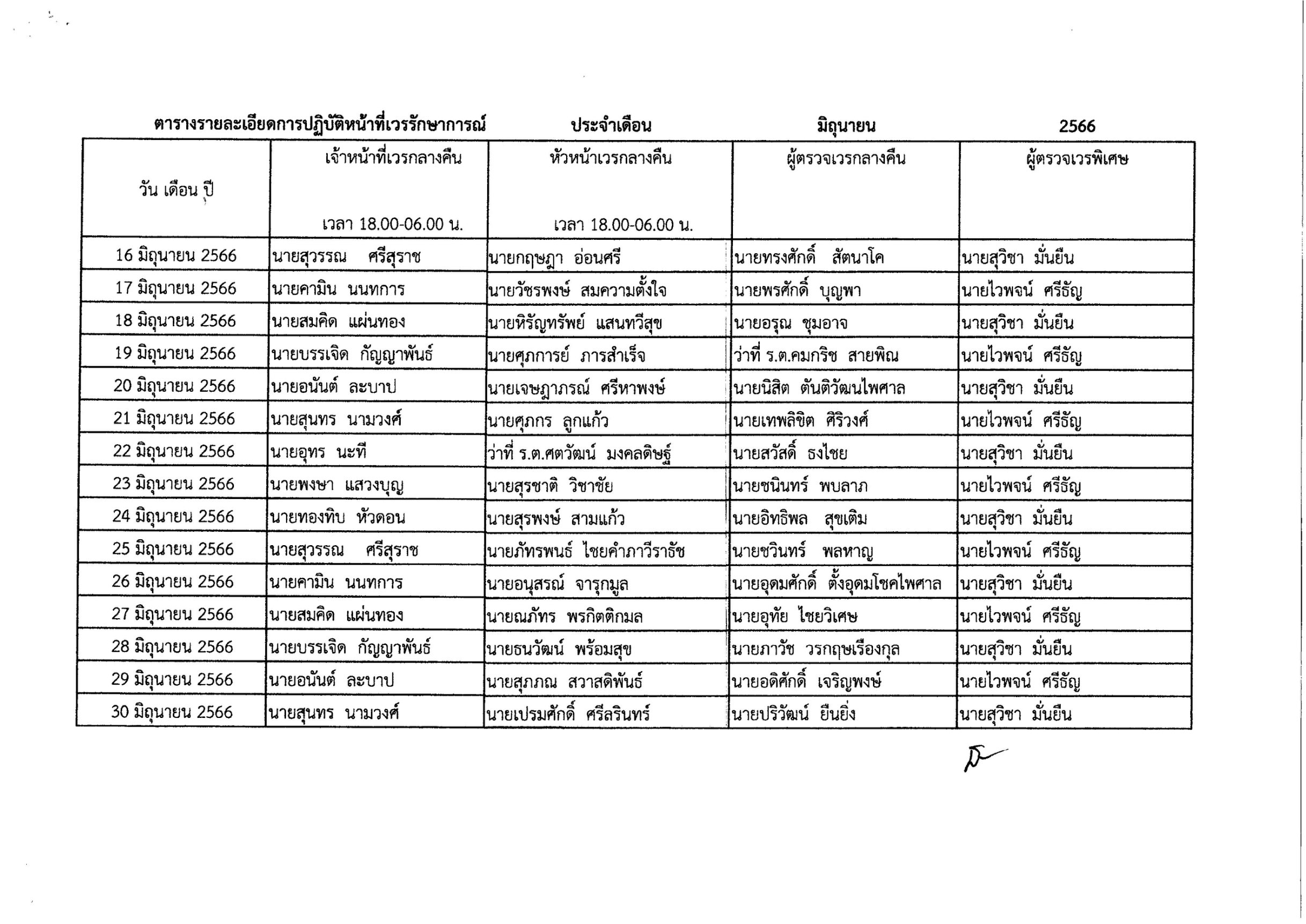 แต่งตั้งบุคคลากรในสังกัดปฏิบัติหน้าที่เวรรักษาการณ์ ภาคกลางวัน ประจำเดือนมิถุนายน 2566