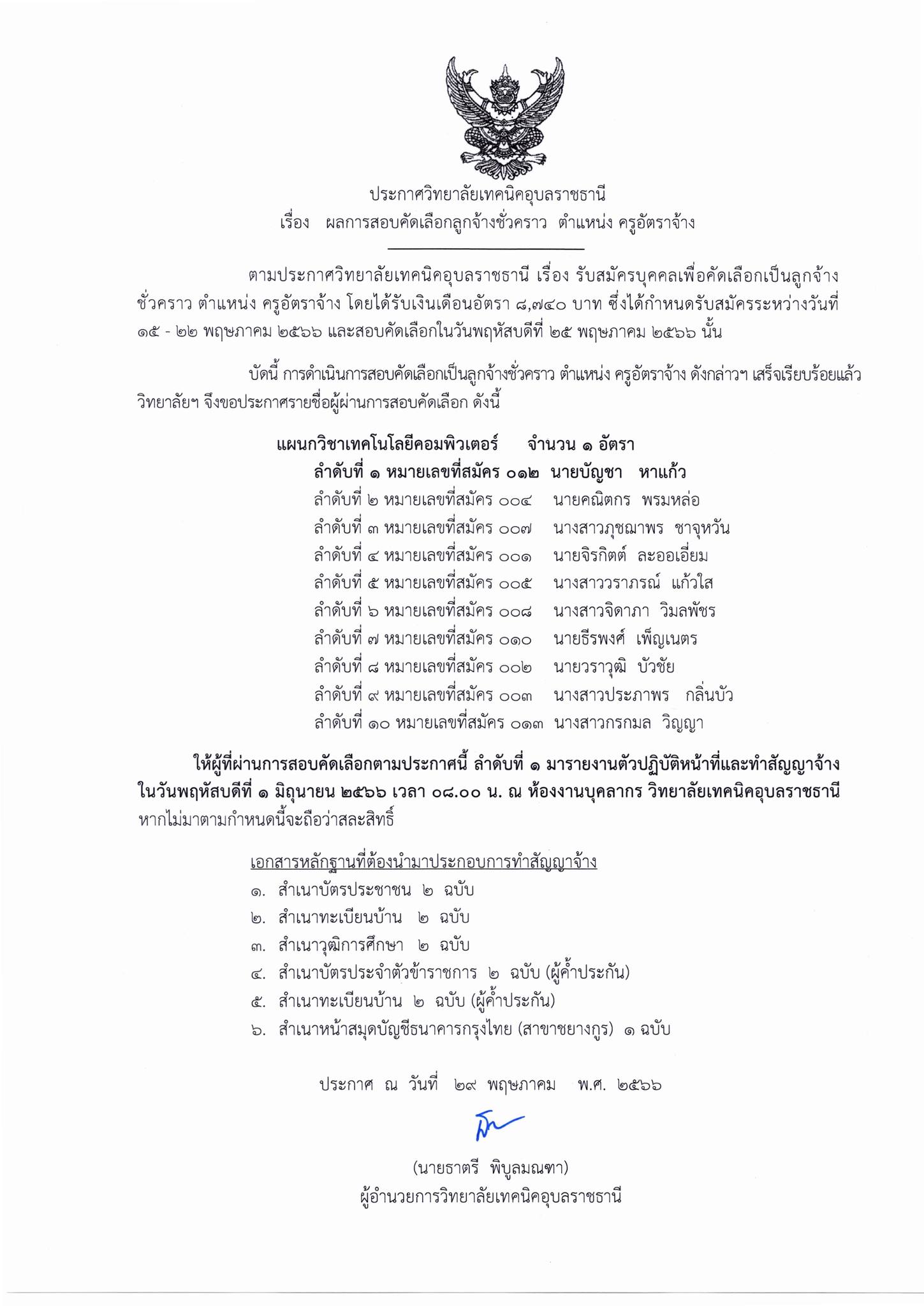 ประกาศวิทยาลัยเทคนิคอุบลราชธานี เรื่อง ผลการสอบคัดเลือกลูกจ้างชั่วคราว ตำแหน่ง ครูอัตราจ้าง