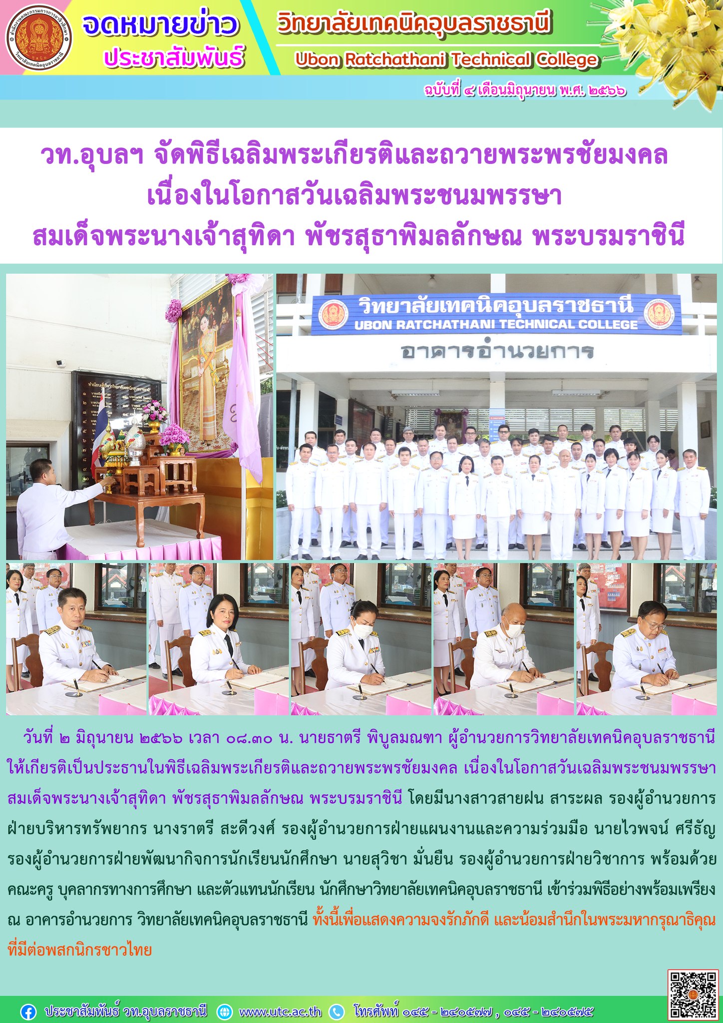 วันที่ ๒ มิถุนายน ๒๕๖๖ เวลา ๐๘.๓๐ น. นายธาตรี พิบูลมณฑา ผู้อำนวยการวิทยาลัยเทคนิคอุบลราชธานี ให้เกียรติเป็นประธานในพิธีเฉลิมพระเกียรติและถวายพระพรชัยมงคล เนื่องในโอกาสวันเฉลิมพระชนมพรรษา สมเด็จพระนางเจ้าสุทิดา พัชรสุธาพิมลลักษณ พระบรมราชินี โดยมีนางสาวสายฝน สาระผล รองผู้อำนวยการฝ่ายบริหารทรัพยากร นางราตรี สะดีวงศ์ รองผู้อำนวยการฝ่ายแผนงานและความร่วมมือ นายไวพจน์ ศรีธัญ รองผู้อำนวยการฝ่ายพัฒนากิจการนักเรียนนักศึกษา นายสุวิชา มั่นยืน รองผู้อำนวยการฝ่ายวิชาการ พร้อมด้วยคณะครู บุคลากรทางการศึกษา และตัวแทนนักเรียน นักศึกษาวิทยาลัยเทคนิคอุบลราชธานี เข้าร่วมพิธีอย่างพร้อมเพรียง ณ อาคารอำนวยการ วิทยาลัยเทคนิคอุบลราชธานี ทั้งนี้เพื่อแสดงความจงรักภักดี และน้อมสำนึกในพระมหากรุณาธิคุณที่มีต่อพสกนิกรชาวไทย