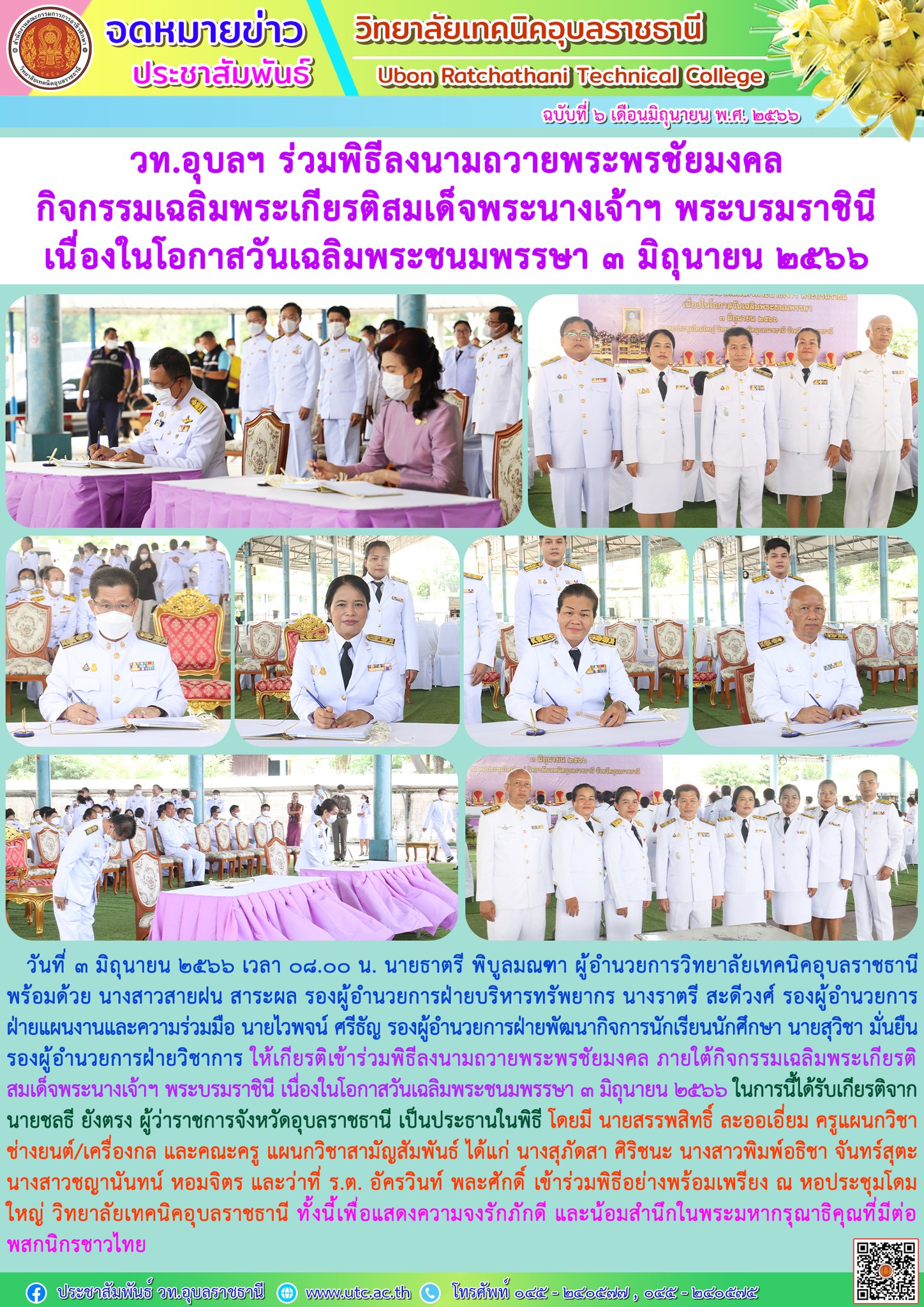 วท.อุบลฯ ร่วมพิธีลงนามถวายพระพรชัยมงคลกิจกรรมเฉลิมพระเกียรติสมเด็จพระนางเจ้าฯ พระบรมราชินี เนื่องในโอกาสวันเฉลิมพระชนมพรรษา ๓ มิถุนายน ๒๕๖๖