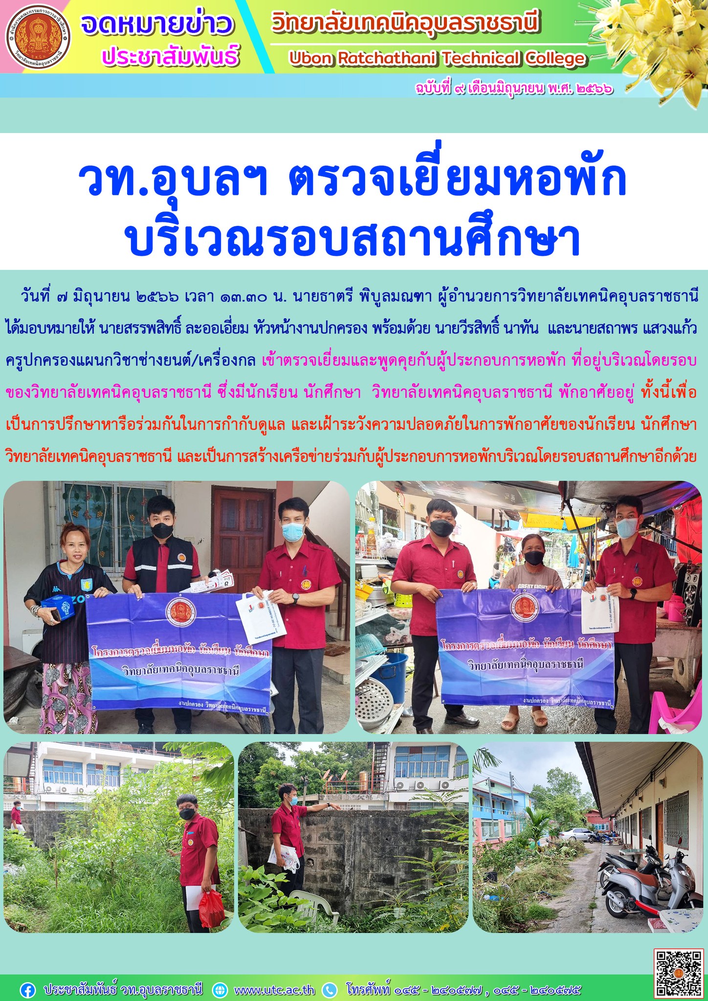 วันที่ ๗ มิถุนายน ๒๕๖๖ เวลา ๑๓.๓๐ น. นายธาตรี พิบูลมณฑา ผู้อำนวยการวิทยาลัยเทคนิคอุบลราชธานี ได้มอบหมายให้ นายสรรพสิทธิ์ ละออเอี่ยม หัวหน้างานปกครอง พร้อมด้วย นายวีรสิทธิ์ นาทัน และนายสถาพร แสวงแก้ว ครูปกครองแผนกวิชาช่างยนต์/เครื่องกล เข้าตรวจเยี่ยมและพูดคุยกับผู้ประกอบการหอพัก ที่อยู่บริเวณโดยรอบของวิทยาลัยเทคนิคอุบลราชธานี ซึ่งมีนักเรียน นักศึกษา วิทยาลัยเทคนิคอุบลราชธานี พักอาศัยอยู่ ทั้งนี้เพื่อเป็นการปรึกษาหารือร่วมกันในการกำกับดูแล และเฝ้าระวังความปลอดภัยในการพักอาศัยของนักเรียน นักศึกษา วิทยาลัยเทคนิคอุบลราชธานี และเป็นการสร้างเครือข่ายร่วมกับผู้ประกอบการหอพักบริเวณโดยรอบสถานศึกษาอีกด้วย