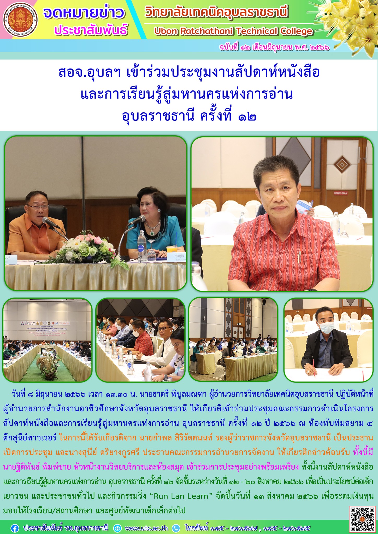 วันที่ ๘ มิถุนายน ๒๕๖๖ เวลา ๑๓.๓๐ น. นายธาตรี พิบูลมณฑา ผู้อำนวยการวิทยาลัยเทคนิคอุบลราชธานี ปฏิบัติหน้าที่ ผู้อำนวยการสำนักงานอาชีวศึกษาจังหวัดอุบลราชธานี ให้เกียรติเข้าร่วมประชุมคณะกรรมการดำเนินโครงการสัปดาห์หนังสือและการเรียนรู้สู่มหานครแห่งการอ่าน อุบลราชธานี ครั้งที่ ๑๒ ปี ๒๕๖๖ ณ ห้องทับทิมสยาม ๔ ตึกสุนีย์ทาวเวอร์ ในการนี้ได้รับเกียรติจาก นายกำพล สิริรัตตนนท์ รองผู้ว่าราชการจังหวัดอุบลราชธานี เป็นประธานเปิดการประชุม และนางสุนีย์ ดริยางกูรศรี ประธานคณะกรรมการอำนวยการจัดงาน ให้เกียรติกล่าวต้อนรับ ทั้งนี้มี นายฐิติพันธ์ พิมพ์ชาย หัวหน้างานวิทยบริการและห้องสมุด เข้าร่วมการประชุมอย่างพร้อมเพรียง ทั้งนี้งานสัปดาห์หนังสือและการเรียนรู้สู่มหานครแห่งการอ่าน อุบลราชธานี ครั้งที่ ๑๒ จัดขึ้นระหว่างวันที่ ๑๒ – ๒๐ สิงหาคม ๒๕๖๖ เพื่อเป็นประโยชน์ต่อเด็ก เยาวชน และประชาชนทั่วไป และกิจกรรมวิ่ง “Run Lan Learn” จัดขึ้นวันที่ ๑๓ สิงหาคม ๒๕๖๖ เพื่อระดมเงินทุนมอบให้โรงเรียน/สถานศึกษา และศูนย์พัฒนาเด็กเล็กต่อไป