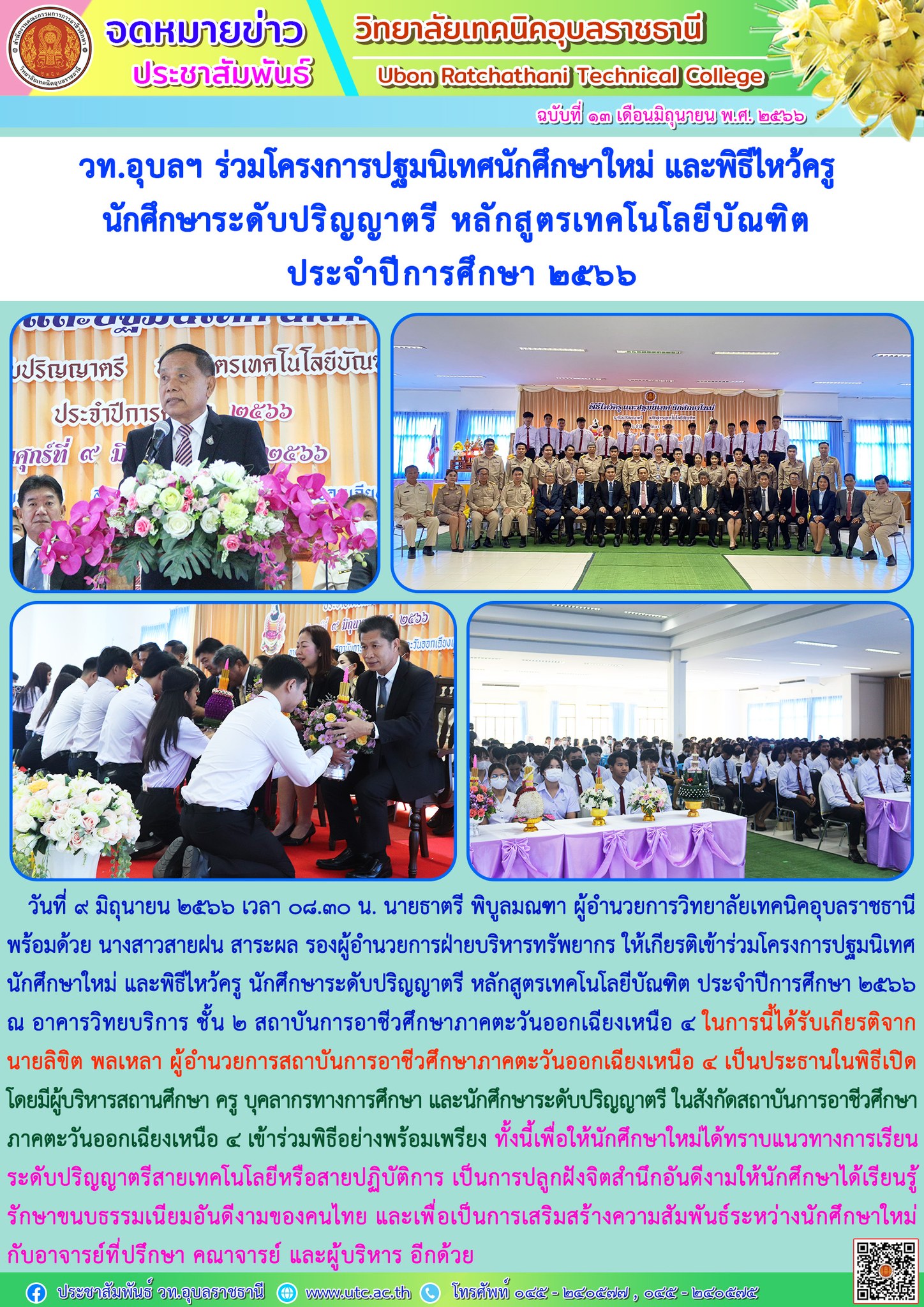 วันที่ ๙ มิถุนายน ๒๕๖๖ เวลา ๐๘.๓๐ น. นายธาตรี พิบูลมณฑา ผู้อำนวยการวิทยาลัยเทคนิคอุบลราชธานี พร้อมด้วย นางสาวสายฝน สาระผล รองผู้อำนวยการฝ่ายบริหารทรัพยากร ให้เกียรติเข้าร่วมโครงการปฐมนิเทศนักศึกษาใหม่ และพิธีไหว้ครู นักศึกษาระดับปริญญาตรี หลักสูตรเทคโนโลยีบัณฑิต ประจำปีการศึกษา ๒๕๖๖ ณ อาคารวิทยบริการ ชั้น ๒ สถาบันการอาชีวศึกษาภาคตะวันออกเฉียงเหนือ ๔ ในการนี้ได้รับเกียรติจาก นายลิขิต พลเหลา ผู้อำนวยการสถาบันการอาชีวศึกษาภาคตะวันออกเฉียงเหนือ ๔ เป็นประธานในพิธีเปิด โดยมีผู้บริหารสถานศึกษา ครู บุคลากรทางการศึกษา และนักศึกษาระดับปริญญาตรี ในสังกัดสถาบันการอาชีวศึกษาภาคตะวันออกเฉียงเหนือ ๔ เข้าร่วมพิธีอย่างพร้อมเพรียง ทั้งนี้เพื่อให้นักศึกษาใหม่ได้ทราบแนวทางการเรียนระดับปริญญาตรีสายเทคโนโลยีหรือสายปฏิบัติการ เป็นการปลูกฝังจิตสำนึกอันดีงามให้นักศึกษาได้เรียนรู้รักษาขนบธรรมเนียมอันดีงามของคนไทย และเพื่อเป็นการเสริมสร้างความสัมพันธ์ระหว่างนักศึกษาใหม่กับอาจารย์ที่ปรึกษา คณาจารย์ และผู้บริหาร อีกด้วย