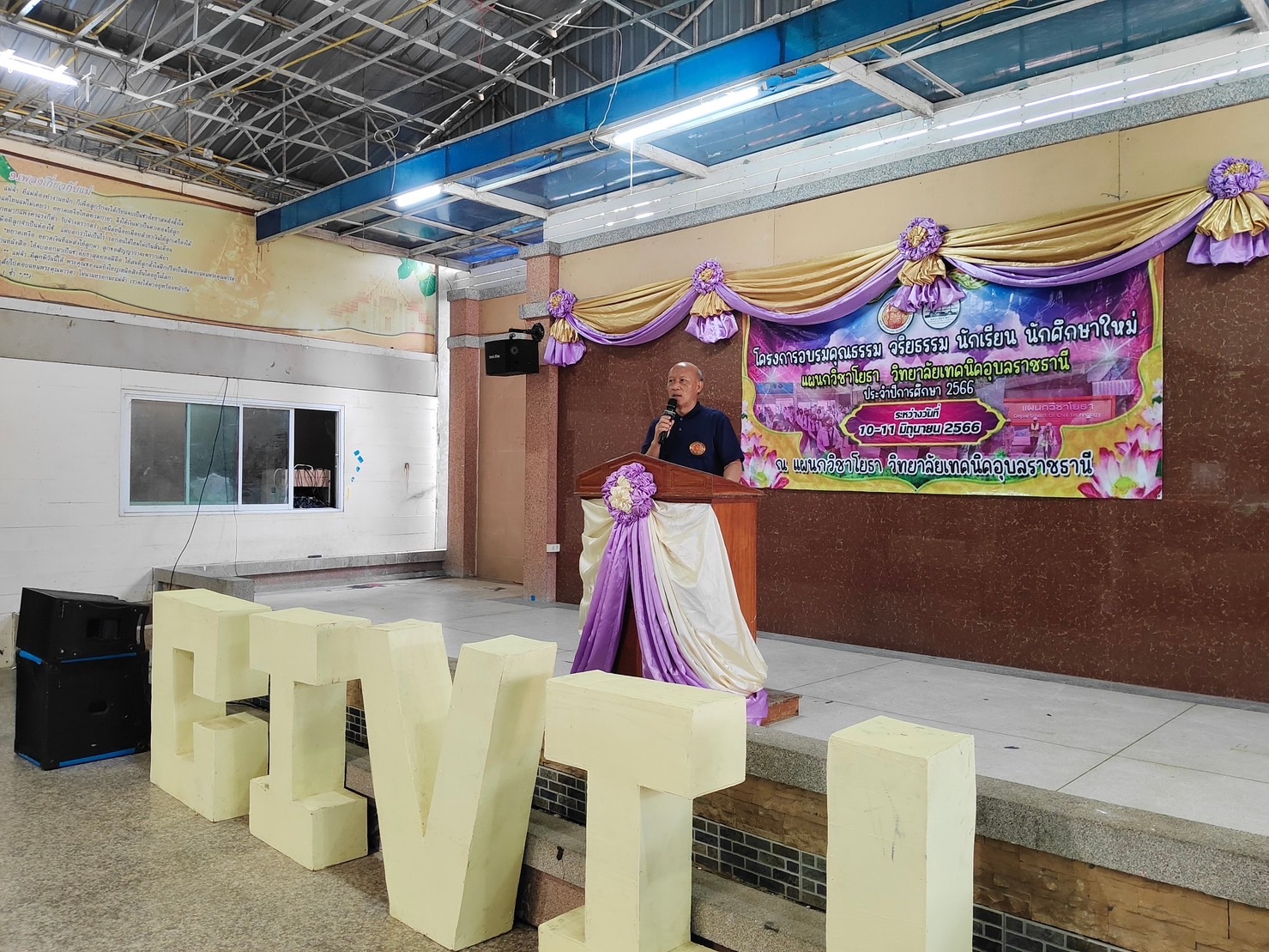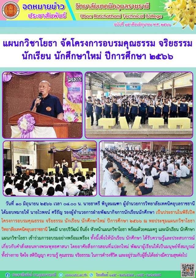 วันที่ ๑๐ มิถุนายน ๒๕๖๖ เวลา ๐๘.๐๐ น. นายธาตรี พิบูลมณฑา ผู้อำนวยการวิทยาลัยเทคนิคอุบลราชธานี ได้มอบหมายให้ นายไวพจน์ ศรีธัญ รองผู้อำนวยการฝ่ายพัฒนากิจการนักเรียนนักศึกษา เป็นประธานในพิธีเปิดโครงการอบรมคุณธรรม จริยธรรม นักเรียน นักศึกษาใหม่ ปีการศึกษา ๒๕๖๖ ณ หอประชุมแผนกวิชาโยธา วิทยาลัยเทคนิคอุบลราชธานี โดยมี นายปริวัฒน์ ยืนยิ่ง หัวหน้าแผนกวิชาโยธา พร้อมด้วยคณะครู และนักเรียน นักศึกษา แผนกวิชาโยธา เข้าร่วมการอบรมอย่างพร้อมเพรียง ทั้งนี้เพื่อให้นักเรียน นักศึกษา ได้รับความรู้และประสบการณ์เกี่ยวกับคำสั่งสอนทางพระพุทธศาสนา โดยอาศัยสื่อการสอนที่แปลกใหม่ พัฒนาผู้เรียนให้เป็นมนุษย์ที่สมบูรณ์ ทั้งร่างกาย จิตใจ สติปัญญา ความรู้ คุณธรรม จริยธรรม ในการดำรงชีวิต และอยู่ร่วมกับผู้อื่นได้อย่างมีความสุขต่อไป