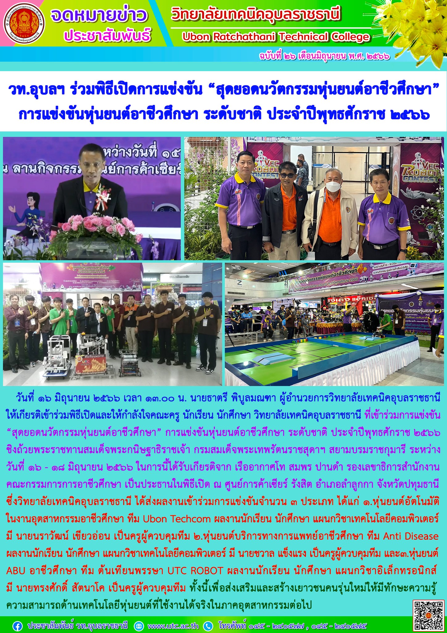 วันที่ ๑๖ มิถุนายน ๒๕๖๖ เวลา ๑๓.๐๐ น. นายธาตรี พิบูลมณฑา ผู้อำนวยการวิทยาลัยเทคนิคอุบลราชธานี ให้เกียรติเข้าร่วมพิธีเปิดและให้กำลังใจคณะครู นักเรียน นักศึกษา วิทยาลัยเทคนิคอุบลราชธานี ที่เข้าร่วมการแข่งขัน “สุดยอดนวัตกรรมหุ่นยนต์อาชีวศึกษา” การแข่งขันหุ่นยนต์อาชีวศึกษา ระดับชาติ ประจำปีพุทธศักราช ๒๕๖๖ ชิงถ้วยพระราชทานสมเด็จพระกนิษฐาธิราชเจ้า กรมสมเด็จพระเทพรัตนราชสุดาฯ สยามบรมราชกุมารี ระหว่างวันที่ ๑๖ – ๑๘ มิถุนายน ๒๕๖๖ ในการนี้ได้รับเกียรติจาก เรืออากาศโท สมพร ปานดำ รองเลขาธิการสำนักงานคณะกรรมการการอาชีวศึกษา เป็นประธานในพิธีเปิด ณ ศูนย์การค้าเซียร์ รังสิต อำเภอลำลูกกา จังหวัดปทุมธานี ซึ่งวิทยาลัยเทคนิคอุบลราชธานี ได้ส่งผลงานเข้าร่วมการแข่งขันจำนวน ๓ ประเภท ได้แก่ ๑.หุ่นยนต์อัตโนมัติในงานอุตสาหกรรมอาชีวศึกษา ทีม Ubon Techcom ผลงานนักเรียน นักศึกษา แผนกวิชาเทคโนโลยีคอมพิวเตอร์ มี นายนราวัฒน์ เขียวอ่อน เป็นครูผู้ควบคุมทีม ๒.หุ่นยนต์บริการทางการแพทย์อาชีวศึกษา ทีม Anti Disease ผลงานนักเรียน นักศึกษา แผนกวิชาเทคโนโลยีคอมพิวเตอร์ มี นายชวาล แข็งแรง เป็นครูผู้ควบคุมทีม และ๓.หุ่นยนต์ ABU อาชีวศึกษา ทีม ต้นเทียนพรรษา UTC ROBOT ผลงานนักเรียน นักศึกษา แผนกวิชาอิเล็กทรอนิกส์ มี นายทรงศักดิ์ สัตนาโค เป็นครูผู้ควบคุมทีม ทั้งนี้เพื่อส่งเสริมและสร้างเยาวชนคนรุ่นใหม่ให้มีทักษะความรู้ความสามารถด้านเทคโนโลยีหุ่นยนต์ที่ใช้งานได้จริงในภาคอุตสาหกรรมต่อไป