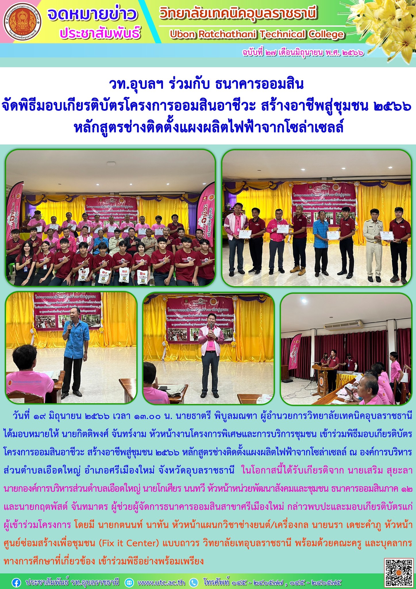 วท.อุบลฯ ร่วมกับ ธนาคารออมสิน จัดพิธีมอบเกียรติบัตรโครงการออมสินอาชีวะ สร้างอาชีพสู่ชุมชน ๒๕๖๖ หลักสูตรช่างติดตั้งแผงผลิตไฟฟ้าจากโซล่าเซลล์