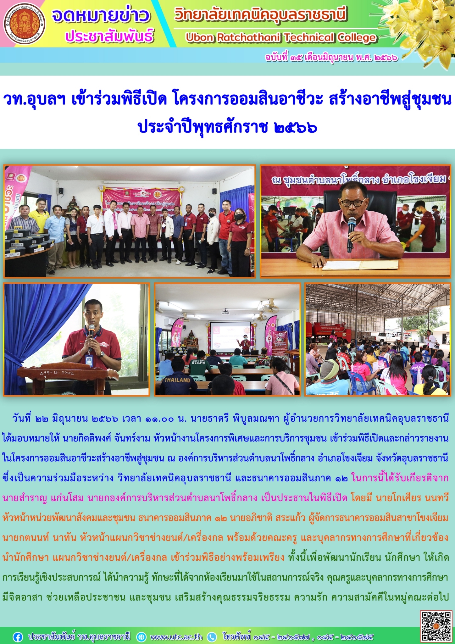 วันที่ ๒๒ มิถุนายน ๒๕๖๖ เวลา ๑๑.๐๐ น. นายธาตรี พิบูลมณฑา ผู้อำนวยการวิทยาลัยเทคนิคอุบลราชธานี ได้มอบหมายให้ นายกิตติพงศ์ จันทร์งาม หัวหน้างานโครงการพิเศษและการบริการชุมชน เข้าร่วมพิธีเปิดและกล่าวรายงานในโครงการออมสินอาชีวะ สร้างอาชีพสู่ชุมชน ณ องค์การบริหารส่วนตำบลนาโพธิ์กลาง อำเภอโขงเจียม จังหวัดอุบลราชธานี ซึ่งเป็นความร่วมมือระหว่าง วิทยาลัยเทคนิคอุบลราชธานี และธนาคารออมสินภาค ๑๒ ในการนี้ได้รับเกียรติจาก นายสำราญ แก่นโสม นายกองค์การบริหารส่วนตำบลนาโพธิ์กลาง เป็นประธานในพิธีเปิดโดยมี นายโกเศียร นนทวี หัวหน้าหน่วยพัฒนาสังคมและชุมชน ธนาคารออมสินภาค ๑๒ นายอภิชาติ สระแก้ว ผู้จัดการธนาคารออมสินสาขาโขงเจียม นายกตนนท์ นาทัน หัวหน้าแผนกวิชาช่างยนต์/เครื่องกล พร้อมด้วยคณะครู และบุคลากรทางการศึกษาที่เกี่ยวข้อง นำนักศึกษา แผนกวิชาช่างยนต์/เครื่องกล เข้าร่วมพิธีอย่างพร้อมเพรียง ทั้งนี้เพื่อพัฒนานักเรียน นักศึกษา ให้เกิดการเรียนรู้เชิงประสบการณ์ ได้นำความรู้ ทักษะที่ได้จากห้องเรียนมาใช้ในสถานการณ์จริง คุณครูและบุคลากรทางการศึกษา มีจิตอาสา ช่วยเหลือประชาชน และชุมชน เสริมสร้างคุณธรรมจริยธรรม ความรัก ความสามัคคีในหมู่คณะต่อไป
