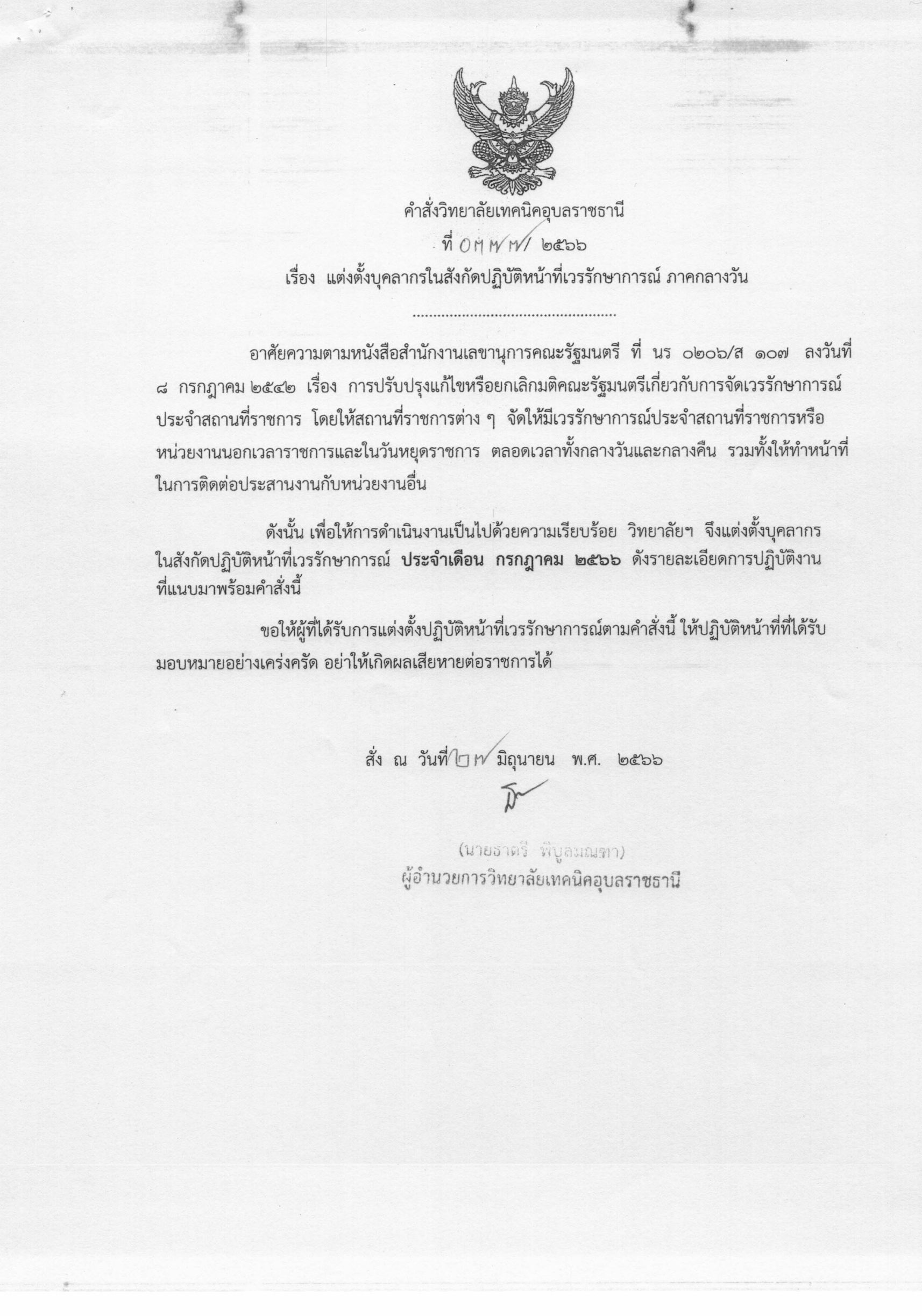 แต่งตั้งบุคคลากรในสังกัดปฏิบัติหน้าที่เวรรักษาการณ์ ภาคกลางวัน ประจำเดือนมิถุนายน 2566