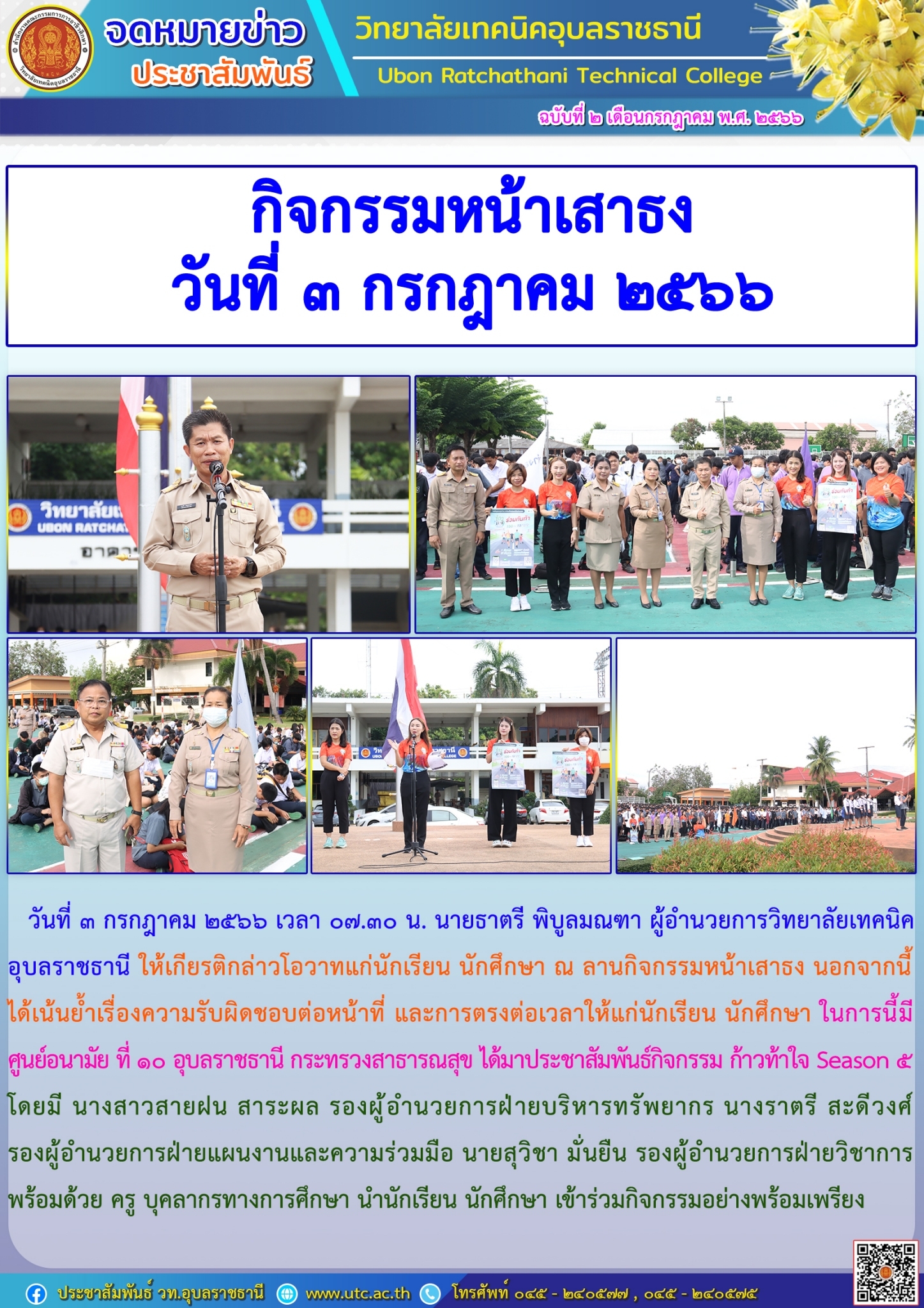 วันที่ ๓ กรกฎาคม ๒๕๖๖ เวลา ๐๗.๓๐ น. นายธาตรี พิบูลมณฑา ผู้อำนวยการวิทยาลัยเทคนิคอุบลราชธานี ให้เกียรติกล่าวโอวาทแก่นักเรียน นักศึกษา ณ ลานกิจกรรมหน้าเสาธง นอกจากนี้ได้เน้นย้ำเรื่องความรับผิดชอบต่อหน้าที่ และการตรงต่อเวลาให้แก่นักเรียน นักศึกษา ในการนี้มี ศูนย์อนามัย ที่ ๑๐ อุบลราชธานี กระทรวงสาธารณสุข ได้มา ประชาสัมพันธ์กิจกรรม ก้าวท้าใจ Season ๕ โดยมี นางสาวสายฝน สาระผล รองผู้อำนวยการฝ่ายบริหารทรัพยากร นางราตรี สะดีวงศ์ รองผู้อำนวยการฝ่ายแผนงานและความร่วมมือ นายสุวิชา มั่นยืน รองผู้อำนวยการฝ่ายวิชาการ พร้อมด้วย ครู บุคลากรทางการศึกษา นำนักเรียน นักศึกษา เข้าร่วมกิจกรรมอย่างพร้อมเพรียง