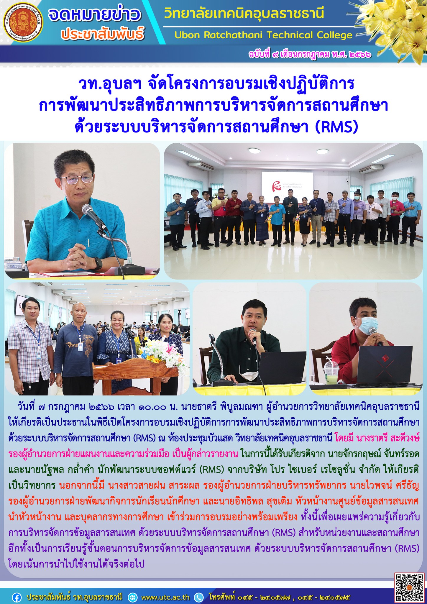 วันที่ ๗ กรกฎาคม ๒๕๖๖ เวลา ๑๐.๐๐ น. นายธาตรี พิบูลมณฑา ผู้อำนวยการวิทยาลัยเทคนิคอุบลราชธานี ให้เกียรติเป็นประธานในพิธีเปิด โครงการอบรมเชิงปฏิบัติการการพัฒนาประสิทธิภาพการบริหารจัดการสถานศึกษา ด้วยระบบบริหารจัดการสถานศึกษา (RMS) ณ ห้องประชุมบัวแสด วิทยาลัยเทคนิคอุบลราชธานี โดยมี นางราตรี สะดีวงษ์ รองผู้อำนวยการฝ่ายแผนงานและความร่วมมือ เป็นผู้กล่าวรายงาน ในการนี้ได้รับเกียรติจาก นายจักรกฤษณ์ จันทร์รอด และนายนัฐพล กล่ำคำ นักพัฒนาระบบซอฟต์แวร์ (RMS) จากบริษัท โปร ไซเบอร์ เรโซลูชั่น จำกัด ให้เกียรติเป็นวิทยากร นอกจากนี้มี นางสาวสายฝน สาระผล รองผู้อำนวยการฝ่ายบริหารทรัพยากร นายไวพจน์ ศรีธัญ รองผู้อำนวยการฝ่ายพัฒนากิจการนักเรียนนักศึกษา และนายอิทธิพล สุขเติม หัวหน้างานศูนย์ข้อมูลสารสนเทศ นำหัวหน้างาน และบุคลากรทางการศึกษา เข้าร่วมการอบรมอย่างพร้อมเพรียง ทั้งนี้เพื่อเผยแพร่ความรู้เกี่ยวกับการบริหารจัดการข้อมูลสารสนเทศ ด้วยระบบบริหารจัดการสถานศึกษา (RMS) สำหรับหน่วยงานและสถานศึกษา อีกทั้งเป็นการเรียนรู้ขั้นตอนการบริหารจัดการข้อมูลสารสนเทศ ด้วยระบบบริหารจัดการสถานศึกษา (RMS) โดยเน้นการนำไปใช้งานได้จริงต่อไป