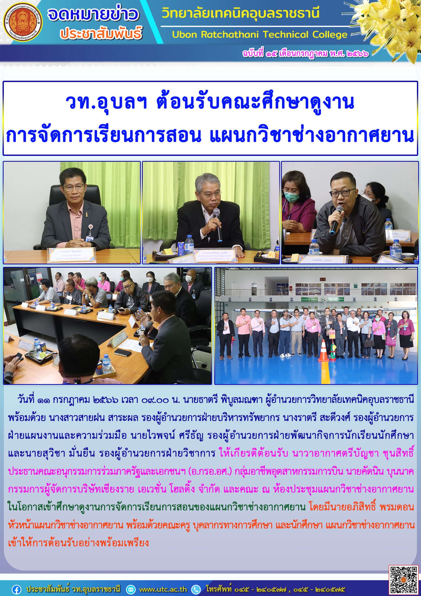 วันที่ ๑๑ กรกฎาคม ๒๕๖๖ เวลา ๐๙.๐๐ น. นายธาตรี พิบูลมณฑา ผู้อำนวยการวิทยาลัยเทคนิคอุบลราชธานี พร้อมด้วย นางสาวสายฝน สาระผล รองผู้อำนวยการฝ่ายบริหารทรัพยากร นางราตรี สะดีวงศ์ รองผู้อำนวยการฝ่ายแผนงานและความร่วมมือ นายไวพจน์ ศรีธัญ รองผู้อำนวยการฝ่ายพัฒนากิจการนักเรียนนักศึกษา และนายสุวิชา มั่นยืน รองผู้อำนวยการฝ่ายวิชาการ ให้เกียรติต้อนรับ นาวาอากาศตรีบัญชา ชุนสิทธิ์ ประธานคณะอนุกรรมการร่วมภาครัฐและเอกชนฯ (อ.กรอ.อศ.) กลุ่มอาชีพอุตสาหกรรมการบิน นายคัดนิน บุนนาค กรรมการผู้จัดการบริษัทเชียงราย เอเวชั่น โฮลดิ้ง จำกัด และคณะ ณ ห้องประชุมแผนกวิชาช่างอากาศยาน ในโอกาสเข้าศึกษาดูงานการจัดการเรียนการสอนของแผนกวิชาช่างอากาศยาน โดยมีนายอภิสิทธิ์ พรมดอน หัวหน้าแผนกวิชาช่างอากาศยาน พร้อมด้วยคณะครู บุคลากรทางการศึกษา และนักศึกษา แผนกวิชาช่างอากาศยาน เข้าให้การต้อนรับอย่างพร้อมเพรียง