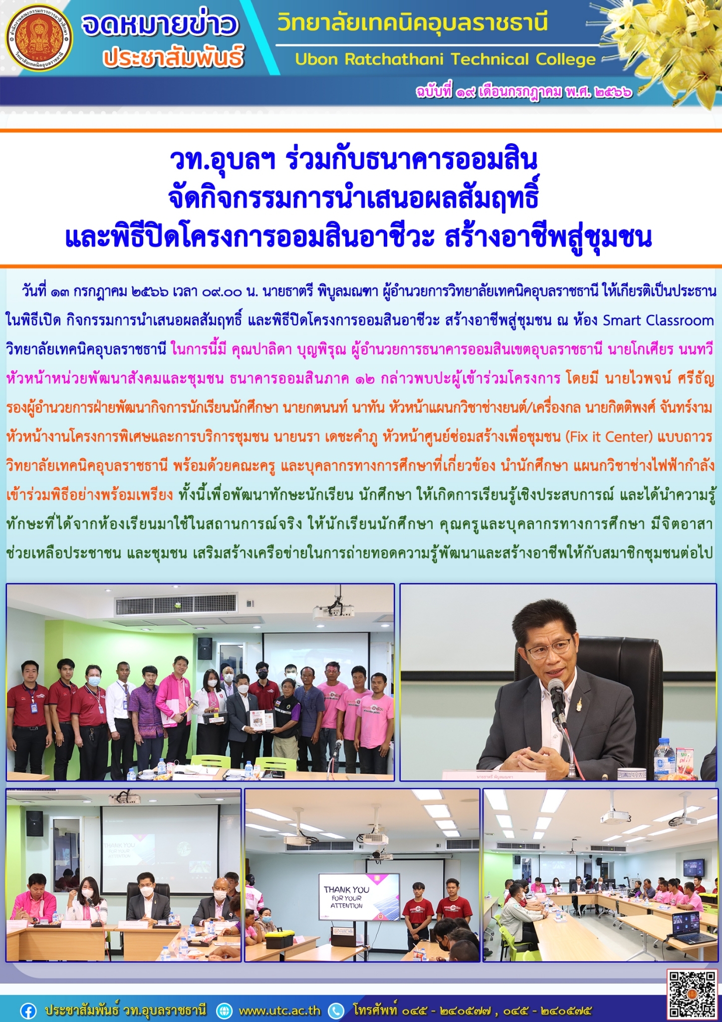 วันที่ ๑๓ กรกฎาคม ๒๕๖๖ เวลา ๐๙.๐๐ น. นายธาตรี พิบูลมณฑา ผู้อำนวยการวิทยาลัยเทคนิคอุบลราชธานี ให้เกียรติเป็นประธานในพิธีเปิด กิจกรรมการนำเสนอผลสัมฤทธิ์ และพิธีปิดโครงการออมสินอาชีวะ สร้างอาชีพสู่ชุมชน ณ ห้อง Smart Classroom วิทยาลัยเทคนิคอุบลราชธานี ในการนี้มี คุณปาลิดา บุญพิรุณ ผู้อำนวยการธนาคารออมสินเขตอุบลราชธานี นายโกเศียร นนทวี หัวหน้าหน่วยพัฒนาสังคมและชุมชน ธนาคารออมสินภาค ๑๒ กล่าวพบปะผู้เข้าร่วมโครงการ โดยมี นายไวพจน์ ศรีธัญ รองผู้อำนวยการฝ่ายพัฒนากิจการนักเรียนนักศึกษา นายกตนนท์ นาทัน หัวหน้าแผนกวิชาช่างยนต์/เครื่องกล นายกิตติพงศ์ จันทร์งาม หัวหน้างานโครงการพิเศษและการบริการชุมชน นายนรา เดชะคำภู หัวหน้าศูนย์ซ่อมสร้างเพื่อชุมชน (Fix it Center) แบบถาวร วิทยาลัยเทคนิคอุบลราชธานี พร้อมด้วยคณะครู และบุคลากรทางการศึกษาที่เกี่ยวข้อง นำนักศึกษา แผนกวิชาช่างไฟฟ้ากำลัง เข้าร่วมพิธีอย่างพร้อมเพรียง ทั้งนี้เพื่อพัฒนาทักษะนักเรียน นักศึกษา ให้เกิดการเรียนรู้เชิงประสบการณ์ และได้นำความรู้ ทักษะที่ได้จากห้องเรียนมาใช้ในสถานการณ์จริง ให้นักเรียน นักศึกษา คุณครูและบุคลากรทางการศึกษา มีจิตอาสา ช่วยเหลือประชาชน และชุมชน เสริมสร้างเครือข่ายในการถ่ายทอดความรู้พัฒนาและสร้างอาชีพให้กับสมาชิกชุมชนต่อไป