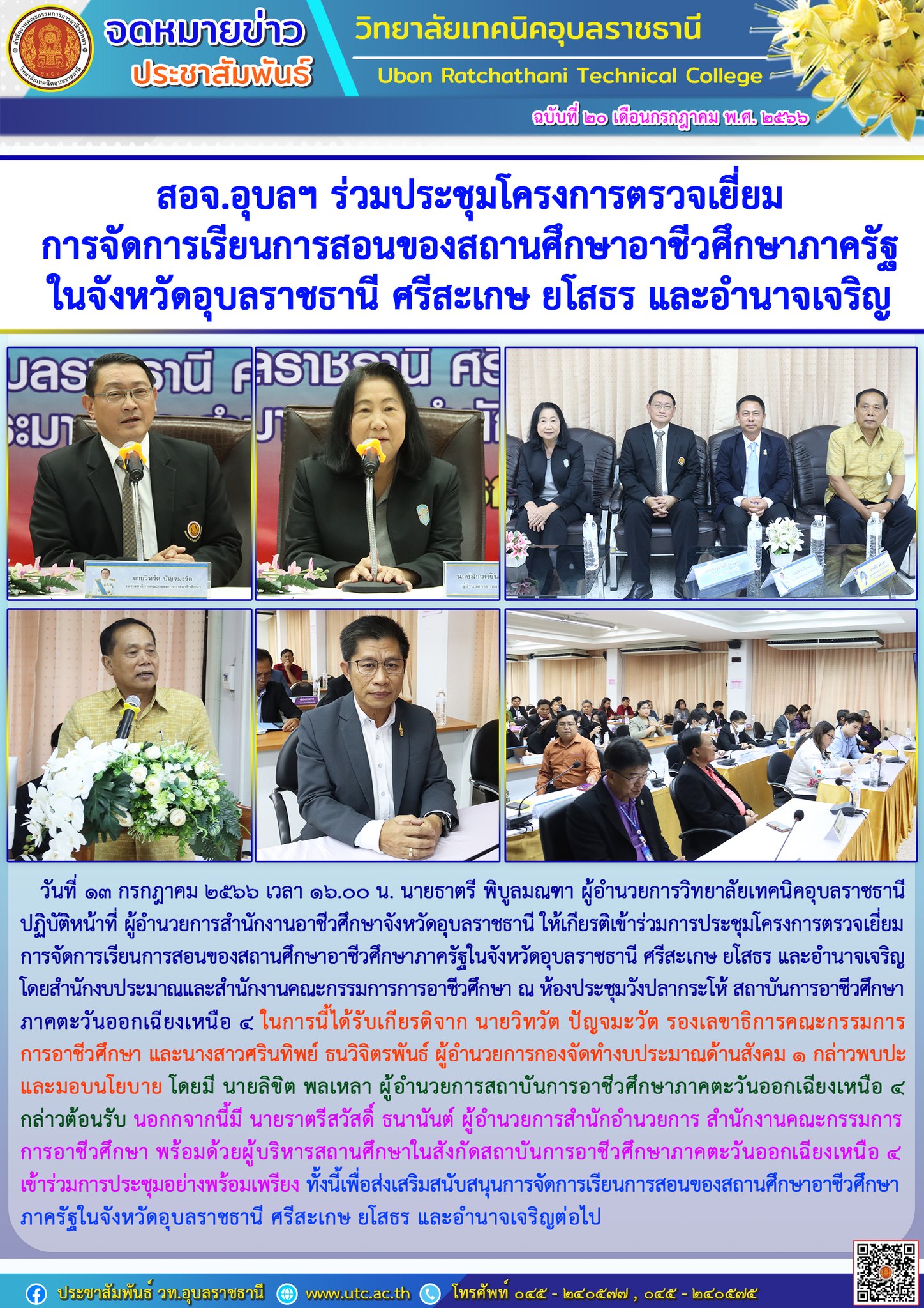 วันที่ ๑๓ กรกฎาคม ๒๕๖๖ เวลา ๑๖.๐๐ น. นายธาตรี พิบูลมณฑา ผู้อำนวยการวิทยาลัยเทคนิคอุบลราชธานี ปฏิบัติหน้าที่ ผู้อำนวยการสำนักงานอาชีวศึกษาจังหวัดอุบลราชธานี ให้เกียรติเข้าร่วมการประชุมโครงการตรวจเยี่ยมการจัดการเรียนการสอนของสถานศึกษาอาชีวศึกษาภาครัฐในจังหวัดอุบลราชธานี ศรีสะเกษ ยโสธร และอำนาจเจริญ โดยสำนักงบประมาณและสำนักงานคณะกรรมการการอาชีวศึกษา ณ ห้องประชุมวังปลากระโห้ สถาบันการอาชีวศึกษาภาคตะวันออกเฉียงเหนือ ๔ ในการนี้ได้รับเกียรติจาก นายวิทวัต ปัญจมะวัต รองเลขาธิการคณะกรรมการการอาชีวศึกษา และนางสาวศรินทิพย์ ธนวิจิตรพันธ์ ผู้อำนวยการกองจัดทำงบประมาณด้านสังคม ๑ กล่าวพบปะและมอบนโยบาย โดยมี นายลิขิต พลเหลา ผู้อำนวยการสถาบันการอาชีวศึกษาภาคตะวันออกเฉียงเหนือ ๔ กล่าวต้อนรับ นอกกจากนี้มี นายราตรีสวัสดิ์ ธนานันต์ ผู้อำนวยการสำนักอำนวยการ สำนักงานคณะกรรมการการอาชีวศึกษา พร้อมด้วยผู้บริหารสถานศึกษาในสังกัดสถาบันการอาชีวศึกษาภาคตะวันออกเฉียงเหนือ ๔ เข้าร่วมการประชุมอย่างพร้อมเพรียง ทั้งนี้เพื่อส่งเสริมสนับสนุนการจัดการเรียนการสอนของสถานศึกษาอาชีวศึกษาภาครัฐในจังหวัดอุบลราชธานี ศรีสะเกษ ยโสธร และอำนาจเจริญต่อไป
