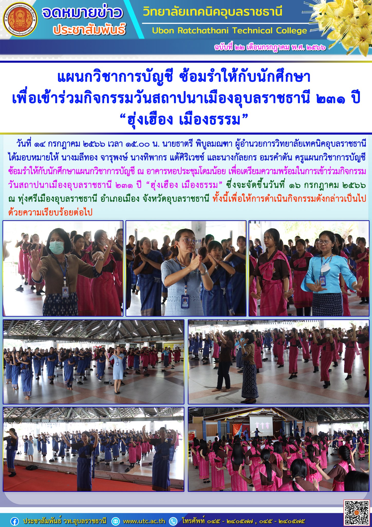 วันที่ ๑๔ กรกฎาคม ๒๕๖๖ เวลา ๑๕.๐๐ น. นายธาตรี พิบูลมณฑา ผู้อำนวยการวิทยาลัยเทคนิคอุบลราชธานี ได้มอบหมายให้ นางมลีทอง จารุพงษ์ นางทิพากร แต้ศิริเวชช์ และนางกัลยกร อมรคำตัน ครูแผนกวิชาการบัญชี ซ้อมรำให้กับนักศึกษาแผนกวิชาการบัญชี ณ อาคารหอประชุมโดมน้อย เพื่อเตรียมความพร้อมในการเข้าร่วมกิจกรรมวันสถาปนาเมืองอุบลราชธานี ๒๓๑ ปี “ฮุ่งเฮือง เมืองธรรม” ซึ่งจะจัดขึ้นวันที่ ๑๖ กรกฎาคม ๒๕๖๖ ณ ทุ่งศรีเมืองอุบลราชธานี อำเภอเมือง จังหวัดอุบลราชธานี ทั้งนี้เพื่อให้การดำเนินกิจกรรมดังกล่าวเป็นไปด้วยความเรียบร้อยต่อไป