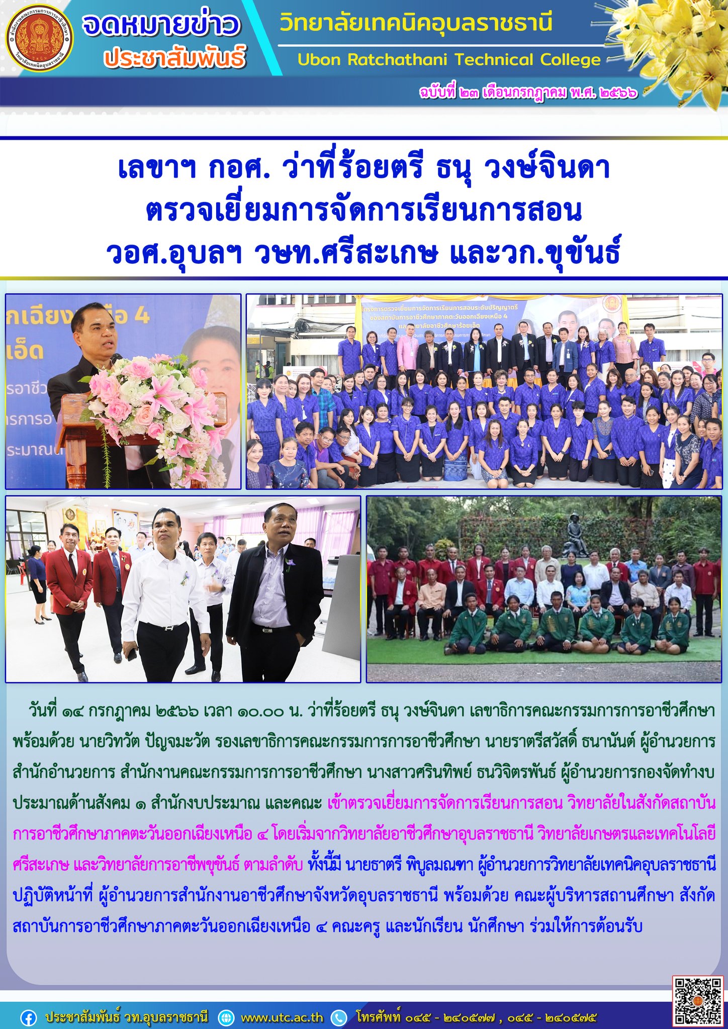 วันที่ ๑๔ กรกฎาคม ๒๕๖๖ เวลา ๑๐.๐๐ น. ว่าที่ร้อยตรี ธนุ วงษ์จินดา เลขาธิการคณะกรรมการการอาชีวศึกษา พร้อมด้วย นายวิทวัต ปัญจมะวัต รองเลขาธิการคณะกรรมการการอาชีวศึกษา นายราตรีสวัสดิ์ ธนานันต์ ผู้อำนวยการสำนักอำนวยการ สำนักงานคณะกรรมการการอาชีวศึกษา นางสาวศรินทิพย์ ธนวิจิตรพันธ์ ผู้อำนวยการกองจัดทำงบประมาณด้านสังคม ๑ สำนักงบประมาณ และคณะ เข้าตรวจเยี่ยมการจัดการเรียนการสอน วิทยาลัยในสังกัดสถาบันการอาชีวศึกษาภาคตะวันออกเฉียงเหนือ ๔ โดยเริ่มจากวิทยาลัยอาชีวศึกษาอุบลราชธานี วิทยาลัยเกษตรและเทคโนโลยีศรีสะเกษ และวิทยาลัยการอาชีพขุขันธ์ ตามลำดับ ทั้งนี้มี นายธาตรี พิบูลมณฑา ผู้อำนวยการวิทยาลัยเทคนิคอุบลราชธานี ปฏิบัติหน้าที่ ผู้อำนวยการสำนักงานอาชีวศึกษาจังหวัดอุบลราชธานี พร้อมด้วย คณะผู้บริหารสถานศึกษา สังกัดสถาบันการอาชีวศึกษาภาคตะวันออกเฉียงเหนือ ๔ คณะครู และนักเรียน นักศึกษา ร่วมให้การต้อนรับ