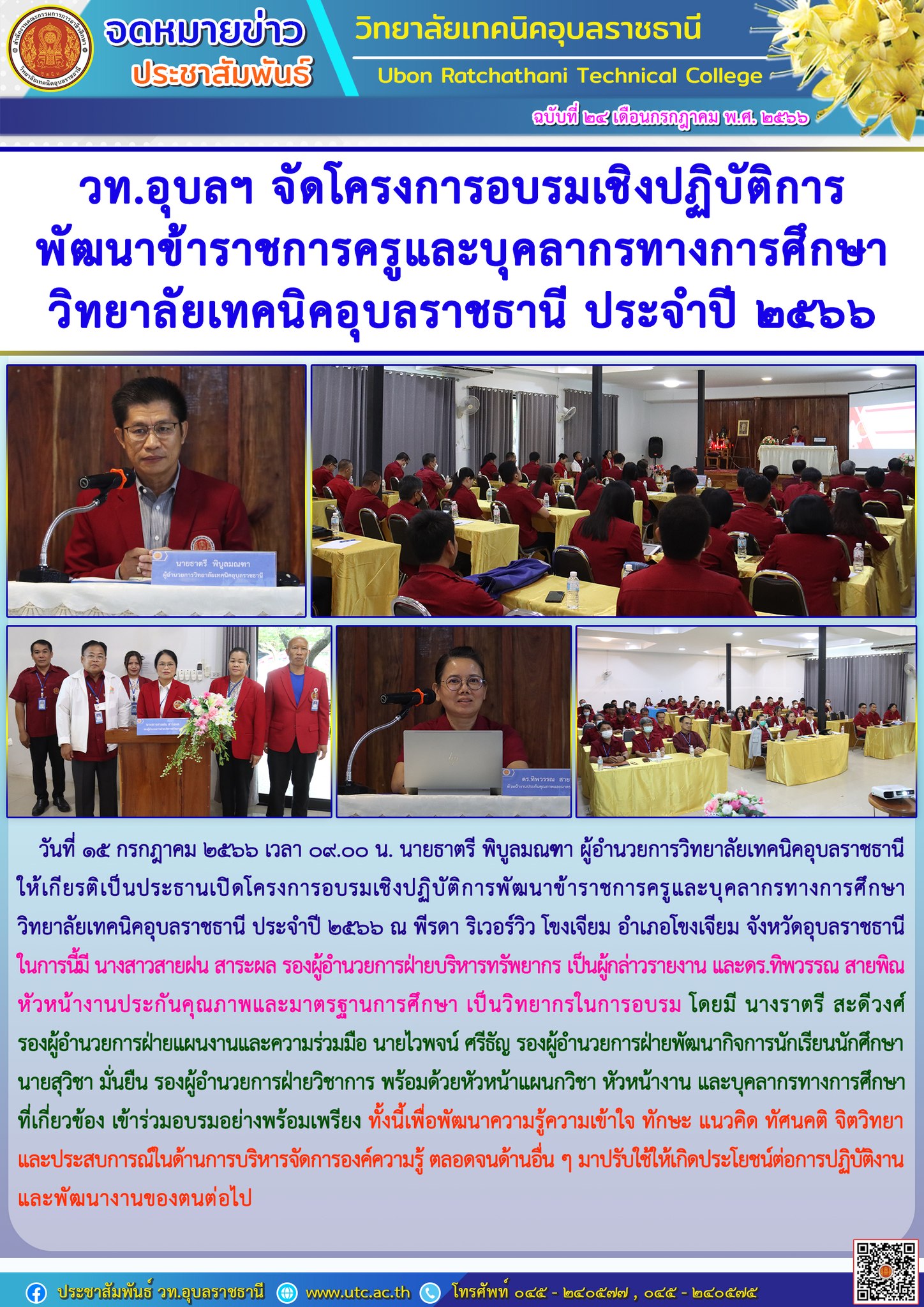 วท.อุบลฯ จัดโครงการอบรมเชิงปฏิบัติการพัฒนาข้าราชการครูและบุคลากรทางการศึกษา วิทยาลัยเทคนิคอุบลราชธานี ประจำปี ๒๕๖๖