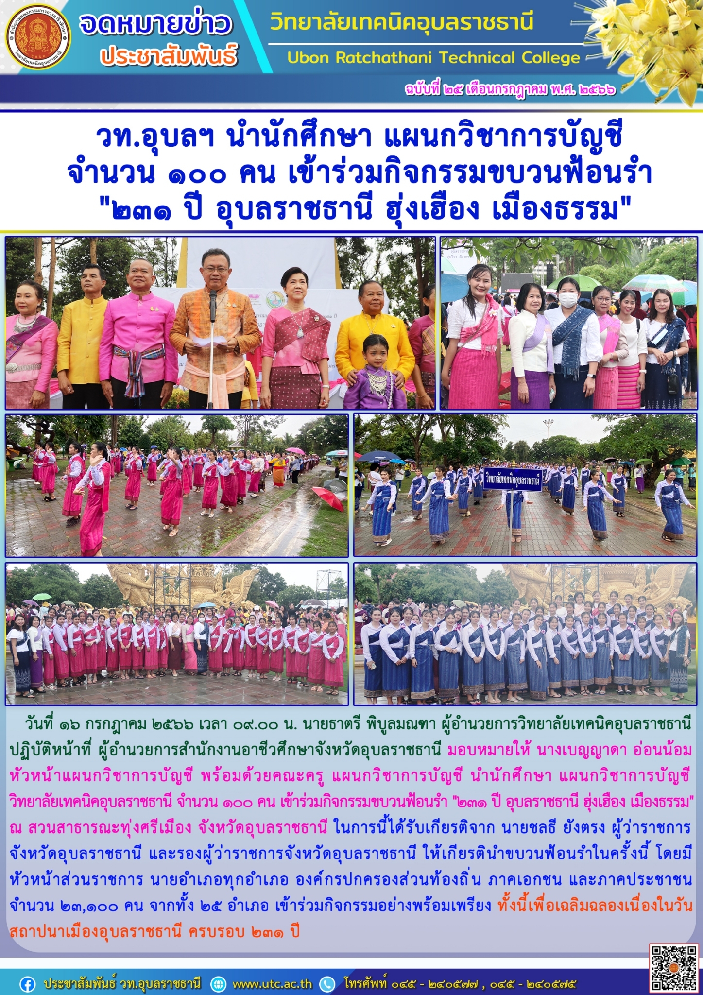วันที่ ๑๖ กรกฎาคม ๒๕๖๖ เวลา ๐๙.๐๐ น. นายธาตรี พิบูลมณฑา ผู้อำนวยการวิทยาลัยเทคนิคอุบลราชธานีปฏิบัติหน้าที่ ผู้อำนวยการสำนักงานอาชีวศึกษาจังหวัดอุบลราชธานี มอบหมายให้ นางเบญญาดา อ่อนน้อมหัวหน้าแผนกวิชาการบัญชี พร้อมด้วยคณะครู แผนกวิชาการบัญชี นำนักศึกษา แผนกวิชาการบัญชี วิทยาลัยเทคนิคอุบลราชธานี จำนวน ๑๐๐ คน เข้าร่วมกิจกรรมขบวนฟ้อนรำ “๒๓๑ ปี อุบลราชธานี ฮุ่งเฮือง เมืองธรรม” ณ สวนสาธารณะทุ่งศรีเมือง จังหวัดอุบลราชธานี ในการนี้ได้รับเกียรติจาก นายชลธี ยังตรง ผู้ว่าราชการจังหวัดอุบลราชธานี และรองผู้ว่าราชการจังหวัดอุบลราชธานี ให้เกียรตินำขบวนฟ้อนรำในครั้งนี้ โดยมีหัวหน้าส่วนราชการ นายอำเภอทุกอำเภอ องค์กรปกครองส่วนท้องถิ่น ภาคเอกชน และภาคประชาชน จำนวน ๒๓,๑๐๐ คน จากทั้ง ๒๕ อำเภอ เข้าร่วมกิจกรรมอย่างพร้อมเพรียง ทั้งนี้เพื่อเฉลิมฉลองเนื่องในวันสถาปนาเมืองอุบลราชธานี ครบรอบ ๒๓๑ ปี