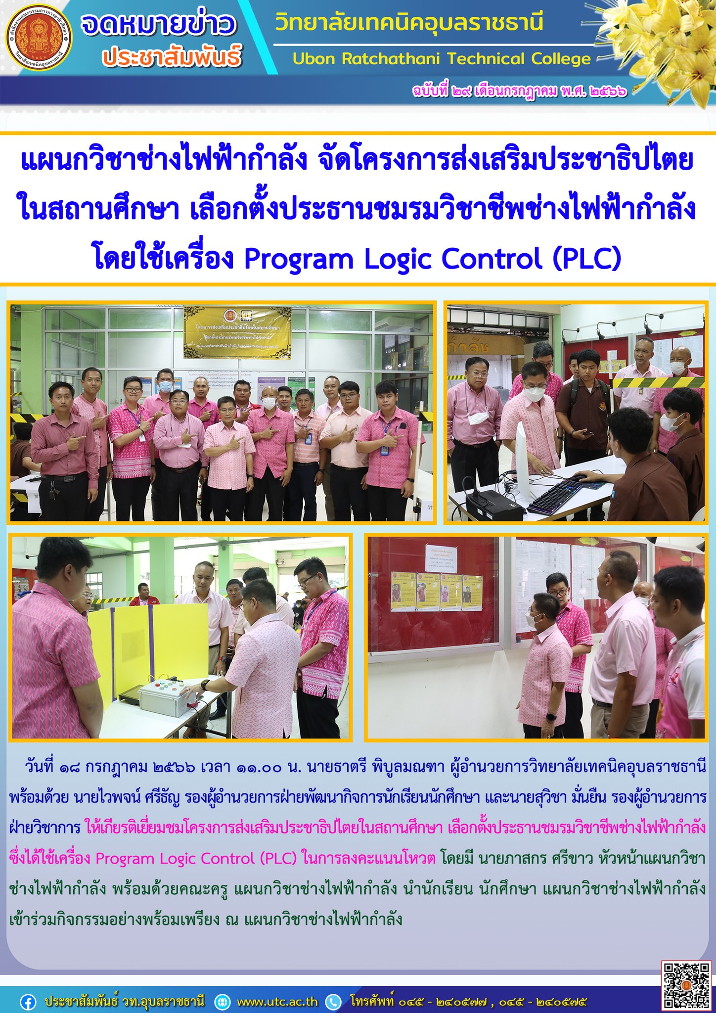 วันที่ ๑๘ กรกฎาคม ๒๕๖๖ เวลา ๑๑.๐๐ น. นายธาตรี พิบูลมณฑา ผู้อำนวยการวิทยาลัยเทคนิคอุบลราชธานี พร้อมด้วย นายไวพจน์ ศรีธัญ รองผู้อำนวยการฝ่ายพัฒนากิจการนักเรียนนักศึกษา และนายสุวิชา มั่นยืน รองผู้อำนวยการฝ่ายวิชาการ ให้เกียรติเยี่ยมชมโครงการส่งเสริมประชาธิปไตยในสถานศึกษา เลือกตั้งประธานชมรมวิชาชีพช่างไฟฟ้ากำลัง ซึ่งได้ใช้เครื่อง Program Logic Control (PLC) ในการลงคะแนนโหวต โดยมี นายภาสกร ศรีขาว หัวหน้าแผนกวิชาช่างไฟฟ้ากำลัง พร้อมด้วยคณะครู แผนกวิชาช่างไฟฟ้ากำลัง นำนักเรียน นักศึกษา แผนกวิชาช่างไฟฟ้ากำลัง เข้าร่วมกิจกรรมอย่างพร้อมเพรียง ณ แผนกวิชาช่างไฟฟ้ากำลัง