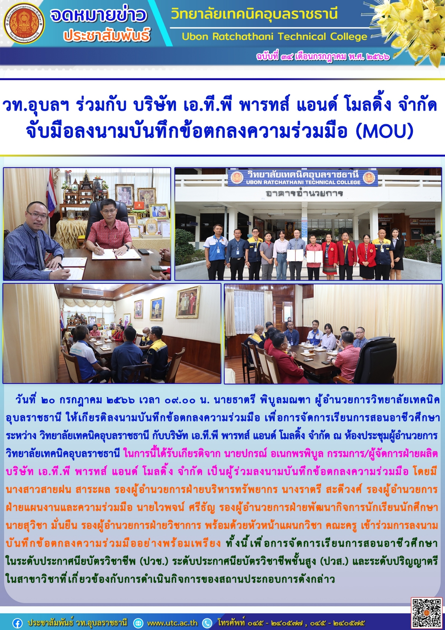 วท.อุบลฯ ร่วมกับ บริษัท เอ.ที.พี พารทส์ แอนด์ โมลดิ้ง จำกัด จับมือลงนามบันทึกข้อตกลงความร่วมมือ (MOU)