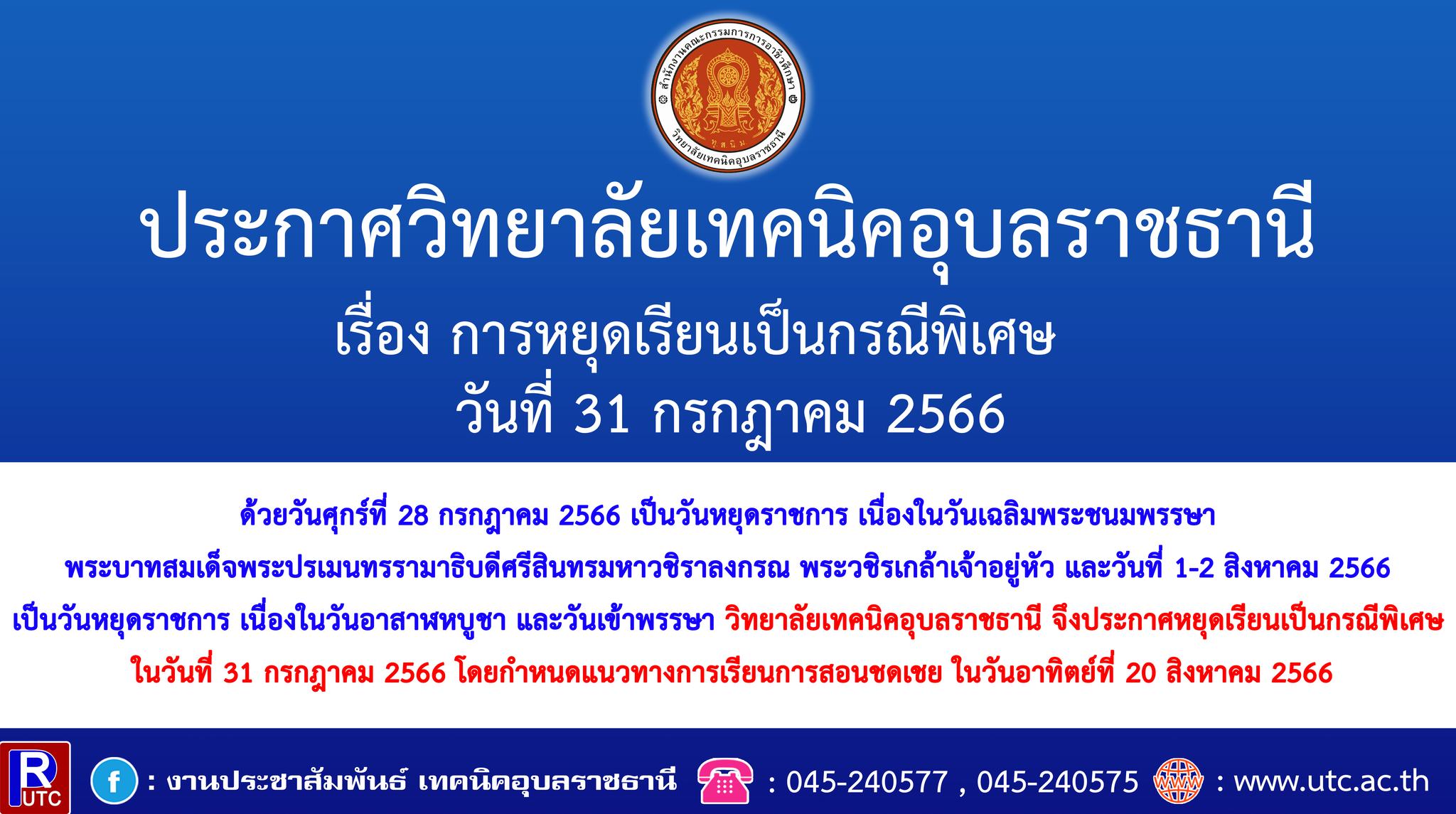 20 ก.ค. ประกาศวิทยาลัยเทคนิคอุบลราชธานี เรื่อง การหยุดเรียนเป็นกรณีพิเศษ วันที่ 31 กรกฎาคม 2566 ด้วยวันศุกร์ที่ 28 กรกฎาคม 2566 งานศูนย์ข้อมูลสารสนเทศ2023-07-20T16:58:28+00:00 By งานศูนย์ข้อมูลสารสนเทศ ข่าวประกาศ ปิดความเห็น บน ประกาศวิทยาลัยเทคนิคอุบลราชธานี เรื่อง การหยุดเรียนเป็นกรณีพิเศษ วันที่ 31 กรกฎาคม 2566 ด้วยวันศุกร์ที่ 28 กรกฎาคม 2566 FacebookTwitterLineประกาศวิทยาลัยเทคนิคอุบลราชธานี เรื่อง การหยุดเรียนเป็นกรณีพิเศษ วันที่ 31 กรกฎาคม 2566