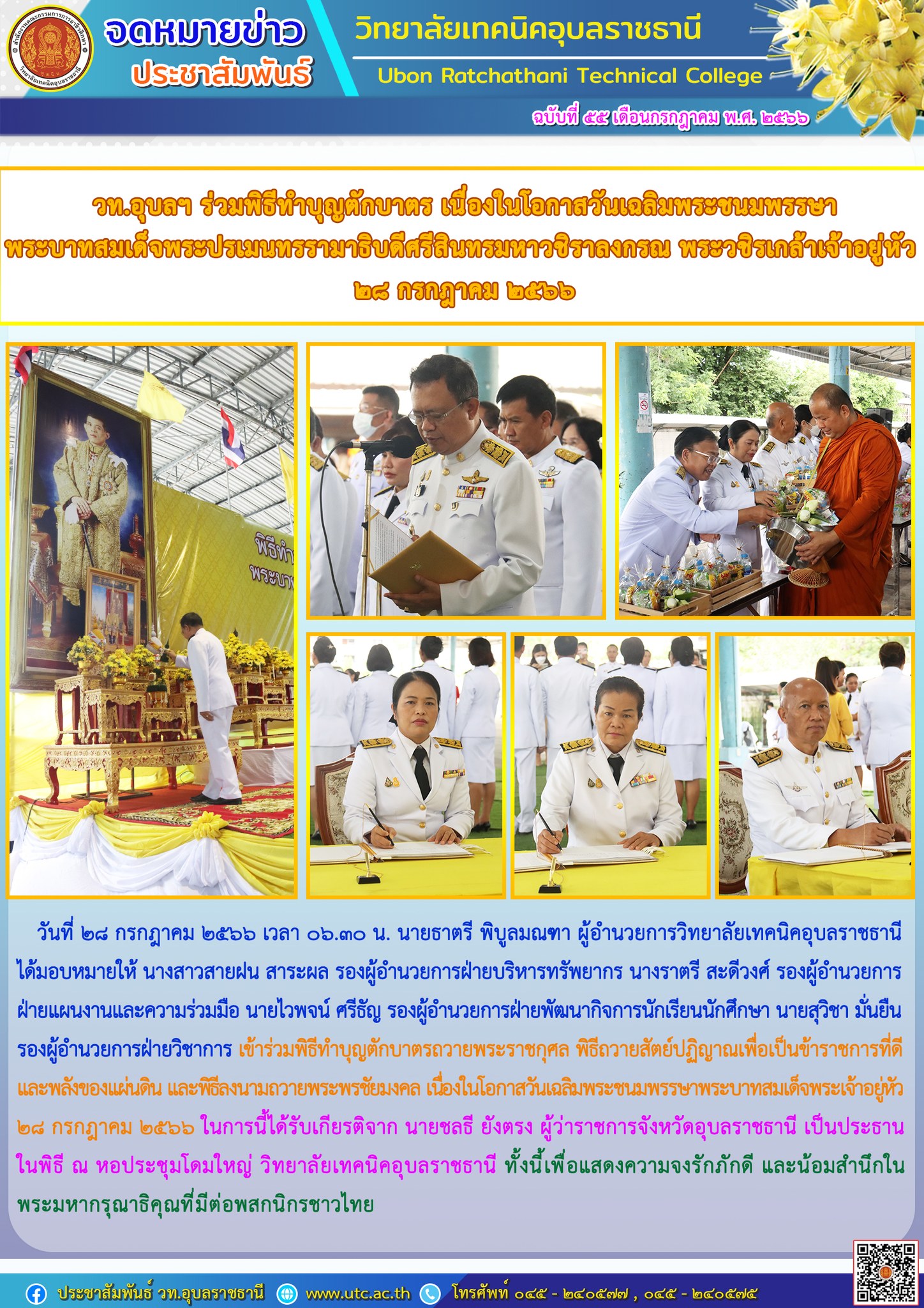 วันที่ ๒๘ กรกฎาคม ๒๕๖๖ เวลา ๐๖.๓๐ น. นายธาตรี พิบูลมณฑา ผู้อำนวยการวิทยาลัยเทคนิคอุบลราชธานี ได้มอบหมายให้ นางสาวสายฝน สาระผล รองผู้อำนวยการฝ่ายบริหารทรัพยากร นางราตรี สะดีวงศ์ รองผู้อำนวยการฝ่ายแผนงานและความร่วมมือ นายไวพจน์ ศรีธัญ รองผู้อำนวยการฝ่ายพัฒนากิจการนักเรียนนักศึกษา นายสุวิชา มั่นยืน รองผู้อำนวยการฝ่ายวิชาการ เข้าร่วมพิธีทำบุญตักบาตรถวายพระราชกุศล พิธีถวายสัตย์ปฏิญาณเพื่อเป็นข้าราชการที่ดีและพลังของแผ่นดิน และพิธีลงนามถวายพระพรชัยมงคล เนื่องในโอกาสวันเฉลิมพระชนมพรรษาพระบาทสมเด็จพระเจ้าอยู่หัว ๒๘ กรกฎาคม ๒๕๖๖ ในการนี้ได้รับเกียรติจาก นายชลธี ยังตรง ผู้ว่าราชการจังหวัดอุบลราชธานี เป็นประธานในพิธี ณ หอประชุมโดมใหญ่ วิทยาลัยเทคนิคอุบลราชธานี ทั้งนี้เพื่อแสดงความจงรักภักดี และน้อมสำนึกในพระมหากรุณาธิคุณที่มีต่อพสกนิกรชาวไทย