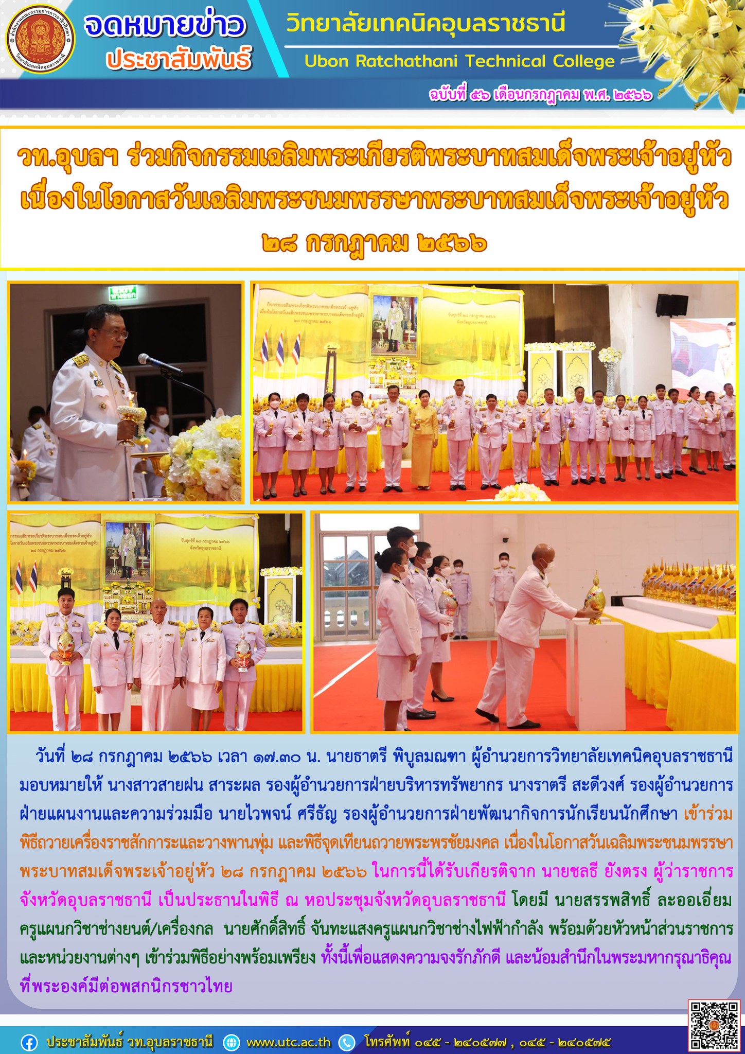 วท.อุบลฯ ร่วมกิจกรรมเฉลิมพระเกียรติพระบามสมเด็จพระเจ้าอยู่หัว เนื่องในโอกาสวันเฉลิมพระชนมพรรษาพระบาทสมเด็จพระเจ้าอยู่หัว ๒๘ กรกฎาคม ๒๕๖๖