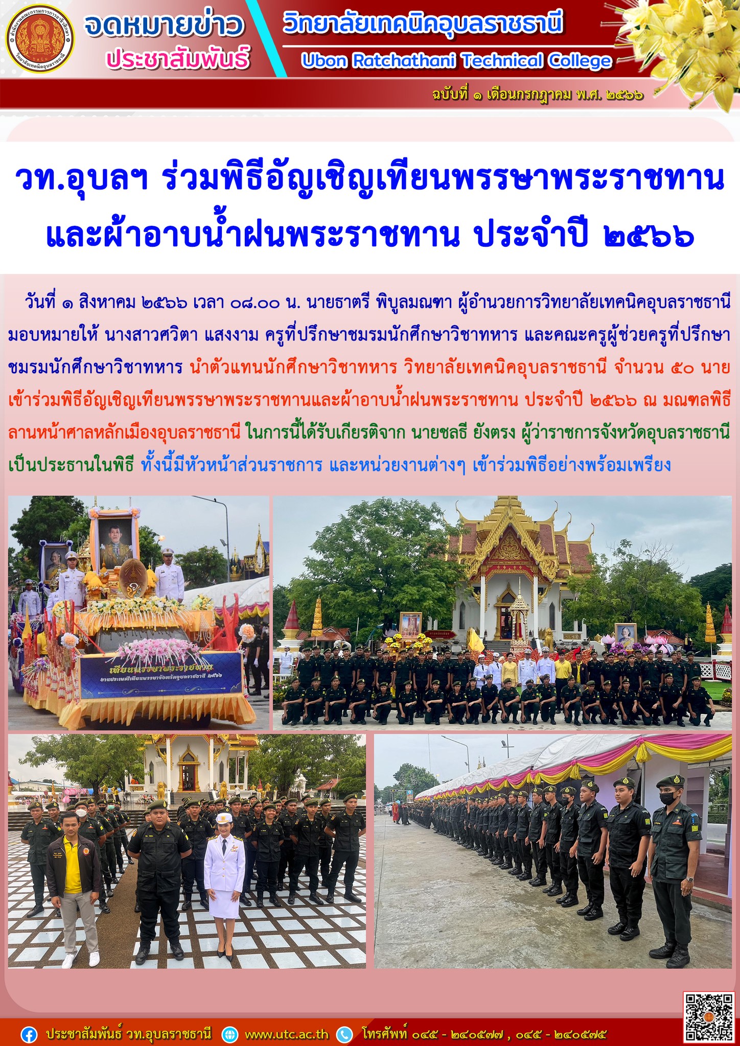 วันที่ ๑ สิงหาคม ๒๕๖๖ เวลา ๐๘.๐๐ น. นายธาตรี พิบูลมณฑา ผู้อำนวยการวิทยาลัยเทคนิคอุบลราชธานี มอบหมายให้ นางสาวศวิตา แสงงาม ครูที่ปรึกษาชมรมนักศึกษาวิชาทหาร และคณะครูผู้ช่วยครูที่ปรึกษาชมรมนักศึกษาวิชาทหาร นำตัวแทนนักศึกษาวิชาทหาร วิทยาลัยเทคนิคอุบลราชธานี จำนวน ๕๐ นาย เข้าร่วมพิธีอัญเชิญเทียนพรรษาพระราชทานและผ้าอาบน้ำฝนพระราชทาน ประจำปี ๒๕๖๖ ณ มณฑลพิธีลานหน้าศาลหลักเมืองอุบลราชธานี ในการนี้ได้รับเกียรติจาก นายชลธี ยังตรง ผู้ว่าราชการจังหวัดอุบลราชธานี เป็นประธานในพิธี ทั้งนี้มีหัวหน้าส่วนราชการ และหน่วยงานต่างๆ เข้าร่วมพิธีอย่างพร้อมเพรียง