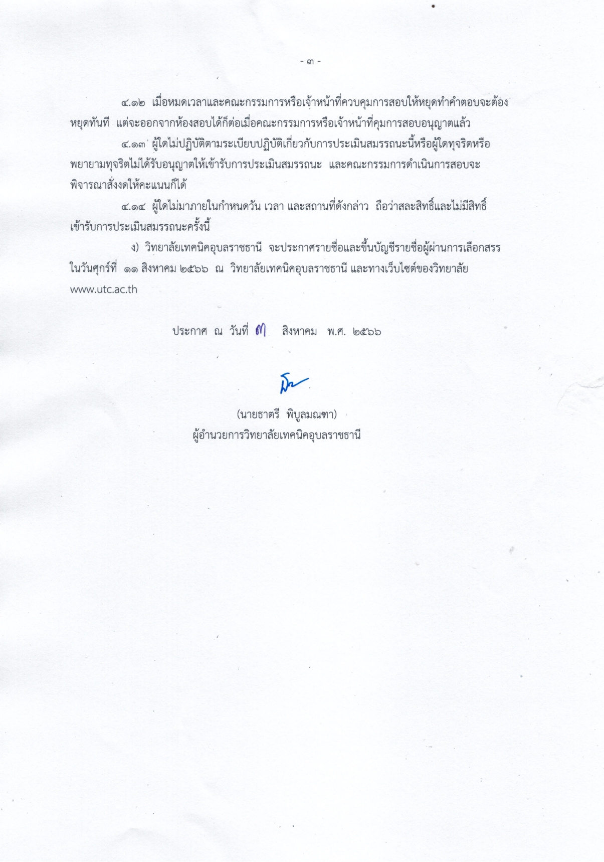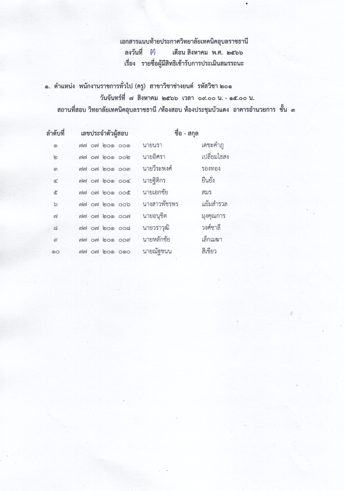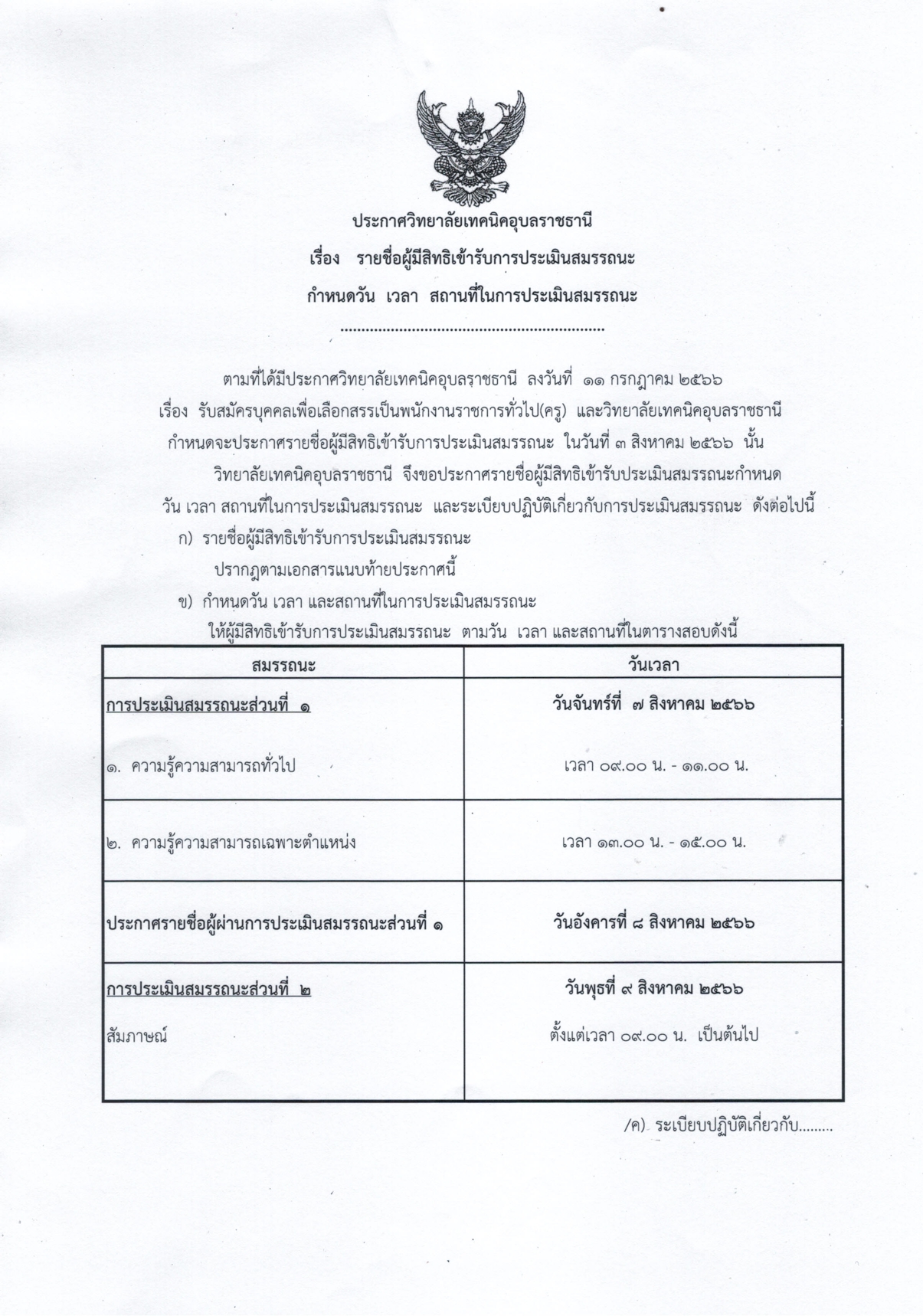 ตามที่ได้มีประกาศวิทยาลัยเทคนิคอุบลราชธานี ลงวันที่ ๑๑ กรกฎาคม ๒๕๖๖ เรื่อง รับสมัครบุคคลเพื่อเลือกสรรเป็นพนักงานราชการทั่วไป(ครู) และวิทยาลัยเทคนิคอุบลราชธานี กำหนดจะประกาศชื่อผู้มีสิทธิเข้ารับการประเมินสมรรถนะ ในวันที่ ๓ สิงหาคม ๒๕๖๖ นั้น