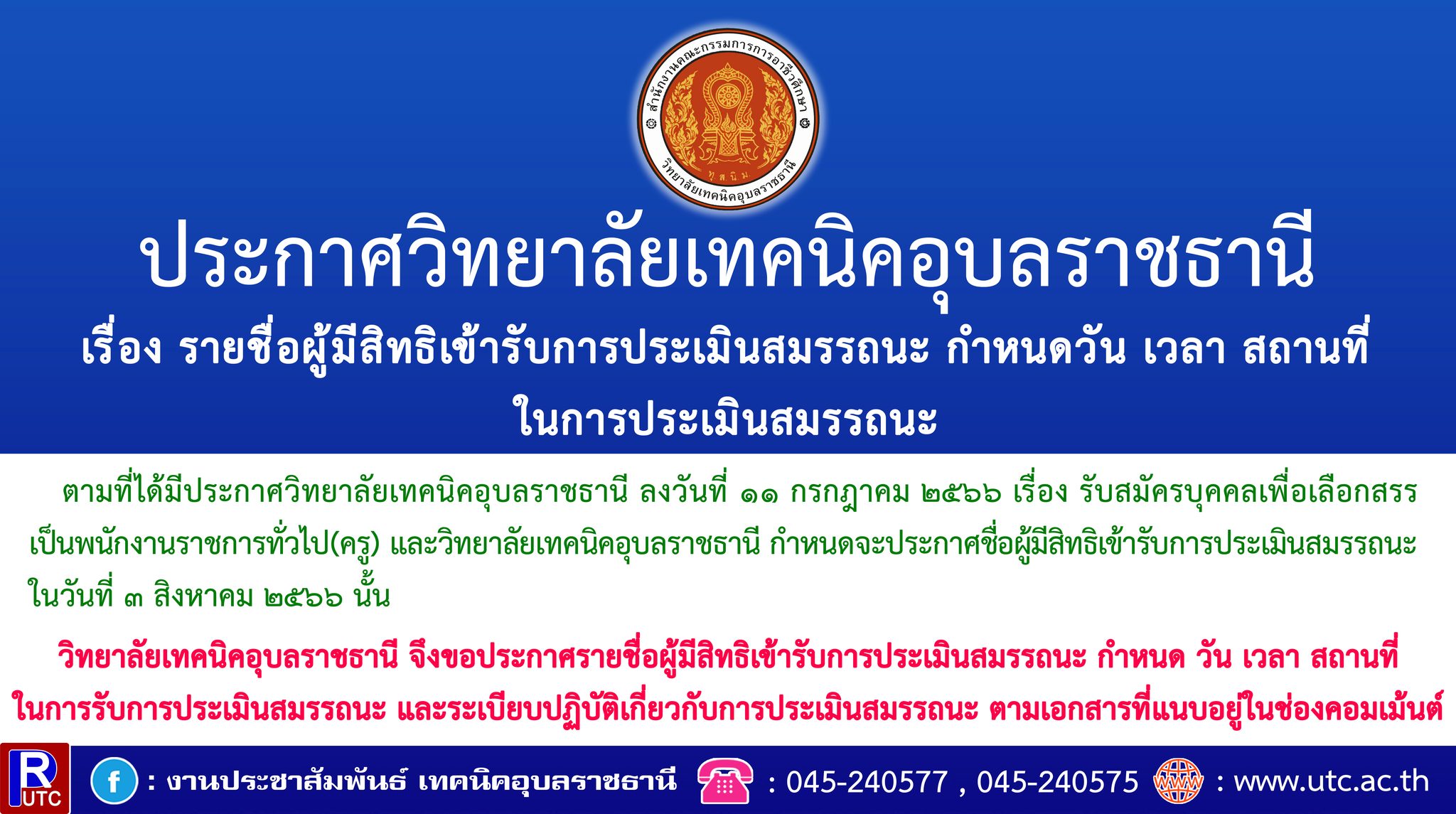 วิทยาลัยเทคนิคอุบลราชธานี จึงขอประกาศรายชื่อผู้มีสิทธิเข้ารับการประเมินสมรรถนะกำหนด วัน เวลา สถานที่ในการรับการประเมินสมรรถนะ และระเบียบปฏิบัติเกี่ยวกับการประเมินสมรรถนะ ตามเอกสารที่แนบอยู่ด้านล่าง