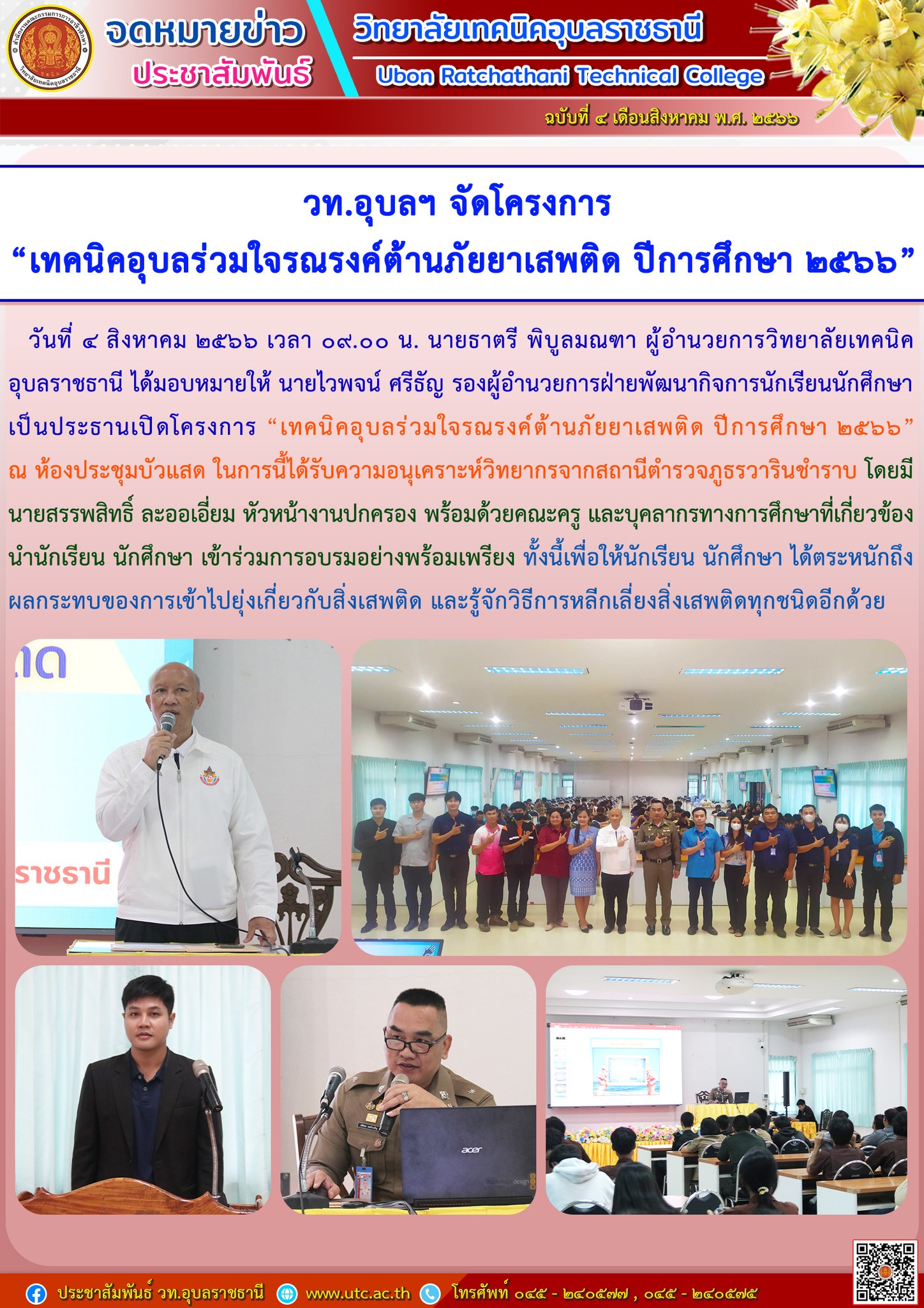 วันที่ ๔ สิงหาคม ๒๕๖๖ เวลา ๐๙.๐๐ น. นายธาตรี พิบูลมณฑา ผู้อำนวยการวิทยาลัยเทคนิคอุบลราชธานี ได้มอบหมายให้ นายไวพจน์ ศรีธัญ รองผู้อำนวยการฝ่ายพัฒนากิจการนักเรียนนักศึกษา เป็นประธานเปิดโครงการ “เทคนิคอุบลร่วมใจรณรงค์ต้านภัยยาเสพติด ปีการศึกษา ๒๕๖๖” ณ ห้องประชุมบัวแสด ในการนี้ได้รับความอนุเคราะห์วิทยากรจากสถานีตำรวจภูธรวารินชำราบ โดยมีนายสรรพสิทธิ์ ละออเอี่ยม หัวหน้างานปกครอง พร้อมด้วยคณะครู และบุคลากรทางการศึกษาที่เกี่ยวข้อง นำนักเรียน นักศึกษา เข้าร่วมการอบรมอย่างพร้อมเพรียง ทั้งนี้เพื่อให้นักเรียน นักศึกษา ได้ตระหนักถึงผลกระทบของการเข้าไปยุ่งเกี่ยวกับสิ่งเสพติด และรู้จักวิธีการหลีกเลี่ยงสิ่งเสพติดทุกชนิดอีกด้วย